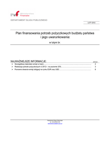 DEPARTAMENT DŁUGU PUBLICZNEGO LUTY 2012 Plan finansowania potrzeb poŜyczkowych budŜetu państwa i jego uwarunkowania: w lutym br. NAJWAśNIEJSZE INFORMACJE: (strona) Szczegółowy kalendarz emisji w lutym........................................................................................................................ 2 Realizacja potrzeb poŜyczkowych w 2012 r. na poziomie 33%…………………………………………………………………. 3 Ponowne otwarcie emisji obligacji na rynku EUR oraz USD……………………...……………………………...………………………… 8 Departament Długu Publicznego tel. +48 22 694 50 00 [email protected] PLAN PODAśY SPW W LUTYM 2012 R. k 2/8 1 Przetargi sprzedaŜy obligacji skarbowych Data przetargu Data rozliczenia Seria Planowana podaŜ (mln zł) 1 lut 2012 3 lut 2012 DS1021 1.000-3.000 9 lut 2012* 13 lut 2012 OK0114 / PS1016 3.000-6.000 16 lut 2012* 20 lut 2012 WZ0117 1.000-3.000 * przetarg we czwartek Ostateczna oferta oraz wartość podaŜy będzie ogłaszana 2 dni przed przetargiem w oparciu o aktualne warunki rynkowe i konsultacje z inwestorami. Ministerstwo Finansów moŜe oferować obligacje na przetargu uzupełniającym po średniej waŜonej cenie czystej ofert przyjętych na przetargu sprzedaŜy. 2 Przetarg sprzedaŜy bonów skarbowych Data przetargu Data rozliczenia Rodzaj bonów Data wykupu Planowana podaŜ (mln zł) 27 lut 2012 29 lut 2012 52-tyg. 27 lut 2013 1.000-2.000 3 Oferta obligacji detalicznych Nazwa obligacji Cena emisyjna Typ i wysokość oprocentowania DOS0214 100,00 zł (99,90 zł przy zamianie) Stałe, 4,75% TZ0215 99,90 zł COI0216 100,00 zł (99,90 zł przy zamianie) EDO0222 100,00 zł Zmienne (1,00 * WIBOR 6M); 5,01% w pierwszym okresie odsetkowym Zmienne (stopa inflacji + 2,50%); 5,25% w pierwszym okresie odsetkowym Zmienne (stopa inflacji + 3,00%); 6,00% w pierwszym okresie odsetkowym UWARUNKOWANIA FINANSOWANIA POTRZEB POśYCZKOWYCH W 2012 R. 3/8 Zaawansowanie finansowania potrzeb poŜyczkowych było wynikiem: - odkupu bonów w 2011 r.: 4,5 mld zł, - odkupu obligacji w 2011 r.: 0,2 mld zł, - rolowania obligacji w ramach przetargów zamiany w 2011 r.: 15,2 mld zł, - wyŜszych niŜ zakładano środków na koniec 2011 r.: 11,7 mld zł, - sprzedaŜy SPW na rynku krajowym: 18,3 mld zł, - emisji obligacji na rynkach zagranicznych: 6,5 mld zł, - ciągnienia kredytów z MIF: 1,4 mld zł. 1 Potrzeby poŜyczkowe brutto w 2012 r. Potrzeby poŜyczkowe brutto w 2012 r. Finansowanie w styczniu Razem 176,1 mld zł, w tym: Razem 57,8 mld zł (33%) wykup długu zagranicznego 15,6 wykup długu krajowego 114,3 zagraniczne potrzeby netto 46,2 19,8 38,0 krajowe 2 Przepływy w lutym środków z budŜetu na rynek z tytułu SPW oraz transferów do OFE (mld zł, stan na 31 stycznia 2012 r.) Wartość środków przekazywanych w lutym z budŜetu z tytułu wykupu i obsługi SPW oraz transferów do OFE wyniesie ok. 9,1 mld zł. 10,0 9,0 Transfery do OFE; 0,7 8,0 7,0 Brak przetargów bonów skarbowych w listopadzie....................................................................................................................... 6,0 Średnia zapadalność długu SP na poziomie zbliŜonym do najwyŜszego w historii……………………………………………………………..…….. Wykup SPW; 8,4 Polska polityka poŜyczkowa najskuteczniejsza w regionie - nagroda EuroWeek………………………………………………………………………………….. 5,0 4,0 3,0 2,0 1,0 0,0 3 SprzedaŜ i wykupy bonów w lutym 2012 r. (wg daty rozliczenia, mld zł) 5,0 Przewiduje się, Ŝe w lutym (wg daty rozliczenia) nastąpi oddłuŜenie w bonach skarbowych w przedziale od 2,6 do 3,6 mld zł. 4,0 3,0 2,0 1,0 0,0 -1,0 -2,0 -3,0 -4,0 -5,0 -6,0 1.02 8.02 15.02 wykup sprzedaŜ (dolny przedział) saldo narastająco (dolny przedział) 22.02 29.02 sprzedaŜ (górny przedział) saldo narastająco (górny przedział) 4 Stan środków złotowych i walutowych w dyspozycji MF na koniec miesiąca (środki walutowe obejmują środki z emisji długu oraz otrzymane z Komisji Europejskiej, mld zł) 60 53,0 55 53,7 54,1 50 44,3 45 40 46,3 35,5 35 30 25 Zgromadzone środki stanowią zabezpieczenie płynności w finansowaniu potrzeb poŜyczkowych. 48,7 27,4 26,5 27,9 II III IV 30,3 30,5 XII I'12 23,7 20 15 10 5 0 I'11 V VI VII VIII IX X XI UWARUNKOWANIA FINANSOWANIA POTRZEB POśYCZKOWYCH W 2012 R. 4/8 5 Zmiany długu z tytułu SPW na rynku krajowym wobec banków komercyjnych (bez transakcji BSB z MF; mld zł) 16,0 W okresie I-XII 2011 r. wobec krajowych banków komercyjnych nastąpił spadek zadłuŜenia o 20,1 mld zł wobec spadku o 15,3 mld zł w analogicznym okresie 2010 r. 12,3 12,0 7,9 6,9 8,0 3,5 4,0 4,6 3,3 2,2 0,9 2,5 0,6 0,2 0,0 -1,0 -1,3 -1,8 -4,0 -4,7 -5,5 -8,0 -6,2 -9,1 -10,0 -12,0 I'10 II III IV V VI VII VIII IX X XI -6,7 -7,7 -8,4 -8,0 XII I'11 II III IV -10,0 V VI VII VIII IX X XI XII 6 Zmiany długu z tytułu SPW na rynku krajowym wobec funduszy emerytalnych (mld zł) 7,0 5,0 3,0 2,1 2,6 2,0 2,0 2,3 1,5 1,8 1,6 1,2 0,9 0,4 1,0 -1,0 W okresie I-XII 2011 r. wobec funduszy emerytalnych nastąpił przyrost zadłuŜenia o 4,5 mld zł wobec wzrostu o 7,1 mld zł w analogicznym okresie 2010 r. 3,9 4,0 3,7 -0,7 -0,6 -1,3 -3,0 -1,1 -1,2 -1,5 -2,1 -2,4 -2,8 -5,0 -4,9 -7,0 I'10 II III IV V VI VII VIII IX X XI XII I'11 II III IV V VI VII VIII IX X XI XII 7 Zmiany długu z tytułu SPW na rynku krajowym wobec zakładów ubezpieczeniowych (mld zł) 3,0 2,7 W okresie I-XII 2011 r. wobec zakładów ubezpieczeniowych nastąpił spadek zadłuŜenia o 4,4 mld zł wobec wzrostu o 4,3 mld zł w analogicznym okresie 2010 r. 1,7 2,0 1,3 1,0 0,4 0,3 0,4 0,5 0,7 0,6 0,2 0,0 0,6 0,0 0,0 -0,1 -0,6 -1,0 -0,4 -0,6 -0,5 -0,7 -0,5 -1,0 -1,1 -1,5 -2,0 ZAAWANSOWANIE FINANSOWNIA POTRZEB POśYCZKOWYCH W 2010 ROKU (wg stanu -2,5 na 28.02.2010 r.) -3,0 I'10 II III IV V VI VII VIII IX X XI XII I'11 II III IV V VI VII VIII IX X XI XII 