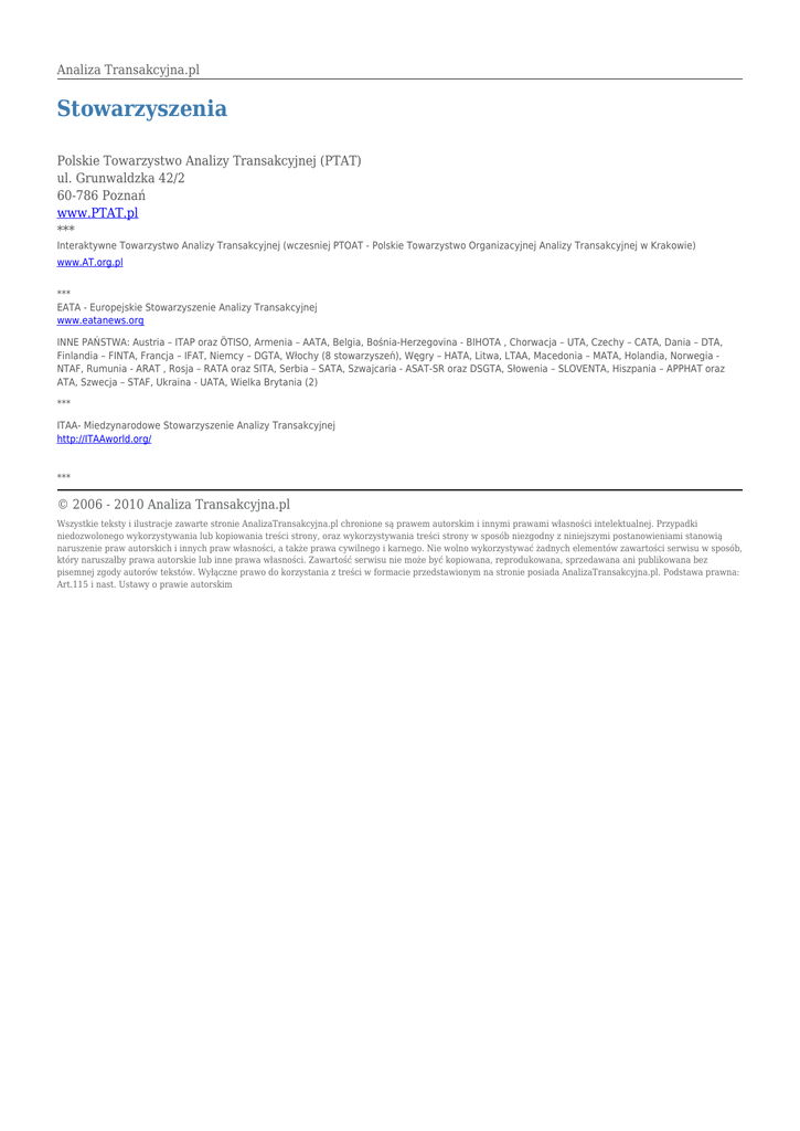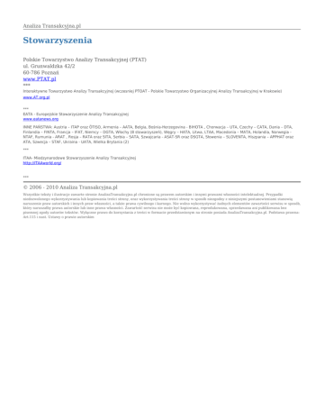 Analiza Transakcyjna.pl Stowarzyszenia Polskie Towarzystwo Analizy Transakcyjnej (PTAT) ul. Grunwaldzka 42/2 60-786 Poznań www.PTAT.pl *** Interaktywne Towarzystwo Analizy Transakcyjnej (wczesniej PTOAT - Polskie Towarzystwo Organizacyjnej Analizy Transakcyjnej w Krakowie) www.AT.org.pl *** EATA - Europejskie Stowarzyszenie Analizy Transakcyjnej www.eatanews.org INNE PAŃSTWA: Austria – ITAP oraz ÖTISO, Armenia – AATA, Belgia, Bośnia-Herzegovina - BIHOTA , Chorwacja – UTA, Czechy – CATA, Dania – DTA, Finlandia – FINTA, Francja – IFAT, Niemcy – DGTA, Włochy (8 stowarzyszeń), Węgry – HATA, Litwa, LTAA, Macedonia – MATA, Holandia, Norwegia NTAF, Rumunia - ARAT , Rosja – RATA oraz SITA, Serbia – SATA, Szwajcaria - ASAT-SR oraz DSGTA, Słowenia – SLOVENTA, Hiszpania – APPHAT oraz ATA, Szwecja – STAF, Ukraina - UATA, Wielka Brytania (2) *** ITAA- Miedzynarodowe Stowarzyszenie Analizy Transakcyjnej http://ITAAworld.org/ *** © 2006 - 2010 Analiza Transakcyjna.pl Wszystkie teksty i ilustracje zawarte stronie AnalizaTransakcyjna.pl chronione są prawem autorskim i innymi prawami własności intelektualnej. Przypadki niedozwolonego wykorzystywania lub kopiowania treści strony, oraz wykorzystywania treści strony w sposób niezgodny z niniejszymi postanowieniami stanowią naruszenie praw autorskich i innych praw własności, a także prawa cywilnego i karnego. Nie wolno wykorzystywać żadnych elementów zawartości serwisu w sposób, który naruszałby prawa autorskie lub inne prawa własności. Zawartość serwisu nie może być kopiowana, reprodukowana, sprzedawana ani publikowana bez pisemnej zgody autorów tekstów. Wyłączne prawo do korzystania z treści w formacie przedstawionym na stronie posiada AnalizaTransakcyjna.pl. Podstawa prawna: Art.115 i nast. Ustawy o prawie autorskim