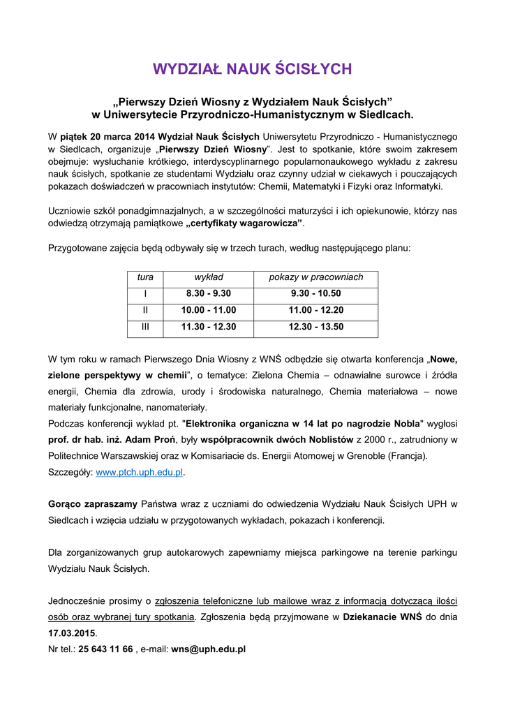 WYDZIAŁ NAUK ŚCISŁYCH „Pierwszy Dzień Wiosny z Wydziałem Nauk Ścisłych” w Uniwersytecie Przyrodniczo-Humanistycznym w Siedlcach. W piątek 20 marca 2014 Wydział Nauk Ścisłych Uniwersytetu Przyrodniczo - Humanistycznego w Siedlcach, organizuje „Pierwszy Dzień Wiosny”. Jest to spotkanie, które swoim zakresem obejmuje: wysłuchanie krótkiego, interdyscyplinarnego popularnonaukowego wykładu z zakresu nauk ścisłych, spotkanie ze studentami Wydziału oraz czynny udział w ciekawych i pouczających pokazach doświadczeń w pracowniach instytutów: Chemii, Matematyki i Fizyki oraz Informatyki. Uczniowie szkół ponadgimnazjalnych, a w szczególności maturzyści i ich opiekunowie, którzy nas odwiedzą otrzymają pamiątkowe „certyfikaty wagarowicza”. Przygotowane zajęcia będą odbywały się w trzech turach, według następującego planu: tura wykład pokazy w pracowniach I 8.30 - 9.30 9.30 - 10.50 II 10.00 - 11.00 11.00 - 12.20 III 11.30 - 12.30 12.30 - 13.50 W tym roku w ramach Pierwszego Dnia Wiosny z WNŚ odbędzie się otwarta konferencja „Nowe, zielone perspektywy w chemii”, o tematyce: Zielona Chemia – odnawialne surowce i źródła energii, Chemia dla zdrowia, urody i środowiska naturalnego, Chemia materiałowa – nowe materiały funkcjonalne, nanomateriały. Podczas konferencji wykład pt. "Elektronika organiczna w 14 lat po nagrodzie Nobla" wygłosi prof. dr hab. inż. Adam Proń, były współpracownik dwóch Noblistów z 2000 r., zatrudniony w Politechnice Warszawskiej oraz w Komisariacie ds. Energii Atomowej w Grenoble (Francja). Szczegóły: www.ptch.uph.edu.pl. Gorąco zapraszamy Państwa wraz z uczniami do odwiedzenia Wydziału Nauk Ścisłych UPH w Siedlcach i wzięcia udziału w przygotowanych wykładach, pokazach i konferencji. Dla zorganizowanych grup autokarowych zapewniamy miejsca parkingowe na terenie parkingu Wydziału Nauk Ścisłych. Jednocześnie prosimy o zgłoszenia telefoniczne lub mailowe wraz z informacją dotyczącą ilości osób oraz wybranej tury spotkania. Zgłoszenia będą przyjmowane w Dziekanacie WNŚ do dnia 17.03.2015. Nr tel.: 25 643 11 66 , e-mail: [email protected]