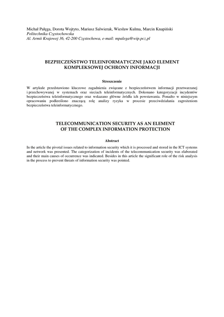 Michał Pałęga, Dorota Wojtyto, Mariusz Salwierak, Wiesław Kulma, Marcin Knapiński Politechnika Częstochowska Al. Armii Krajowej 36, 42-200 Częstochowa, e-mail: [email protected] BEZPIECZEŃSTWO TELEINFORMATYCZNE JAKO ELEMENT KOMPLEKSOWEJ OCHRONY INFORMACJI Streszczenie W artykule przedstawiono kluczowe zagadnienia związane z bezpieczeństwem informacji przetwarzanej i przechowywanej w systemach oraz sieciach teleinformatycznych. Dokonano kategoryzacji incydentów bezpieczeństwa teleinformatycznego oraz wskazano główne źródła ich powstawania. Ponadto w niniejszym opracowaniu podkreślono znaczącą rolę analizy ryzyka w procesie przeciwdziałania zagrożeniom bezpieczeństwa teleinformatycznego. TELECOMMUNICATION SECURITY AS AN ELEMENT OF THE COMPLEX INFORMATION PROTECTION Abstract In the article the pivotal issues related to information security which it is processed and stored in the ICT systems and network was presented. The categorization of incidents of the telecommunication security was elaborated and their main causes of occurrence was indicated. Besides in this article the significant role of the risk analysis in the process to prevent threats of information security was pointed.