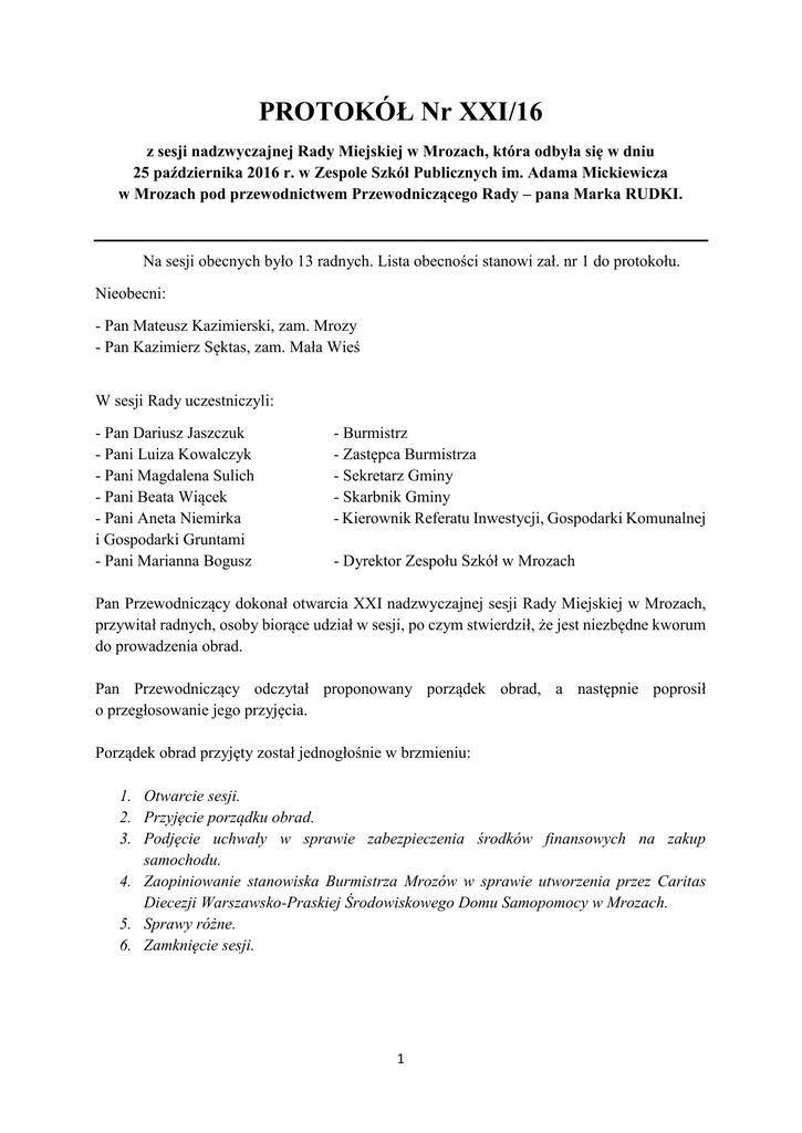 PROTOKÓŁ Nr XXI/16 z sesji nadzwyczajnej Rady Miejskiej w Mrozach, która odbyła się w dniu 25 października 2016 r. w Zespole Szkół Publicznych im. Adama Mickiewicza w Mrozach pod przewodnictwem Przewodniczącego Rady – pana Marka RUDKI. Na sesji obecnych było 13 radnych. Lista obecności stanowi zał. nr 1 do protokołu. Nieobecni: - Pan Mateusz Kazimierski, zam. Mrozy - Pan Kazimierz Sęktas, zam. Mała Wieś W sesji Rady uczestniczyli: - Pan Dariusz Jaszczuk - Pani Luiza Kowalczyk - Pani Magdalena Sulich - Pani Beata Wiącek - Pani Aneta Niemirka i Gospodarki Gruntami - Pani Marianna Bogusz - Burmistrz - Zastępca Burmistrza - Sekretarz Gminy - Skarbnik Gminy - Kierownik Referatu Inwestycji, Gospodarki Komunalnej - Dyrektor Zespołu Szkół w Mrozach Pan Przewodniczący dokonał otwarcia XXI nadzwyczajnej sesji Rady Miejskiej w Mrozach, przywitał radnych, osoby biorące udział w sesji, po czym stwierdził, że jest niezbędne kworum do prowadzenia obrad. Pan Przewodniczący odczytał proponowany porządek obrad, a następnie poprosił o przegłosowanie jego przyjęcia. Porządek obrad przyjęty został jednogłośnie w brzmieniu: 1. Otwarcie sesji. 2. Przyjęcie porządku obrad. 3. Podjęcie uchwały w sprawie zabezpieczenia środków finansowych na zakup samochodu. 4. Zaopiniowanie stanowiska Burmistrza Mrozów w sprawie utworzenia przez Caritas Diecezji Warszawsko-Praskiej Środowiskowego Domu Samopomocy w Mrozach. 5. Sprawy różne. 6. Zamknięcie sesji. 1 Pkt 3 Pan Burmistrz zaproponował, aby omówić obydwie sprawy, dokonać oględzin, a następnie podjąć decyzję. W dniu wczorajszym uczestniczył w wyjeździe do producenta autobusów. Firma wystawiła 4 pojazdy na aukcję, a w dniu wczorajszym był już tylko jeden. Właściciel firmy wykazał się dużą otwartością, jeśli chodzi o sprzedaż gminie pojazdu. Z uwagi na odległość zapadła decyzja o zabraniu pojazdu. Powstały nowe potrzeby w zakresie dowożenia uczniów. Jest zapotrzebowanie z rejonu Latowicza i Siennicy. Gdyby był lepszy transport, byliby chętni do odbywania nauki w naszej szkole. Dotychczasowy bus jest w bardzo dobrym stanie. Z chwilą zakupu nowego, byłby ewentualnie przekazany do Zakładu Gospodarki Komunalnej. Uruchomiony zostałby kurs przez Cegłów, Łękawicę, Siennicę, Latowicz i Wielgolas, aby można było dowieźć uczniów z tamtego terenu. Każdy uczeń to dodatkowe pieniądze. Nie planuje zbycia obecnego pojazdu. Mały bus obsługiwałby Rudkę i Gójszcz. Będzie to jeszcze przedmiotem analizy. Pan Podgórski twierdził wcześniej, że przydałby się lepszy sprzęt dla Zakładu Gospodarki Komunalnej. Byłaby to realizacja tego wniosku. W nowym, samochodzie marki Mercedes z 2008 roku środek jest w 100% nowy, a silnik po regeneracji. Miał 760 tys. km przebiegu w momencie zakupu go przez firmę. Firma nie kupuje samochodów powypadkowych. Uważa, że jest to idealna oferta, jeśli chodzi o nasze potrzeby. Za cenę nowego (około 450 tys. zł) można ten odnowić 4 razy (co 10 lat). Jednocześnie zakupiony zostałby komplet kół zimowych w ilości 6 sztuk za kwotę około 5 tys. zł. Na samochód jest 12. Miesięczna gwarancja. Jeśli pojawi się jakiś problem z silnikiem, nastąpi jego wymiana za kwotę 5 tys. zł. Zakład zatrudnia 70 pracowników. Jakość wykonanych prac ocenia pozytywnie. Zakup musimy wpisać do budżetu 2017 roku Pkt 4 Pan Burmistrz poinformował, że wpłynęło pismo od dyrektora Caritas Diecezji WarszawskoPraskiej z zapytaniem, czy na terenie Mrozów nie byłoby lokalu na urządzenie warsztatów terapii zajęciowej dla osób niepełnosprawnych. Takie ośrodki funkcjonują już na terenie Mińska Mazowieckiego przy ul. Kościelnej i Sosnkowskiego. Osoby te byłyby tutaj przywożone rano i odwożone po odbyciu zajęć. Byłaby to pierwsza placówka tego typu poza Mińskiem Mazowieckim. Służyłaby w miarę wolnych miejsc także dla mieszkańców sąsiednich gmin: Kałuszyn, Latowicz i ewentualnie Cegłów. Rozmawiał z ks. Dyrektorem odnośnie potrzeb dla gminy Mrozy. Byłoby to około 30 osób. Z analiz wynika, że potrzebna byłaby powierzchnia 240 m2. Jedynym miejscem nadającym się do tego na terenie Mrozów są pomieszczenia znajdujące się na piętrze internatu. Jest tam już urządzona część hotelowa na 15 miejsc przy łączniku. Jesteśmy w stanie urządzić około 35 miejsc noclegowych łącznie. Można byłoby więcej, ale dzisiaj aż takich potrzeb nie ma. Caritas chciałby pozyskać pomieszczenia na 10 najbliższych lat. Według pozyskanych informacji mają być rozebrane dwie ścianki działowe. Kosztorys prac opiewa na 700 tys. zł wraz z windą dla niepełnosprawnych. Budynek ma jeszcze wiele potrzeb. Pomieszczenie stołówki nie było remontowane od 15 lat. Za niezbędne uważa podjęcie na terenie gminy jakichś działań na rzecz osób niepełnosprawnych. Gdyby nie propozycja ze strony Caritas, musielibyśmy wyasygnować na ten cel środki z własnego budżetu. Nie będziemy pobierać czynszu, a umowa powinna zostać 2 zawarta, na co najmniej 5 lat. Według jego oceny bezpieczny jest nawet 10 letni okres. Nie wiadomo jeszcze, w jakim kierunku pójdzie reforma oświaty. - Pani Zastępca Burmistrza odczytała pismo Caritas Diecezji Warszawsko-Praskiej w powyższej sprawie. - Pan Przewodniczący – czy Caritas spodziewa się, że będziemy świadczyć dowozy? - Pan Burmistrz – poinformował, że nie. Podczas rozmowy z ks. Dyrektorem Caritas poprosił o skierowanie pisma do Urzędu, które mógłby odczytać na posiedzeniu. Mieli opisać w nim charakter działalności. Gdybyśmy chcieli otrzymywać czynsz w wysokości 1 tys. zł to też pewnie znalazłyby się środki. Caritas pokryje pełne koszty funkcjonowania. Nie jest to działalność komercyjna. Aby udostępnić obiekty mienia publicznego trzeba wykazać, że działalność będzie realizowała zadania własne gminy. Oprócz umowy użyczenia musi być umowa (porozumie