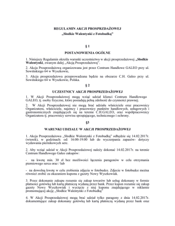 REGULAMIN AKCJI PROSPRZDAŻOWEJ ,,Słodkie Walentynki z Fotobudką” §1 POSTANOWIENIA OGÓLNE 1. Niniejszy Regulamin określa warunki uczestnictwa w akcji prosprzedażowej ,,Słodkie Walentynki, zwanym dalej „Akcją Prosprzedażową”. 2. Akcja Prosprzedażową organizowana jest przez Centrum Handlowe GALEO przy ul. Sowińskiego 64 w Wyszkowie, 3. Akcja prosprzedażowa przeprowadzana będzie na obszarze C.H. Galeo przy ul. Sowińskiego 64 w Wyszkowie, Polska. §2 UCZESTNICY AKCJI PROSPRZEDAŻOWEJ 1. W Akcji Prosprzedażowej mogą wziąć udział klienci Centrum Handlowego GALEO, tj. osoby fizyczne, które posiadają pełną zdolność do czynności prawnej. 2. W Akcji Prosprzedażowej nie mogą brać udziału właściciele oraz pracownicy Organizatora, właściciele, najemcy i pracownicy punktów handlowych, usługowych i gastronomicznych znajdujących się na terenie C.H.GALEO, oraz współpracownicy Organizatora tj. pracownicy serwisu sprzątającego, technicznego i ochrony. §3 WARUNKI UDZIAŁU W AKCJI PROSPRZEDAŻOWEJ 1. Akcja Prosprzedażowa ,,Słodkie Walentynki z Fotobudką” odbędzie się 14.02.2017r. (wtorek), w godzinach: od: 16:00-19:00 lub do wyczerpania zapasów- dotyczy wydawania piernikowych serc. 2. Aby wziąć udział w Akcji Prosprzedażowej należy dokonać 14.02.2017r. na terenie Centrum Handlowego Galeo zakupów: - na kwotę min. 30 zł bez możliwości łączenia paragonów w celu otrzymania pierniowego serca oraz / lub - na dowolną kwotę w celu zrobienia zdjęcia w fotobudce. Zdjecie w fotobudce można również zrobić za okazaniem kuponu z gazety Nowy Wyszkowiak. 3. Przez dokonanie zakupu rozumie się zakup towarów lub usług dokonany w formie płatności gotówką lub kartą płatniczą wydaną przez bank. Przez kupon rozumie się zakup gazety Nowy Wyszkowiak i wycięcie z niej kuponu znajdującego w reklamie promomującej akcję ,,Słodkie Walentynki z Fotobudką” 4. W Akcji Prosprzedażowej mogą brać udział tylko paragony z dnia 14.02.2017r. dokumentujące zakup dokonany gotówką lub kartą płatniczą wydaną przez bank oraz kupony z wydania gazety Nowy Wyszkowiak w dniu 14.02.2017r. 5. W Akcji Prosprzedażowej nie mogą brać udziału paragony dokumentujące zakup dokonany kartą podarunkową lub bonem podarunkowym. 6. Paragony podlegają zgłoszeniu w wyznaczonym na terenie Centrum Handlowego Galeo w Punkcie Wydawania Nagród („Punkt”), który czynny jest 14.02.2017r., w godz. 16:00-19:00 lub do wyczerpania zapasów, nie dłużej niż do 20:00. 7. Punkt zlokalizowany będzie na pasażu I piętra Centrum Handlowego Galeo. 8. Przedstawione przez Uczestników paragony zostaną opieczętowane. 9. Podczas trwania Akcji Prosprzedażowej zostanie rozdanych 500 szt. serc z piernikowego ciasta oraz / lub zostaną zrobione zdjęcia w fotobudce . 10. Na każdy paragon na kwotę min. 30zł może być wydane 1 piernikowe serce. Na każdy paragon na dowolną kwotę lub kupon z Nowego Wyszkowiaka może być zrobione 1 zdjęcie w 3 pozycjach. 11. Przy odbiorze piernikowego serca oraz przed wykonaniem zdjęcia w fotobudce Uczestnik zobowiązuje się do wypełnienia Oświadczenia. Treść Oświadczenia stanowi Załącznik nr 1 do niniejszego Regulaminu. §4 PRZETWARZANIE DANYCH OSOBOWYCH 1. Administratorem danych osobowych udostępnianych przez Uczestników Akcji Prosprzedażowej jest Organizator. 2. Udostępnione dane i/lub zdjęciabędą przetwarzane wyłącznie na potrzeby organizacji Akcji Prosprzedażowej. 3. Podanie danych osobowych ma charakter dobrowolny, ale w odniesieniu do uczestnictwa w Akcji Prosprzedażowej niezbędny do przystąpienia przez Uczestnika do Akcji Prosprzedażowej. 4. Osobom udostępniającym dane przysługuje prawo dostępu do tych danych oraz ich poprawienia. 5. Dane oraz zdjęcia Uczestników Akcji Prosprzedażowej mogą zostać udostępnione właściwym organom administracji publicznej, w przypadkach określonych powszechnie obowiązującymi przepisami prawa. §5 POSTANOWIENIA KOŃCOWE 1. Akcja Prosprzedażowa odbędzie się 14.02.2017r. 2. W kwestiach nieuregulowanych niniejszym Regulaminem stosuje się przepisy Kodeksu cywilnego oraz ustawy z dnia 26 lipca 1991 r. o podatku dochodowym od osób fizycznych (Dz. U. z 2000 r., Nr 14, poz. 176 z późn. zm.) oraz innych powszechnie obowiązujących przepisów prawa. 3. Niniejszy Regulamin Akcji Prosprzedażowej dostępny jest dla Uczestników na stronie internetowej www.galeowyszkow.pl oraz w siedzibie Organizatora. 4. Niniejszy regulamin może zostać zmieniony w trakcie trwania Akcji Prosprzedażowej z istotnych przyczyn organizacyjnych i prawnych – zmiany te nie będą miały jednak wpływu na już nabyte uprawnienia uczestników Akcji Prosprzedażowej. Załącznik nr 1 OŚWIADCZENIE UCZESTNIKA AKCJI PROSPRZEDAŻOWEJ „Słodkie Walentynki z fotobudką”, 14.02.2017r. Ja, niżej podpisany(a): Imię i nazwisko: ……………………………………………………………………………………………... Nr telefonu: ……………………………………………………………………………………………… Adres e-mail: …………………………………………………………………………………….……...... potwierdzam odbiór nagrody. ⸋ Wyrażam dobrowolnie zgodę na umieszczenie moich danych osobowych w bazie danych Organizatora oraz na ich przetwarzanie przez Organizatora dla celów przeprowadzenia Akcji Prosprzedażowej, zgodnie z Ustawą z dnia 29 sierpnia 1997 r. o ochronie danych osobowych . Zostałem(am) poinformowany(a) o prawie wglądu do swoich danych osobowych oraz ich poprawiania i żądania ich usunięcia. ⸋ Wyrażam dobrowolnie zgodę na publikację mojego wizerunku dla celów przeprowadzenia Akcji Prosprzedażowej ⸋ Oświadczam, że wyrażam zgodę na otrzymywanie, na wskazany powyżej adres poczty elektronicznej, informacji handlowych wysyłanych przez Galeria Galena Sp. z o.o. w imieniu własnym 