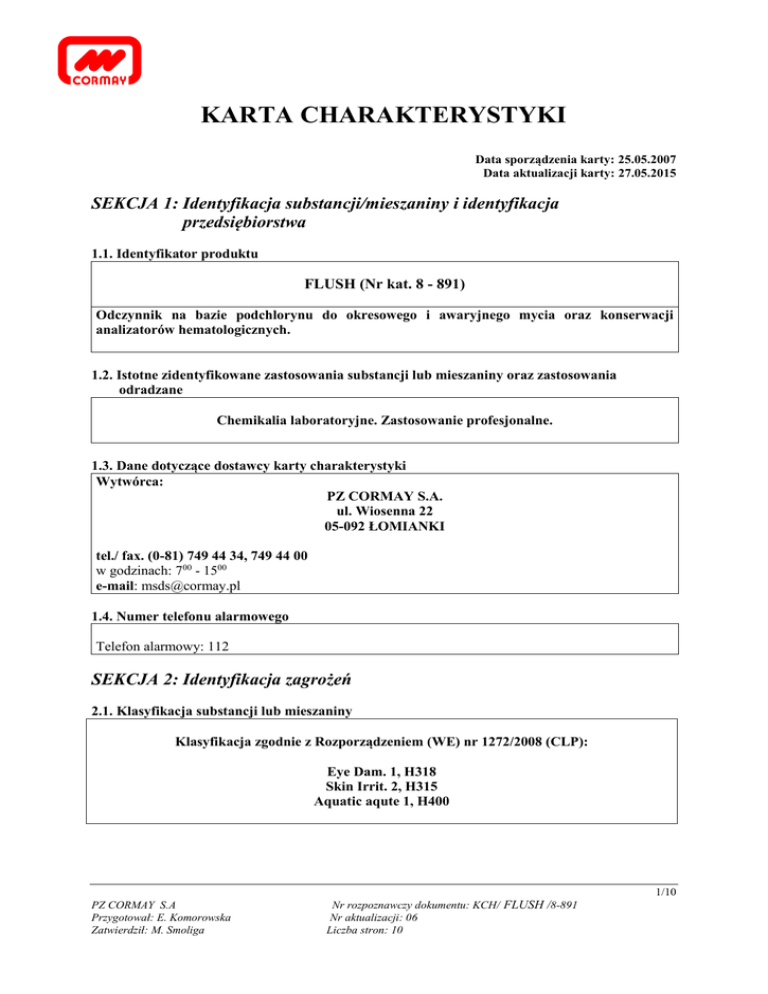 KARTA CHARAKTERYSTYKI Data sporządzenia karty: 25.05.2007 Data aktualizacji karty: 27.05.2015 SEKCJA 1: Identyfikacja substancji/mieszaniny i identyfikacja przedsiębiorstwa 1.1. Identyfikator produktu FLUSH (Nr kat. 8 - 891) Odczynnik na bazie podchlorynu do okresowego i awaryjnego mycia oraz konserwacji analizatorów hematologicznych. 1.2. Istotne zidentyfikowane zastosowania substancji lub mieszaniny oraz zastosowania odradzane Chemikalia laboratoryjne. Zastosowanie profesjonalne. 1.3. Dane dotyczące dostawcy karty charakterystyki Wytwórca: PZ CORMAY S.A. ul. Wiosenna 22 05-092 ŁOMIANKI tel./ fax. (0-81) 749 44 34, 749 44 00 w godzinach: 700 - 1500 e-mail: [email protected] 1.4. Numer telefonu alarmowego Telefon alarmowy: 112 SEKCJA 2: Identyfikacja zagrożeń 2.1. Klasyfikacja substancji lub mieszaniny Klasyfikacja zgodnie z Rozporządzeniem (WE) nr 1272/2008 (CLP): Eye Dam. 1, H318 Skin Irrit. 2, H315 Aquatic aqute 1, H400 1/10 PZ CORMAY S.A Przygotował: E. Komorowska Zatwierdził: M. Smoliga Nr rozpoznawczy dokumentu: KCH/ FLUSH /8-891 Nr aktualizacji: 06 Liczba stron: 10 2.2. Elementy oznakowania Oznakowanie zgodnie z Rozporządzeniem (WE) nr 1272/2008 (CLP): Zawiera podchloryn sodu. Hasło ostrzegawcze: Niebezpieczeństwo Zwroty wskazujące rodzaj zagrożenia: H318 - Powoduje poważne uszkodzenie oczu. H315 Działa drażniąco na skórę. H400 - Działa bardzo toksycznie na organizmy wodne. Zwroty wskazujące środki ostrożności: P280 Stosować rękawice ochronne/odzież ochronną/ochronę oczu/ochronę twarzy. P305+P351+P338 W PRZYPADKU DOSTANIA SIĘ DO OCZU: Ostrożnie płukać wodą przez kilka minut. Wyjąć soczewki kontaktowe, jeżeli są i można je łatwo usunąć. Nadal płukać. P310 - Natychmiast skontaktować się z OŚRODKIEM ZATRUĆ lub lekarzem. P302+P352 W PRZYPADKU KONTAKTU ZE SKÓRĄ: Umyć dużą ilością wody z mydłem. P273 Unikać uwolnienia do środowiska. P391 Zebrać wyciek. 2.3. Inne zagrożenia Mieszanina nie spełnia kryteriów PBT lub vPvB. SEKCJA 3: Skład/informacja o składnikach 3.1. Substancje Nie dotyczy. 3.2. Mieszaniny podchloryn sodu Numer CAS: 7681-52-9 Numer WE: 231-668-3 Numer Indeksowy 017-011-00-1 Numer rejestracji: 01-2119488154-34-XXXX Stężenie: < 4% * Klasyfikacja zgodnie z Rozporządzeniem (WE) nr 1272/2008 [CLP] Met. Corr. 1, H290 Skin Corr. 1B, H314 STOT SE 3, H335 Aquatic Acute 1, H400 * - % aktywnego chloru Pełny tekst zwrotów H podano w sekcji 16. 2/10 PZ CORMAY S.A Przygotował: E. Komorowska Zatwierdził: M. Smoliga Nr rozpoznawczy dokumentu: KCH/ FLUSH /8-891 Nr aktualizacji: 06 Liczba stron: 10 SEKCJA 4: Środki pierwszej pomocy 4.1. Opis środków pierwszej pomocy Po narażeniu drogą oddechową: Świeże powietrze. Skonsultować się z lekarzem. Po zanieczyszczeniu skóry: Zmyć dużą ilością wody. Zdjąć skażoną odzież. Po zanieczyszczeniu oczu: Płukać oczy z otwartą powieką przez 15 minut pod bieżącą wodą. Po spożyciu: Podać poszkodowanemu do picia dużą ilość wody. Jeżeli stan nie poprawia lub pogarsza, należy natychmiast skontaktować się z lekarzem. 4.2. Najważniejsze ostre i opóźnione objawy oraz skutki narażenia Brak dostępnych danych. 4.3. Wskazania dotyczące wszelkiej natychmiastowej pomocy lekarskiej i szczególnego postępowania z poszkodowanym Brak dostępnych danych. SEKCJA 5: Postępowanie w przypadku pożaru 5.1. Środki gaśnicze Mieszanina niepalna. W przypadku zaistnienia pożaru stosować środki odpowiednie dla materiałów znajdujących się w bezpośrednim sąsiedztwie. Woda, CO2, proszek. Brak danych o środkach nie zalecanych przy gaszeniu pożaru. 5.2. Szczególne zagrożenia związane z substancją lub mieszaniną Nie ma dostępnych danych na temat substancji niebezpiecznych, które mogą wystąpić w wyniku termicznego rozkładu mieszaniny. 5.3. Informacje dla straży pożarnej Ratownicy muszą być wyposażeni w odzież ochronną i sprzęt izolujący drogi oddechowe niezależny od otaczającego powietrza (w przypadku większego pożaru). SEKCJA 6: Postępowanie w przypadku niezamierzonego uwolnienia do środowiska 6.1. Indywidualne środki ostrożności, wyposażenie ochronne i procedury w sytuacjach awaryjnych 6.1.1. Dla osób nienależących do personelu udzielającego pomocy Unikać zanieczyszczenia wyrobem. Zawiadomić otoczenie o awarii. Nie wdychać par / aerozoli. Zapewnić dopływ świeżego powietrza do zamkniętych pomieszczeń. Unikać kontaktu ze skórą i oczami. 3/10 PZ CORMAY S.A Przygotował: E. Komorowska Zatwierdził: M. Smoliga Nr rozpoznawczy dokumentu: KCH/ FLUSH /8-891 Nr aktualizacji: 06 Liczba stron: 10 Zanieczyszczoną odzież zdjąć i wyprać przed ponownym użyciem. 6.1.2. Dla osób udzielających pomocy Nakładać odzież ochronną ogólnego stosowania i rękawice drelichowe lub gumowe. 6.2. Środki ostrożności w zakresie ochrony środowiska Rozcieńczyć dużą ilością wody. Unikać przedostawania się produktu do kanalizacji, wód powierzchniowych i gruntowych, zbiorników i cieków wodnych. 6.3. Metody i materiały zapobiegające rozprzestrzenianiu się skażenia i służące do usuwania skażenia Małe ilości zebrać za pomocą środków wiążących ciecze (piasek, ziemia okrzemkowa, materiał wiążący kwasy, materiał wiążący uniwersalny, trociny) jeśli to będzie konieczne spłukać dużą ilością wody. Zebrany materiał przekazać do utylizacji. 6.4. Odniesienia do innych sekcji Stosować środki kontroli i ochrony indywidualnej opisane w sekcji 8 niniejszej karty. Z uwolnionym materiałem postępować zgodnie z zasadami opisanymi w sekcji 13 niniejszej karty – postępowanie z odpadami. SEKCJA 7: Postępowanie z substancjami i mieszaninami oraz ich magazynowanie 7.1. Środki ostrożności dotyczące bezpiecznego postępowania Podczas pracy z mieszaniną należy stosować odpowiednie środki ochrony osobistej (patrz pkt.8) Unikać kontaktu wyrobu ze skórą i oczami oraz wdychania mgieł produktu. Zapewni