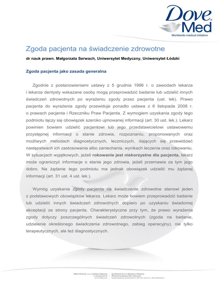Zgoda pacjenta na świadczenie zdrowotne dr nauk prawn. Małgorzata Serwach, Uniwersytet Medyczny, Uniwersytet Łódzki Zgoda pacjenta jako zasada generalna Zgodnie z postanowieniami ustawy z 5 grudnia 1996 r. o zawodach lekarza i lekarza dentysty wskazane osoby mogą przeprowadzić badanie lub udzielić innych świadczeń zdrowotnych po wyrażeniu zgody przez pacjenta (ust. lek). Prawo pacjenta do wyrażenia zgody przewiduje ponadto ustawa z 6 listopada 2008 r. o prawach pacjenta i Rzeczniku Praw Pacjenta. Z wymogiem uzyskania zgody tego podmiotu łączy się obowiązek szeroko ujmowanej informacji (art. 30 ust. lek.). Lekarz powinien bowiem udzielić pacjentowi lub jego przedstawicielowi ustawowemu przystępnej informacji o stanie zdrowia, rozpoznaniu, proponowanych oraz możliwych metodach diagnostycznych, leczniczych, dających się przewidzieć następstwach ich zastosowania albo zaniechania, wynikach leczenia oraz rokowaniu. W sytuacjach wyjątkowych, jeżeli rokowanie jest niekorzystne dla pacjenta, lekarz może ograniczyć informacje o stanie jego zdrowia, jeżeli przemawia za tym jego dobro. Na żądanie tego podmiotu ma jednak obowiązek udzielić mu żądanej informacji (art. 31 ust. 4 ust. lek.). Wymóg uzyskania zgody pacjenta na świadczenie zdrowotne stanowi jeden z podstawowych obowiązków lekarza. Lekarz może bowiem przeprowadzić badanie lub udzielić innych świadczeń zdrowotnych dopiero po uzyskaniu świadomej akceptacji ze strony pacjenta. Charakterystyczne przy tym, że prawo wyrażenia zgody dotyczy poszczególnych świadczeń zdrowotnych (zgoda na badanie, udzielenie określonego świadczenia zdrowotnego, zabieg operacyjny), nie tylko terapeutycznych, ale też diagnostycznych. Charakter prawny zgody pacjenta Zgoda pacjenta na zabieg lekarski ma charakter cywilnoprawnego oświadczenia woli, musi zatem spełniać wszystkie jego przesłanki. Brak zgody pacjenta powoduje powstanie po stronie lekarza, a niekiedy podmiotu leczniczego, odpowiedzialności za powstałą szkodę (cywilnej, karnej, zawodowej). Szkoda ta polega na naruszeniu nietykalności cielesnej pacjenta lub doprowadzeniu do uszkodzenia ciała - co w myśl art. 24 kodeksu cywilnego - stanowi jego dobro osobiste podlegające ochronie. Poszkodowany może również żądać zadośćuczynienia za doznaną krzywdę, czyli za ból, cierpienia fizyczne czy też negatywne przeżycia psychiczne. Jak zauważył Sąd Najwyższy w jednym z orzeczeń, brak zgody pacjenta pozbawia go możliwości decydowania o sobie, a w konsekwencji uznania istnienia ryzyka zabiegu medycznego. Akceptując interwencję medyczną pacjent zezwala lekarzowi na naruszenie tej integralności w ustalonym zakresie. Dokonanie zabiegu bez zgody pacjenta, nawet jeśli zostało dokonane lege artis i nie spowodowało żadnych komplikacji czy też skutków ubocznych nie wyłącza bezprawności działania lekarza. Potwierdza tę tezę także wyrok Sądu Apelacyjnego w Warszawie z 31 marca 2006 r. (I ACa 973/05), z którego wyraźnie wynika, że zabieg medyczny dokonany bez zgody pacjenta jest czynnością bezprawną nawet wówczas, gdy został wykonany zgodnie z zasadami wiedzy. Dodatkowo z treści art. 192 kodeksu karnego wynika, że kto wykonuje zabieg leczniczy bez zgody pacjenta podlega grzywnie, karze ograniczenia wolności albo pozbawienia wolności do lat 2. Wyrażenie przez pacjenta zgody na zastosowanie konkretnej metody leczenia nie oznacza, że lekarz ma prawo przeprowadzenia każdego zabiegu. Ingerencja w organizm człowieka zawsze musi być uzasadniona stanem jego zdrowia. Niedopuszczalne jest pochopne lub nieprzemyślane naruszenie nietykalności cielesnej innej osoby. Dlatego lekarz nie powinien przeprowadzać zabiegu, gdy ryzyko szkody dla zdrowia pacjenta jest wyższe niż korzyść, jakiej należy w tym przypadku oczekiwać. Pomimo zgody pacjenta, a niekiedy wyraźnego jego żądania nie może też przeprowadzić pewnych świadczeń zdrowotnych, na które nie pozwalają przepisy prawa. Przykładem może być tutaj zakaz dokonywania aborcji z wyjątkiem trzech przypadków (zagrożenie życia lub zdrowia matki, zagrożenie życia lub zdrowia dziecka, ciążą jest wynikiem popełnienia czynu zabronionego), niedopuszczalność pobierania komórek, tkanek czy narządów w celu uzyskania zysku, czy w końcu eutanazja. Można zatem powiedzieć, że zgoda pacjenta pozwala lekarzowi na dokonywanie czynności medycznych, chociaż są również takie sytuacje, gdy pomimo zgody pacjenta określonych świadczeń zdrowotnych lekarz wykonać nie może, ale też są takie przypadki, gdy dopuszczalne jest podjęcie określonych działań medycznych pomimo braku zgody, a niekiedy wbrew woli pacjenta (przymus leczenia). Osoby uprawnione do wyrażenia zgody, jej forma oraz treść I. Osoby uprawnione do wyrażenia zgody Zakres podmiotowy osób upoważnionych do wyrażenia zgody na określone świadczenie zdrowotne jest dosyć szeroki, poza samym pacjentem uprawienie to zostało przyznane również innym podmiotom. Nie uprzedzając dalszych rozważań możemy mówić o zgodzie osobistej (własnej) pacjenta, zgodzie zastępczej, zgodzie właściwego organu, a nawet zgodzie podwójnej. Omawiane prawo przysługuje: 1) przedstawicielowi ustawowemu, gdy pacjent jest małoletni, niezdolny do wyrażenia zgody lub całkowicie ubezwłasnowolniony. W tym ostatnim przypadku, jeżeli osoba całkowicie ubezwłasnowolniona jest jednak w stanie z rozeznaniem wypowiedzieć opinię w sprawie badania, konieczne jest ponadto uzyskanie zgody tej osoby; 2) sądowi opiekuńczemu w przypadku, gdy pacjent nie ma przedstawiciela ustawowego lub porozumienie z nim jest niemożliwe. Zgoda sądu opiekuńczego jest wymagana także wtedy, gdy małoletni, który ukończył lat 16, osoba ubezwłasnowolniona, chora psychicznie lub upośledzona umysłowo, lecz dysponująca dostatecznym rozeznaniem sprzeciwia się czynnościom medycznym. Sądem opiekuńczym właściwym miejscowo do w