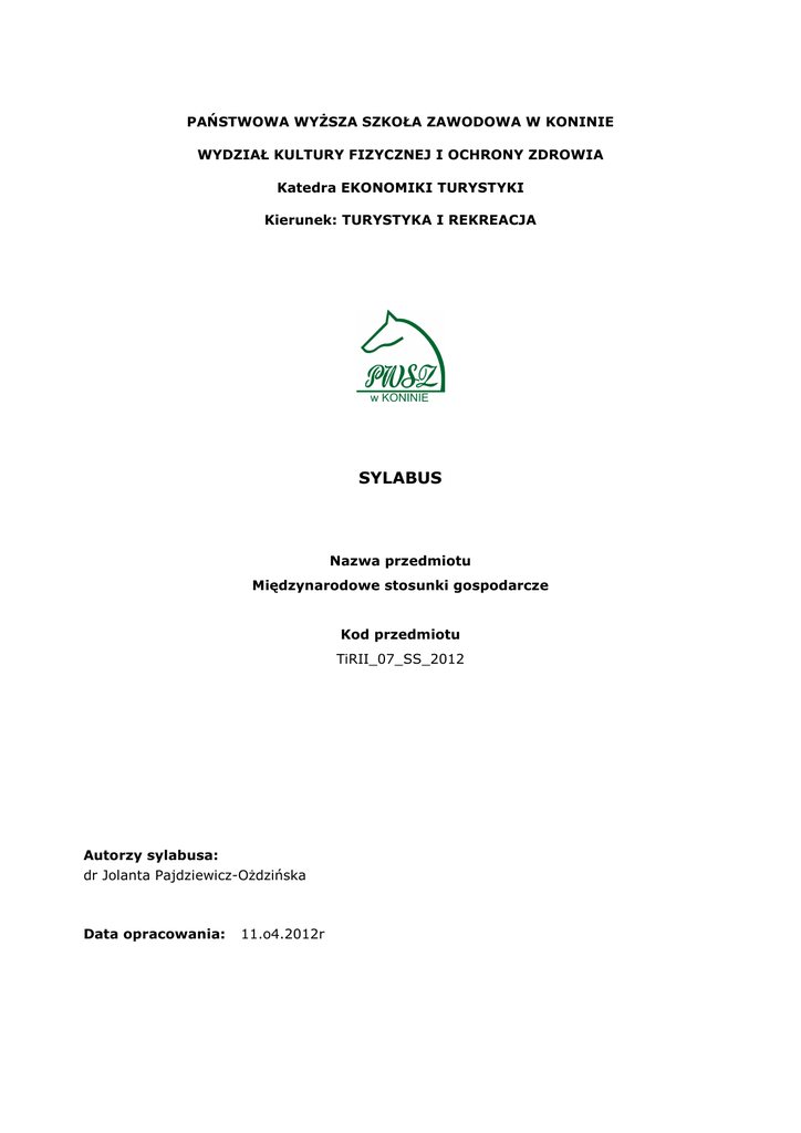 PAŃSTWOWA WYŻSZA SZKOŁA ZAWODOWA W KONINIE WYDZIAŁ KULTURY FIZYCZNEJ I OCHRONY ZDROWIA Katedra EKONOMIKI TURYSTYKI Kierunek: TURYSTYKA I REKREACJA SYLABUS Nazwa przedmiotu Międzynarodowe stosunki gospodarcze Kod przedmiotu TiRII_07_SS_2012 Autorzy sylabusa: dr Jolanta Pajdziewicz-Ożdzińska Data opracowania: 11.o4.2012r 1. Podstawowe informacje Poziom kształcenia studia pierwszego stopnia Profil kształcenia praktyczny Forma studiów stacjonarne Rok studiów II Semestr III Moduł kształcenia podstawowy Forma zajęć wykłady/ćwiczenia Wymiar godzinowy w15/Ćw15 Liczba punktów ECTS 2 Język wykładowy polski Forma zaliczenia zaliczenie z oceną Rok akademicki 2013/2014 2. Cele kształcenia C01 poznanie zagadnień z zakresu międzynarodowej wymiany gospodarczej C02 poszerzenie wiedzy na temat międzynarodowej integracji gospodarczej C03 rozpoznanie zjawisk światowych o charakterze globalnym 3. Wymagania wstępne Student, który rozpoczyna zajęcia z przedmiotu: • • • potrafi swobodnie operować językiem ekonomicznym, poprawnie definiować podstawowe kategorie umie prawidłowo interpretować zjawiska ekonomiczne posiada umiejętność myślenia ekonomicznego 4. Efekty kształcenia Tabela odniesień przedmiotowych efektów kształcenia do efektów kierunkowych i obszarowych Symbol Efekty kształcenia dla przedmiotu : Międzynarodowe stosunki gospodarcze. Student, który zaliczył przedmiot: Odniesienie do efektów kształcenia dla kierunku studiów turystyka i rekreacja Odniesienie do efektów kształcenia w obszarze kształcenia w zakresie nauk społecznych P_W01 wykazuje się ogólną wiedzą dotyczącą wymiany międzynarodowej K_W01 S1P_W01 P_W02 potrafi scharakteryzować zjawiska o charakterze globalnym K_W01 S1P_W01 P_U01 posiada umiejętność przygotowania i prezentowania materiałów zebranych przez siebie K_U06 S1P_U09, S1P_U10 P_U02 posiada umiejętność analizy i oceny zjawisk zachodzących na arenie międzynarodowej K_U04 S1P_U08 P_K01 dąży do uzupełniania swojej wiedzy K_K02 S1P_K06 5. Treści kształcenia WYKŁADY liczba godzin WYK01 Współczesne typy systemów ekonomicznych 1 WYK02 Gospodarka światowa, podmioty gospodarki 1 2 WYK03 Handel zagraniczny, podstawowe pojęcia 1 WYK04 Polityka handlowa –cele, rodzaje, instrumenty 2 WYK05 Rynek walutowy i jego funkcje .Kurs walutowy. Międzynarodowe systemy walutowe. 3 WYK06 Globalny wymiar gospodarki światowej (istota problemów globalnych) 4 WYK07 Międzynarodowe organizacje gospodarcze i ich rola w gospodarce światowej Ogółem ĆWICZENIA ĆW01 3 15 liczba godzin Handel międzynarodowy i jego przyczyny 2 ĆW02 Przewaga absolutna i względna; koszty komparatywne 2 ĆW03 Bilans płatniczy i jego elementy. Wielkość i struktura handlu międzynarodowego 4 ĆW04 Globalne problemy rozwoju współczesnego świata 2 ĆW05 Unia Europejska –procesy integracyjne 5 Ogółem 15 6. Metody kształcenia MK01 wykład MK02 dyskusja na wybrane tematy, zadania MK03 referat 7. Metody oceny (ocena formująca, ocena podsumowująca) OF01 zadania przedkolokwialne OF02 recenzje referatów OP01 referat OP02 test 8. Obciążenie pracą studenta liczba godzin Godziny kontaktowe z nauczycielem 30 Praca indywidualna studenta, w tym: 30 • przygotowanie się do ćwiczeń…(w tym referat) 20 • przygotowanie się do testu (zaliczenie) obejmującego materiał z ćwiczeń i wykładów Łączne obciążenie pracą studenta 10 60 9. Liczba punktów ECTS Liczba punktów ECTS, którą student uzyskuje za: • udział w zajęciach wymagających bezpośredniego udziału nauczycieli i studentów (godziny kontaktowe z nauczycielem) 1 • pracę indywidualną 1 Sumaryczna liczba punktów ECTS dla przedmiotu 2 10. Literatura podstawowa • • • Jantoń –Drozdowska E. Międzynarodowe stosunki gospodarcze, Ars boni et aequi, Wydanie II, Poznań, 2004. Budnikowski A., Międzynarodowe stosunki gospodarcze, PWE, Warszawa, 2006 Świerkocki J., Zarys ekonomii międzynarodowej, PWE, Warszawa, 2011. 11. Literatura uzupełniająca • • Czarny B., Podstawy ekonomii, PWE, Warszawa, 2011 Kompendium wiedzy o Unii Europejskiej, praca zbiorowa pod Red. Małuszyńskiej E. i Gruchmana B., PWN Warszawa, 2005 3 12. Sposoby weryfikacji zakładanych efektów kształcenia Efekty kształcenia dla przedmiotu Cele kształcenia (C) Treści kształcenia (WYK, ĆW, LAB) Metody kształcenia (MK) Metody oceny (OF, OP) P_W01 CO1 WYK01, WYK02, WYK03, WYK04, WYK05, ĆW01 MK01, MK02 OF01, OP02 P_W02 CO2 WYK06, ĆW04 MK01, MK02 OF01, OP02 P_U01 CO2 ĆW02 MK02 OF01, OP02 P_U02 CO2, CO3 WYK06, ĆW03, ĆW04 MK01,MK02 OF01, OP02 P_K01 CO2 WYK07, ĆW05 MK01, MK03 OF02,OP01, OP02 13. Kryteria oceny Efekty kształcenia dla przedmiotu Ocena 2,0 Ocena 3,0 Ocena 4,0 Ocena 5,0 P_W01 nie posiada ogólnej wiedzy na temat wymiany międzynarodowej i integracji gospodarczej posiada powierzchowną wiedzę na temat wymiany międzynarodowej i integracji gospodarczej posiada wiedzę na temat wymiany międzynarodowej i integracji gospodarczej posiada aktualną wiedzę na temat wymiany międzynarodowej i integracji gospodarczej P_W02 nie zna zjawisk o charakterze globalnym potrafi tylko wymienić zjawiska o charakterze globalnym potrafi wymienić i częściowo opisać zjawiska o charakterze globalnym wymienia i charakteryzuje zjawiska o charakterze globalnym P_U01 nie posiada umiejętności przygotowania i prezentowania zebranych materiałów słabo prezentuje przygotowany przez siebie materiał dobrze prezentuje przygotowany materiał bardzo dobrze prezentuje przygotowany materiał P_U02 nie potrafi ocenić zjawisk zachodzących na arenie międzynarodowej nie zawsze trafnie ocenia zjawiska zachodzące na arenie międzynarodowej przeważnie trafnie ocenia zjawiska zachodzące na arenie międzynarodowej poprawnie ocenia zjawiska zachodzące na arenie międzynarodowej P_K01 Nie dąży do uzupełniania swojej wiedzy rzadko wykazuje się szersza, aktualną wiedzą wyraźnie dąży do poszerzan
