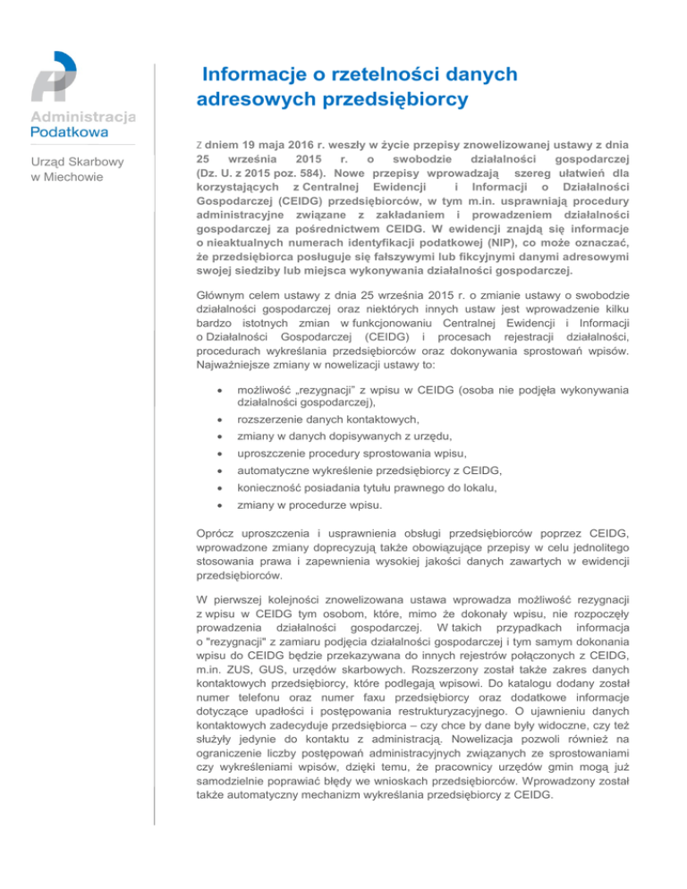 Informacje o rzetelności danych adresowych przedsiębiorcy Urząd Skarbowy w Miechowie Z dniem 19 maja 2016 r. weszły w życie przepisy znowelizowanej ustawy z dnia 25 września 2015 r. o swobodzie działalności gospodarczej (Dz. U. z 2015 poz. 584). Nowe przepisy wprowadzają szereg ułatwień dla korzystających z Centralnej Ewidencji i Informacji o Działalności Gospodarczej (CEIDG) przedsiębiorców, w tym m.in. usprawniają procedury administracyjne związane z zakładaniem i prowadzeniem działalności gospodarczej za pośrednictwem CEIDG. W ewidencji znajdą się informacje o nieaktualnych numerach identyfikacji podatkowej (NIP), co może oznaczać, że przedsiębiorca posługuje się fałszywymi lub fikcyjnymi danymi adresowymi swojej siedziby lub miejsca wykonywania działalności gospodarczej. Głównym celem ustawy z dnia 25 września 2015 r. o zmianie ustawy o swobodzie działalności gospodarczej oraz niektórych innych ustaw jest wprowadzenie kilku bardzo istotnych zmian w funkcjonowaniu Centralnej Ewidencji i Informacji o Działalności Gospodarczej (CEIDG) i procesach rejestracji działalności, procedurach wykreślania przedsiębiorców oraz dokonywania sprostowań wpisów. Najważniejsze zmiany w nowelizacji ustawy to: możliwość „rezygnacji” z wpisu w CEIDG (osoba nie podjęła wykonywania działalności gospodarczej), rozszerzenie danych kontaktowych, zmiany w danych dopisywanych z urzędu, uproszczenie procedury sprostowania wpisu, automatyczne wykreślenie przedsiębiorcy z CEIDG, konieczność posiadania tytułu prawnego do lokalu, zmiany w procedurze wpisu. Oprócz uproszczenia i usprawnienia obsługi przedsiębiorców poprzez CEIDG, wprowadzone zmiany doprecyzują także obowiązujące przepisy w celu jednolitego stosowania prawa i zapewnienia wysokiej jakości danych zawartych w ewidencji przedsiębiorców. W pierwszej kolejności znowelizowana ustawa wprowadza możliwość rezygnacji z wpisu w CEIDG tym osobom, które, mimo że dokonały wpisu, nie rozpoczęły prowadzenia działalności gospodarczej. W takich przypadkach informacja o "rezygnacji" z zamiaru podjęcia działalności gospodarczej i tym samym dokonania wpisu do CEIDG będzie przekazywana do innych rejestrów połączonych z CEIDG, m.in. ZUS, GUS, urzędów skarbowych. Rozszerzony został także zakres danych kontaktowych przedsiębiorcy, które podlegają wpisowi. Do katalogu dodany został numer telefonu oraz numer faxu przedsiębiorcy oraz dodatkowe informacje dotyczące upadłości i postępowania restrukturyzacyjnego. O ujawnieniu danych kontaktowych zadecyduje przedsiębiorca – czy chce by dane były widoczne, czy też służyły jedynie do kontaktu z administracją. Nowelizacja pozwoli również na ograniczenie liczby postępowań administracyjnych związanych ze sprostowaniami czy wykreśleniami wpisów, dzięki temu, że pracownicy urzędów gmin mogą już samodzielnie poprawiać błędy we wnioskach przedsiębiorców. Wprowadzony został także automatyczny mechanizm wykreślania przedsiębiorcy z CEIDG. Na mocy nowych przepisów nastąpiło również rozszerzenie katalogu danych i informacji wpisywanych do CEIDG z urzędu. Dane te będą dopisywane oraz modyfikowane przez właściwe organy, bez konieczności składania przez przedsiębiorcę wniosku aktualizacyjnego. Wśród danych wprowadzanych z urzędu znajduje się informacja o numerze identyfikacji podatkowej (NIP) oraz jego ewentualnym unieważnieniu lub uchyleniu – wprowadzana przez Urząd Skarbowy. Jeśli we wpisie przedsiębiorcy w CEIDG pojawi się informacja o uchylonym numerze identyfikacji podatkowej (NIP) oznacza to, że Naczelnik Urzędu Skarbowego właściwy dla tego przedsiębiorcy posiada informacje, że posługiwał się on fałszywymi lub fikcyjnymi danymi adresowymi swojej siedziby lub miejsca wykonywania działalności gospodarczej. Istotną zmianą jest również nałożenie na przedsiębiorców obowiązku posiadania tytułu prawnego do nieruchomości, których adresy podlegają wpisowi do CEIDG. Rozwiązanie to zapewni przede wszystkim prawdziwość i rzetelność danych adresowych wpisanych do CEIDG. Mechanizm ten ma ułatwić również walkę z nieuczciwymi przedsiębiorcami podającymi nieprawdziwe dane adresowe, ma służyć likwidacji fikcyjnych działalności gospodarczych, często działających poprzez tzw. „biura wirtualne” lub też takich, w których korespondencja powraca jako nieodebrana, gdyż osoba zakładająca działalność podała nieprawdziwy adres. Tytułu prawnego do nieruchomości nie dołącza się do wniosku o wpis do CEIDG, natomiast trzeba go przedstawić organowi ewidencyjnemu na jego wezwanie w ciągu 7 dni od doręczenia wezwania. Jego niedostarczenie spowoduje wykreślenie przedsiębiorcy z rejestru. Oprócz informacji o przedsiębiorcach i podmiotach dostępnych w CEIDG, przedsiębiorcy mają możliwość zweryfikowania czy ich kontrahenci są czynnymi podatnikami VAT. Urząd Skarbowy w Miechowie informuje, że w ubiegłym roku Ministerstwo Finansów uruchomiło na Portalu Podatkowym usługę „Sprawdzenie statusu podmiotu w VAT”, która poprzez wpisanie w stosowne pole identyfikatora podatkowego NIP, pozwoli sprawdzić status podatnika VAT. Ważnym jest aby zweryfikować kontrahenta przed dokonaniem transakcji i uchronić się przed nieuczciwymi przedsiębiorcami oraz grożącymi konsekwencjami podatkowymi. Podobną usługę, która oprócz danych o statusie VAT zawiera także informacje o rzetelności czeskiego podatnika, uruchomiło w ostatnim czasie również Ministerstwo Finansów Republiki Czeskiej. Usługa skierowana jest do przedsiębiorców, którzy podejmują współpracę z podmiotami zarejestrowanymi w Czechach. Informacje o statusie „nierzetelnego podatnika VAT", w języku angielskim, znajdują się na stronie Ministerstwa Finansów Republiki Czeskiej. Informacja o możliwości sprawdzenia statusu podatkowego podmiotu czeskiego zawarta jest równi