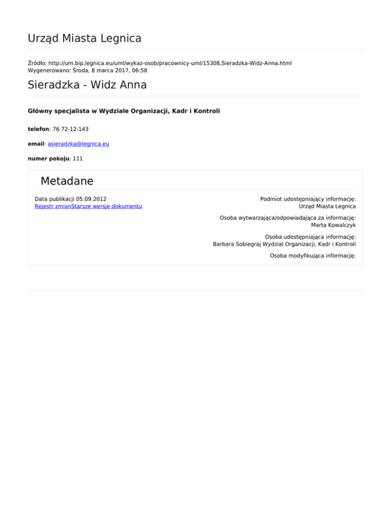 Urząd Miasta Legnica Źródło: http://um.bip.legnica.eu/uml/wykaz-osob/pracownicy-uml/15308,Sieradzka-Widz-Anna.html Wygenerowano: Środa, 8 marca 2017, 06:58 Sieradzka - Widz Anna Główny specjalista w Wydziale Organizacji, Kadr i Kontroli telefon: 76 72-12-143 email: [email protected] numer pokoju: 111 Metadane Data publikacji 05.09.2012 Rejestr zmianStarsze wersje dokumentu Podmiot udostępniający informację: Urząd Miasta Legnica Osoba wytwarzająca/odpowiadająca za informację: Marta Kowalczyk Osoba udostępniająca informację: Barbara Sobiegraj Wydzial Organizacji, Kadr i Kontroli Osoba modyfikująca informację: