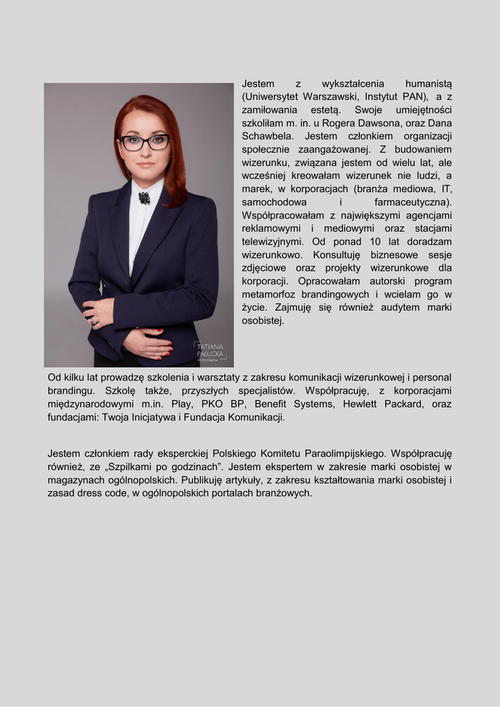 Jestem z wykształcenia humanistą (Uniwersytet Warszawski, Instytut PAN), a z zamiłowania estetą. Swoje umiejętności szkoliłam m. in. u Rogera Dawsona, oraz Dana Schawbela. Jestem członkiem organizacji społecznie zaangażowanej. Z budowaniem wizerunku, związana jestem od wielu lat, ale wcześniej kreowałam wizerunek nie ludzi, a marek, w korporacjach (branża mediowa, IT, samochodowa i farmaceutyczna). Współpracowałam z największymi agencjami reklamowymi i mediowymi oraz stacjami telewizyjnymi. Od ponad 10 lat doradzam wizerunkowo. Konsultuję biznesowe sesje zdjęciowe oraz projekty wizerunkowe dla korporacji. Opracowałam autorski program metamorfoz brandingowych i wcielam go w życie. Zajmuję się również audytem marki osobistej. Od kilku lat prowadzę szkolenia i warsztaty z zakresu komunikacji wizerunkowej i personal brandingu. Szkolę także, przyszłych specjalistów. Współpracuję, z korporacjami międzynarodowymi m.in. Play, PKO BP, Benefit Systems, Hewlett Packard, oraz fundacjami: Twoja Inicjatywa i Fundacja Komunikacji. Jestem członkiem rady eksperckiej Polskiego Komitetu Paraolimpijskiego. Współpracuję również, ze „Szpilkami po godzinach”. Jestem ekspertem w zakresie marki osobistej w magazynach ogólnopolskich. Publikuję artykuły, z zakresu kształtowania marki osobistej i zasad dress code, w ogólnopolskich portalach branżowych.