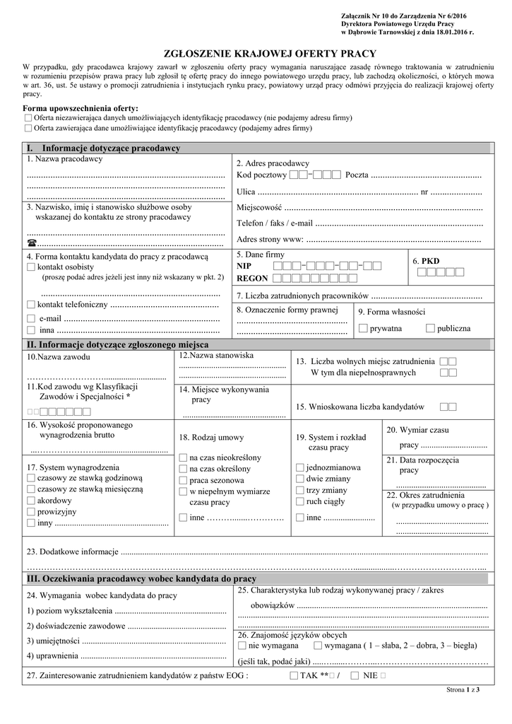 Załącznik Nr 10 do Zarządzenia Nr 6/2016 Dyrektora Powiatowego Urzędu Pracy w Dąbrowie Tarnowskiej z dnia 18.01.2016 r. ZGŁOSZENIE KRAJOWEJ OFERTY PRACY W przypadku, gdy pracodawca krajowy zawarł w zgłoszeniu oferty pracy wymagania naruszające zasadę równego traktowania w zatrudnieniu w rozumieniu przepisów prawa pracy lub zgłosił tę ofertę pracy do innego powiatowego urzędu pracy, lub zachodzą okoliczności, o których mowa w art. 36, ust. 5e ustawy o promocji zatrudnienia i instytucjach rynku pracy, powiatowy urząd pracy odmówi przyjęcia do realizacji krajowej oferty pracy. Forma upowszechnienia oferty: □ Oferta niezawierająca danych umożliwiających identyfikację pracodawcy (nie podajemy adresu firmy) □ Oferta zawierająca dane umożliwiające identyfikację pracodawcy (podajemy adres firmy) I. Informacje dotyczące pracodawcy 1. Nazwa pracodawcy .................................................................................... .................................................................................... .................................................................................... 2. Adres pracodawcy Kod pocztowy □□-□□□ Poczta ............................................... Ulica .................................................................... nr ...................... 3. Nazwisko, imię i stanowisko służbowe osoby wskazanej do kontaktu ze strony pracodawcy Miejscowość .................................................................................... .................................................................................... ............................................................................... Adres strony www: .......................................................................... Telefon / faks / e-mail ....................................................................... (proszę podać adres jeżeli jest inny niż wskazany w pkt. 2) 5. Dane firmy NIP □□□-□□□-□□-□□ REGON □□□□□□□□□ ............................................................................ 7. Liczba zatrudnionych pracowników ............................................... 4. Forma kontaktu kandydata do pracy z pracodawcą □ kontakt osobisty □ kontakt telefoniczny .............................................. □ e-mail .................................................................. □ inna ..................................................................... 6. PKD □□□□□ 8. Oznaczenie formy prawnej 9. Forma własności ............................................... ............................................... □ prywatna □ publiczna II. Informacje dotyczące zgłoszonego miejsca 10.Nazwa zawodu ………………………............................. 11.Kod zawodu wg Klasyfikacji Zawodów i Specjalności * □□□□□□ 16. Wysokość proponowanego wynagrodzenia brutto ...…………………................................. 17. System wynagrodzenia □ czasowy ze stawką godzinową □ czasowy ze stawką miesięczną □ akordowy □ prowizyjny □ inny ..................................................... 12.Nazwa stanowiska .................................................. .................................................. 14. Miejsce wykonywania pracy 13. Liczba wolnych miejsc zatrudnienia □□ W tym dla niepełnosprawnych □□ 15. Wnioskowana liczba kandydatów □□ ................................................ 18. Rodzaj umowy 19. System i rozkład czasu pracy □ na czas nieokreślony □ na czas określony □ praca sezonowa □ w niepełnym wymiarze czasu pracy □ jednozmianowa □ dwie zmiany □ trzy zmiany □ ruch ciągły □ inne ……….......…………. □ inne ........................ 20. Wymiar czasu pracy ............................... 21. Data rozpoczęcia pracy .......................................... 22. Okres zatrudnienia (w przypadku umowy o pracę ) ........................................... ........................................... 23. Dodatkowe informacje ........................................................................................................................................................................... ……………………………………………………………………………………………………...................…………………………... III. Oczekiwania pracodawcy wobec kandydata do pracy 24. Wymagania wobec kandydata do pracy 1) poziom wykształcenia .................................................... 2) doświadczenie zawodowe .............................................. 3) umiejętności ................................................................... 4) uprawnienia .................................................................... 25. Charakterystyka lub rodzaj wykonywanej pracy / zakres obowiązków ......................................................................................... ..................................................................................................................... ..................................................................................................................... 26. Znajomość języków obcych □ nie wymagana □ wymagana ( 1 – słaba, 2 – dobra, 3 – biegła) (jeśli tak, podać jaki) .....…......………...………………………………… 27. Zainteresowanie zatrudnieniem kandydatów z państw EOG : □ TAK ** / □ NIE Strona 1 z 3 IV. Informacje dotyczące postępowania z ofertą 28. Okres aktualności oferty od ............................... do .............................. 29. Czy oferta jest zgłoszona do innego PUP: 30. Czy oferta ma zostać upowszechniona w systemie otwartym (umożliwiającym identyfikacje pracodawcy): □ tak □ tak □ nie □ nie 31. Częstotliwość kontaktów PUP z pracodawcą 32. Czy należy upowszechnić ofertę w innych PUP 33. Czy ofer