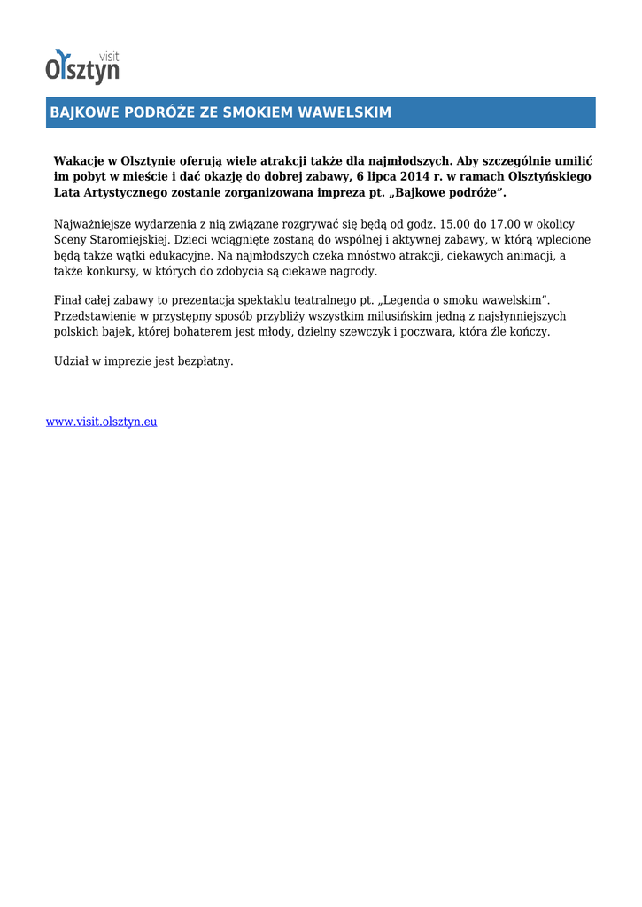 BAJKOWE PODRÓŻE ZE SMOKIEM WAWELSKIM Wakacje w Olsztynie oferują wiele atrakcji także dla najmłodszych. Aby szczególnie umilić im pobyt w mieście i dać okazję do dobrej zabawy, 6 lipca 2014 r. w ramach Olsztyńskiego Lata Artystycznego zostanie zorganizowana impreza pt. „Bajkowe podróże”. Najważniejsze wydarzenia z nią związane rozgrywać się będą od godz. 15.00 do 17.00 w okolicy Sceny Staromiejskiej. Dzieci wciągnięte zostaną do wspólnej i aktywnej zabawy, w którą wplecione będą także wątki edukacyjne. Na najmłodszych czeka mnóstwo atrakcji, ciekawych animacji, a także konkursy, w których do zdobycia są ciekawe nagrody. Finał całej zabawy to prezentacja spektaklu teatralnego pt. „Legenda o smoku wawelskim”. Przedstawienie w przystępny sposób przybliży wszystkim milusińskim jedną z najsłynniejszych polskich bajek, której bohaterem jest młody, dzielny szewczyk i poczwara, która źle kończy. Udział w imprezie jest bezpłatny. www.visit.olsztyn.eu