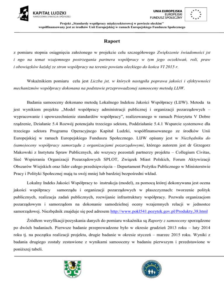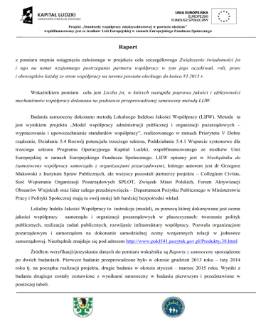 Projekt „Standardy współpracy międzysektorowej w powiecie oleckim’’ współfinansowany jest ze środków Unii Europejskiej w ramach Europejskiego Funduszu Społecznego Raport z pomiaru stopnia osiągnięcia założonego w projekcie celu szczegółowego Zwiększenie świadomości jst i ngo na temat wzajemnego postrzegania partnera współpracy w tym jego oczekiwań, roli, praw i obowiązków każdej ze stron współpracy na terenie powiatu oleckiego do końca VI 2015 r. Wskaźnikiem pomiaru celu jest Liczba jst, w których nastąpiła poprawa jakości i efektywności mechanizmów współpracy dokonana na podstawie przeprowadzonej samooceny metodą LIJW. Badania samooceny dokonano metodą Lokalnego Indeksu Jakości Współpracy (LIJW). Metoda ta jest wynikiem projektu „Model współpracy administracji publicznej i organizacji pozarządowych – wypracowanie i upowszechnienie standardów współpracy”, realizowanego w ramach Priorytetu V Dobre rządzenie, Działanie 5.4 Rozwój potencjału trzeciego sektora, Poddziałanie 5.4.1 Wsparcie systemowe dla trzeciego sektora Programu Operacyjnego Kapitał Ludzki, współfinansowanego ze środków Unii Europejskiej w ramach Europejskiego Funduszu Społecznego. LIJW opisany jest w Niezbędniku do (samo)oceny współpracy samorządu z organizacjami pozarządowymi, którego autorem jest dr Grzegorz Makowski z Instytutu Spraw Publicznych, ale wszyscy pozostali partnerzy projektu – Collegium Civitas, Sieć Wspierania Organizacji Pozarządowych SPLOT, Związek Miast Polskich, Forum Aktywizacji Obszarów Wiejskich oraz lider całego przedsięwzięcia – Departament Pożytku Publicznego w Ministerstwie Pracy i Polityki Społecznej mają tu swój mniej lub bardziej bezpośredni wkład. Lokalny Indeks Jakości Współpracy to instrukcja (model), za pomocą której dokonywana jest ocena jakości współpracy samorządu i organizacji pozarządowych w płaszczyznach: tworzenie polityk publicznych, realizacja zadań publicznych, rozwijanie infrastruktury współpracy. Pozwala organizacjom pozarządowym i samorządom na dokonanie samodzielnej oceny wzajemnych relacji w jednostce samorządowej. Niezbędnik znajduje się pod adresem http://www.pokl541.pozytek.gov.pl/Produkty,38.html Źródłem weryfikacji/pozyskania danych do pomiaru wskaźnika są Raporty z samooceny sporządzone po dwóch badaniach. Pierwsze badanie przeprowadzone było w okresie grudzień 2013 roku – luty 2014 roku tj. na początku realizacji projektu, drugie badanie w okresie styczeń – marzec 2015 roku. Wyniki z badania drugiego zostały zestawione z wynikami samooceny w badaniu pierwszym i przedstawione w poniższej tabeli. Projekt „Standardy współpracy międzysektorowej w powiecie oleckim’’ współfinansowany jest ze środków Unii Europejskiej w ramach Europejskiego Funduszu Społecznego Tabela 1. Zestawienie ocen współpracy międzysektorowej Płaszczyzna współpracy Ocena Tworzenie polityk publicznych 1 – nie współpracuje się nam dobrze 2 – ocena pośrednia 3– współpracuje się średnio 4 – ocena pośrednia 5– współpracuje się nam bardzo dobrze Opis ułatwiający ustalenie oceny Nie diagnozujemy wspólnie problemów i potrzeb mieszkańców, nie wymieniamy się informacjami, nie współtworzymy/konsultujemy istotnych dokumentów, aktów prawa lokalnego, program współpracy to fasada. Wystawiamy, jeśli trudno zgodzić się co do 1-ki lub 3-ki Czasem współpracujemy ze sobą, ale nieregularnie. Nie wszystkie polityki (w tym dokumenty, prawo lokalne itp.) podlegają konsultacjom. Programy współpracy, choć istnieją, to nie satysfakcjonują jednej ze stron, są sztampowe – nie do końca odzwierciedlają lokalne potrzeby, nie zawsze przekładają się na realia. Wystawiamy, jeśli trudno zgodzić się co do 3-ki lub 5-ki Wspólnie tworzymy wszystkie ważne polityki i dokumenty, konsultujemy je, wymieniamy się informacjami. Programy współpracy odzwierciedlają prawdzie relacje między nami i Powiat Olecki I II Różnica 1 3 Gmina Olecko I II 2 4 Różnica Gmina Kowale Olecki I II Różnica 2 I II 3 3 1 3 4 Gmina Świętajno 4 Różnica Gmina Wieliczki I II 3 3 0 Różnica 0 Projekt „Standardy współpracy międzysektorowej w powiecie oleckim’’ współfinansowany jest ze środków Unii Europejskiej w ramach Europejskiego Funduszu Społecznego Realizacja zadań publicznych 1 – nie współpracuje się nam dobrze 2 – ocena pośrednia 3– współpracuje się średnio gwarantują ich poprawność. Samorząd prawie nie organizuje konkursów ani nie zleca organizacjom prawie żadnych zadań. Administracja nie wspiera też organizacji w żaden inny sposób, czy to poprzez udostępnianie lokali, czy innego rodzaju pomocy pozafinansowej. Organizacje nie uczestniczą też w ocenie realizacji zadań. Zupełnie nie są zawierane formalne partnerstwa dla rozwiązywania wspólnych problemów. Wystawiamy, jeśli trudno zgodzić się co do 1-ki lub 3-ki Organizowane są nieliczne konkursy dla organizacji pozarządowych, zadania publiczne są też zlecane w innych trybach. Samorząd współpracuje tylko w niektórych dziedzinach, choć mógłby angażować organizacje w większym zakresie. Sporadycznie udzielane jest wsparcie majątkowe (np. udostępnianie pomieszczeń itp.). Samorząd unika angażowania organizacji w ocenę zadań, sporadycznie zdarza się zawiązywanie partnerstw dla rozwiązania 1 1 1 0 0 3 3 Projekt „Standardy współpracy międzysektorowej w powiecie oleckim’’ współfinansowany jest ze środków Unii Europejskiej w ramach Europejskiego Funduszu Społecznego wspólnych problemów. 4 – ocena pośrednia Rozwijanie infrastruktury współpracy 5– współpracuje się nam bardzo dobrze 1 – nie współpracuje się nam dobrze 2 – ocena pośrednia 3– współpracuje się średnio Wystawiamy, jeśli trudno zgodzić się co do 3-ki lub 5-ki Samorząd regularnie prowadzi konkursy dla organizacji pozarządowych, zleca te