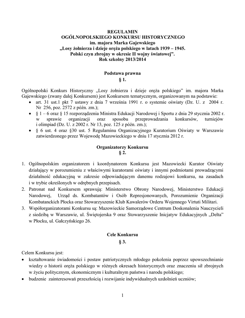 REGULAMIN OGÓLNOPOLSKIEGO KONKURSU HISTORYCZNEGO im. majora Marka Gajewskiego „Losy żołnierza i dzieje oręża polskiego w latach 1939 – 1945. Polski czyn zbrojny w okresie II wojny światowej”. Rok szkolny 2013/2014 Podstawa prawna § 1. Ogólnopolski Konkurs Historyczny „Losy żołnierza i dzieje oręża polskiego” im. majora Marka Gajewskiego (zwany dalej Konkursem) jest Konkursem tematycznym, organizowanym na podstawie: art. 31 ust.1 pkt 7 ustawy z dnia 7 września 1991 r. o systemie oświaty (Dz. U. z 2004 r. Nr 256, poz. 2572 z późn. zm.); § 1 – 6 oraz § 15 rozporządzenia Ministra Edukacji Narodowej i Sportu z dnia 29 stycznia 2002 r. w sprawie organizacji oraz sposobu przeprowadzania konkursów, turniejów i olimpiad (Dz. U. z 2002 r. Nr 13, poz. 125 z późn. zm.); § 6 ust. 4 oraz §30 ust. 5 Regulaminu Organizacyjnego Kuratorium Oświaty w Warszawie zatwierdzonego przez Wojewodę Mazowieckiego w dniu 17 stycznia 2012 r. Organizatorzy Konkursu § 2. 1. Ogólnopolskim organizatorem i koordynatorem Konkursu jest Mazowiecki Kurator Oświaty działający w porozumieniu z właściwymi kuratorami oświaty i innymi podmiotami prowadzącymi działalność edukacyjną w zakresie odpowiadającym danemu rodzajowi konkursu, na zasadach i w trybie określonych w odrębnych przepisach. 2. Patronat nad Konkursem sprawują: Ministerstwo Obrony Narodowej, Ministerstwo Edukacji Narodowej, Urząd ds. Kombatantów i Osób Represjonowanych, Porozumienie Organizacji Kombatanckich Płocka oraz Stowarzyszenie Klub Kawalerów Orderu Wojennego Virtuti Militari. 3. Współorganizatorami Konkursu są: Mazowieckie Samorządowe Centrum Doskonalenia Nauczycieli z siedzibą w Warszawie, ul. Świętojerska 9 oraz Stowarzyszenie Inicjatyw Edukacyjnych „Delta” w Płocku, ul. Gałczyńskiego 26. Cele Konkursu § 3. Celem Konkursu jest: kształtowanie świadomości i postaw patriotycznych młodego pokolenia poprzez upowszechnianie wiedzy o historii oręża polskiego w różnych okresach historycznych oraz znaczeniu sił zbrojnych w życiu politycznym, ekonomicznym i kulturalnym państwa i narodu polskiego; budzenie zainteresowań przeszłością i rozwijanie indywidualnych uzdolnień uczniów; 1 popularyzowanie wśród młodzieży tematyki historii wojskowości oraz wiedzy o losach żołnierza i dziejach oręża polskiego; kształtowanie umiejętności kreatywno-krytycznego myślenia o dziejach minionych, a także rozwijanie umiejętności pracy ze źródłami historycznymi pisanymi i materialnymi; wzbogacanie form współpracy z uczniem zdolnym. Zakres i tematyka Konkursu § 4. 1. Konkurs przeznaczony jest dla uczniów klas IV–VI szkoły podstawowej, uczniów gimnazjum i zasadniczej szkoły zawodowej, szczególnie zainteresowanych historią wojskowości. W roku szkolnym 2013/2014 tematyka Konkursu obejmuje historię Polski i historię powszechną dziejów oręża polskiego w latach 1939 – 1945 z uwzględnieniem znajomości broni i barwy, architektury obronnej, literatury, malarstwa batalistycznego i portretowego, muzyki i pieśni, tekstów źródłowych, topografii wojskowej, heraldyki, sfragistyki i falerystyki (pieczęcie, odznaki i znaki honorowe) formacji wojskowych oraz sylwetek dowódców. 2. Szczegółową tematykę kolejnych edycji Konkursu, wykaz literatury oraz zadania na poszczególne etapy ustala zespół wyznaczony przez Mazowieckiego Kuratora Oświaty. Struktura organizacyjna § 5. 1. Konkurs odbywa się w czterech etapach przeprowadzanych w następujących terminach: I etap – szkolny (6 listopada 2013 r.), organizowany przez dyrektorów szkół; II etap – rejonowy (11 grudnia 2013 r.), organizowany przez właściwych kuratorów oświaty; III etap – wojewódzki (19 marca 2014 r.), organizowany przez właściwych kuratorów oświaty; IV etap – ogólnopolski (5 - 7 czerwca 2014 r.), organizowany i przeprowadzany przez Komitet Organizacyjny powołany zarządzeniem Mazowieckiego Kuratora Oświaty. 2. Szkoły zgłaszają się do udziału w Konkursie wyłącznie poprzez wypełnienie formularza elektronicznego, dostępnego na stronie www.losyzolnierza.pl w terminie od 1 do 18 października 2013 r. 3. Zadania konkursowe na I etap – szkolny pobiera Dyrektor szkoły ze strony internetowej www.losyzolnierza.pl. 4. Login i hasło niezbędne do pobrania zadań konkursowych ze strony www.losyzolnierza.pl, dyrektor szkoły odbiera od 23 października 2013 r. z właściwego kuratorium oświaty lub delegatury. (W województwie mazowieckim loginy i hasła są identyczne jak loginy i hasła wykorzystywane przy logowaniu do konkursów przedmiotowych). 5. Zadania konkursowe na II etap – rejonowy oraz III etap – wojewódzki przesyłane są drogą elektroniczną, dziesięć dni przed terminami Konkursu do właściwych kuratorów oświaty. 2 § 6. 1. Wszystkie etapy Konkursu przeprowadzane są na podstawie zestawów zadań konkursowych opracowanych zgodnie z zasadami pomiaru dydaktycznego. Zadania konkursowe mają charakter testów z pytaniami zamkniętymi i otwartymi (krótkie odpowiedzi) oraz ćwiczeń praktycznych polegających na oprowadzaniu po obiektach zabytkowych, muzeach, rozpoznawaniu i interpretowaniu różnego rodzaju źródeł historycznych, pracy z mapą, analizowaniu filmów fabularnych i dokumentalnych, fotografii, literatury pięknej (poezja, pieśni), itp. 2. W etapach szkolnym, rejonowym i wojewódzkim zadania poszerzają treści podstawy programowej oraz uwzględniają elementarne wiadomości z zakresu uzbrojenia, umundurowania, budownictwa obronnego i symboliki wojskowej, a także umiejętności posługiwania się mapą i szkicem graficznym. 3. Na etapie ogólnopolskim zakres tematyczny obejmuje następujące dziedziny: broń i barwa (w tym analizowanie ekspozycji muzealnej i rozpoznawanie poszczególnych zabytków), malarstwo batalistyczne i portretowe, literatura, poezja i pieśń wojskowa, film batalistyczny i historyczny, topografia wojskowa, historyczne zab