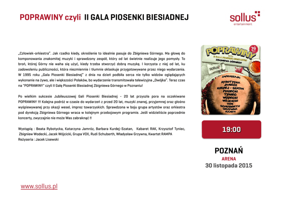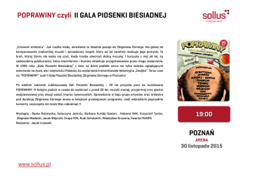 POPRAWINY czyli II GALA PIOSENKI BIESIADNEJ „Człowiek-orkiestra”. Jak rzadko kiedy, określenie to idealnie pasuje do Zbigniewa Górnego. Ma głowę do komponowania znakomitej muzyki i sprawdzony zespół, który od lat świetnie realizuje jego pomysły. To broń, której Górny nie waha się użyć, kiedy trzeba stworzyć dobrą muzykę. I korzysta z niej od lat, ku zadowoleniu publiczności, która niezmiennie i tłumnie oklaskuje przygotowywane przez niego wydarzenia. W 1995 roku „Gala Piosenki Biesiadnej” z dnia na dzień podbiła serca nie tylko widzów oglądających wykonanie na żywo, ale i większości Polaków, bo wydarzenie transmitowała telewizyjna „Dwójka”. Teraz czas na "POPRAWINY" czyli II Galę Piosenki Biesiadnej Zbigniewa Górnego w Poznaniu! Po wielkim sukcesie Jubileuszowej Gali Piosenki Biesiadnej - 20 lat przyszła pora na oczekiwane POPRAWINY !!! Kolejna podróż w czasie do wydarzeń z przed 20 lat, muzyki znanej, przyjemnej oraz głośno wyśpiewywanej przy okazji wesel, imprez towarzyskich. Sprawdzona w boju grupa artystów oraz orkiestra pod dyrekcją Zbigniewa Górnego wraca w kolejnym przebojowym programie. Jeśli widzieliście poprzednie koncerty, zwyczajnie nie może Was zabraknąć !! Wystąpią : Beata Rybotycka, Katarzyna Jamróz, Barbara Kurdej-Szatan, Kabaret RAK, Krzysztof Tyniec, Zbigniew Wodecki, Jacek Wójcicki, Grupa VOX, Rudi Schuberth, Władysław Grzywna, Kwartet RAMPA Reżyseria : Jacek Lisewski 19:00 POZNAŃ ARENA 30 listopada 2015 www.sollus.pl POPRAWINY czyli II GALA PIOSENKI BIESIADNEJ cennik biletów 90 zł 90 zł 110 zł 70 zł opiekun klienta 45 zł 90 zł SEKTOR A3 110 zł 130 zł 110 zł 70 zł SEKTOR B3 45 zł Mikołaj Mosiądz tel. 690 338 380 tel. 61 679 27 27 [email protected] Skorzystaj z najlepszych miejsc. Zrób rezerwację telefoniczną