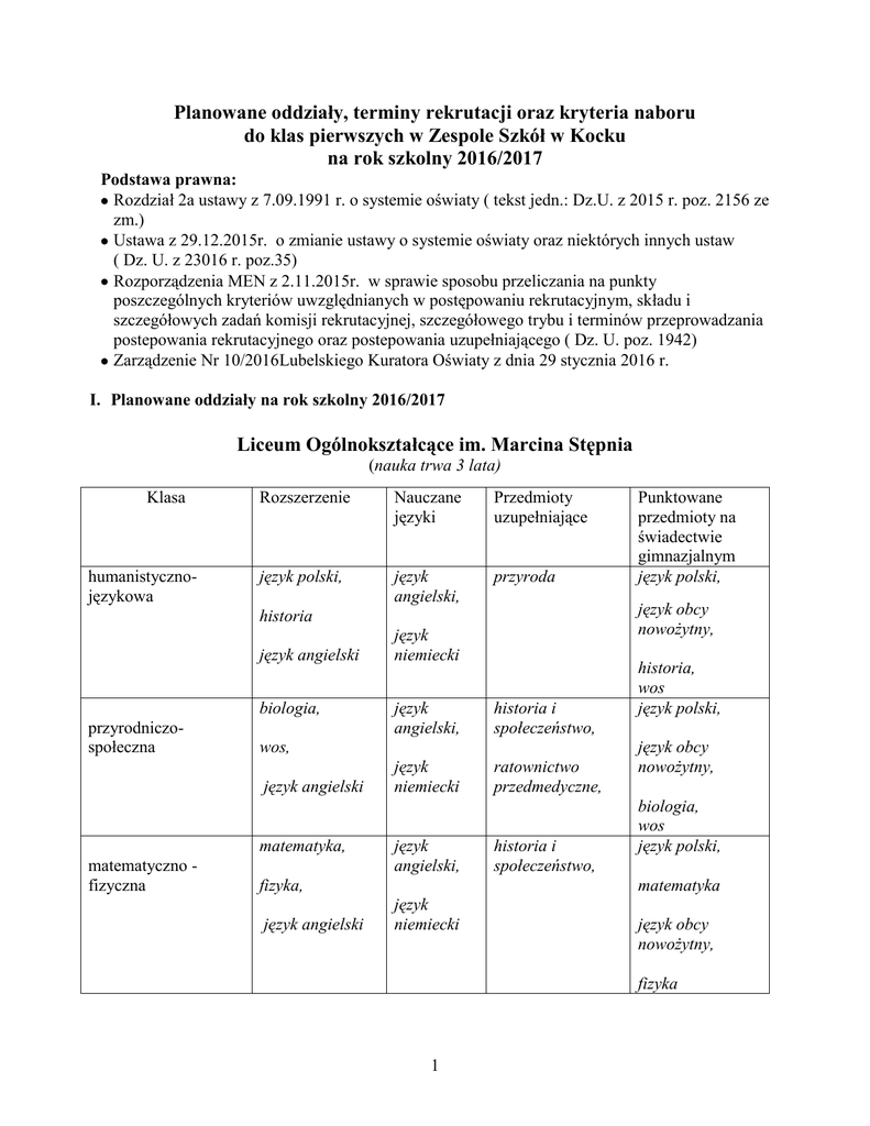 Planowane oddziały, terminy rekrutacji oraz kryteria naboru do klas pierwszych w Zespole Szkół w Kocku na rok szkolny 2016/2017 Podstawa prawna: Rozdział 2a ustawy z 7.09.1991 r. o systemie oświaty ( tekst jedn.: Dz.U. z 2015 r. poz. 2156 ze zm.) Ustawa z 29.12.2015r. o zmianie ustawy o systemie oświaty oraz niektórych innych ustaw ( Dz. U. z 23016 r. poz.35) Rozporządzenia MEN z 2.11.2015r. w sprawie sposobu przeliczania na punkty poszczególnych kryteriów uwzględnianych w postępowaniu rekrutacyjnym, składu i szczegółowych zadań komisji rekrutacyjnej, szczegółowego trybu i terminów przeprowadzania postepowania rekrutacyjnego oraz postepowania uzupełniającego ( Dz. U. poz. 1942) Zarządzenie Nr 10/2016Lubelskiego Kuratora Oświaty z dnia 29 stycznia 2016 r. I. Planowane oddziały na rok szkolny 2016/2017 Liceum Ogólnokształcące im. Marcina Stępnia (nauka trwa 3 lata) Klasa humanistycznojęzykowa Rozszerzenie Nauczane języki Przedmioty uzupełniające język polski, język angielski, przyroda język obcy nowożytny, historia język angielski biologia, przyrodniczospołeczna matematyka, matematyczno fizyczna język niemiecki język angielski, historia i społeczeństwo, język niemiecki ratownictwo przedmedyczne, wos, język angielski język angielski, fizyka, język angielski Punktowane przedmioty na świadectwie gimnazjalnym język polski, historia i społeczeństwo, historia, wos język polski, język obcy nowożytny, biologia, wos język polski, matematyka język niemiecki język obcy nowożytny, fizyka 1 Technikum Zawodowe (nauka trwa 4 lata) Zawód Nauczane języki technik handlowiec język angielski, język niemiecki język angielski, język niemiecki język angielski, język niemiecki technik hotelarstwa technik rybactwa śródlądowego Punktowane przedmioty na świadectwie gimnazjalnym język polski, język obcy nowożytny, geografia, informatyka język polski, język obcy nowożytny, geografia, informatyka język polski, język obcy nowożytny, biologia, informatyka Zasadnicza Szkoła Zawodowa nr 1 (nauka trwa 3 lata) Zawód Nauczany język monter zabudowy i robót wykończeniowych w budownictwie Punktowane przedmioty język angielski, język polski, język obcy nowożytny, geografia, informatyka mechanik pojazdów język angielski, samochodowych, cukiernik, piekarz, wędliniarz, krawiec, fryzjer, rolnik, sprzedawca, kucharz, rybak śródlądowy, dekarz, stolarz, lakiernik, elektryk, tapicer język polski, język obcy nowożytny, geografia, informatyka Miejsce odbywania praktyk RCEZ w Lubartowie (zapewnia szkoła) U pracodawców I Liceum Ogólnokształcące dla Dorosłych Klasa Rozszerzenie Nauczane języki Przedmioty uzupełniające biologia, język angielski historia i społeczeństwo, biologiczna język angielski 2 II. Terminy składania dokumentów i rekrutacji do Liceum Ogólnokształcącego im. Marcina Stępnia, Technikum Zawodowego i Zasadniczej Szkoły Zawodowej nr 1 . Lp. 1. 2. 3. 4. 5. 6. Czynności Składanie wniosków o przyjęcie do szkoły wraz z dokumentami potwierdzającymi spełnienie przez kandydata warunków lub kryteriów branych pod uwagę w postępowaniu rekrutacyjnym. Uzupełnienie wniosku o przyjęcie do szkoły o świadectwo ukończenia gimnazjum oraz o zaświadczenie o wynikach. Weryfikacja przez komisję wniosków o przyjęcie do szkoły i dokumentów potwierdzających spełnienie przez kandydata warunków lub kryteriów branych pod uwagę w postepowaniu rekrutacyjnym. Podanie do publicznej wiadomości przez komisje rekrutacyjną listy kandydatów zakwalifikowanych i kandydatów niezakwalifikowanych. Wydanie przez szkołę prowadzącą kształcenie zawodowe skierowania na badania lekarskie kandydatowi z listy kandydatów zakwalifikowanych, który dokonał wyboru kształcenia w danym zawodzie w jednej szkole, w przypadku złożenia przez kandydata oświadczenia o wyborze tej szkoły. Potwierdzenie przez kandydatów woli podjęcia nauki w danej szkole poprzez dostarczenie oryginału świadectwa ukończenia gimnazjum oraz oryginału zaświadczenia o wynikach egzaminu gimnazjalnego, jeśli nie zostały wcześniej złożone, a w przypadku szkoły prowadzącej kształcenie zawodowe – także zaświadczenia lekarskiego zawierającego orzeczenie o braku przeciwskazań zdrowotnych do podjęcia praktycznej nauki zawodu. Termin postępowania rekrutacyjnego do 23 czerwca 2016r. Termin postepowania uzupełniającego do 1 sierpnia 2016r. od 24 czerwca 2016 r. do 28 czerwca 2016 r. godz. 15.00 nie dotyczy do 30 czerwca 2016 r. do 3 sierpnia 2016 r. do 15 lipca 2016 r. godz. 10.00 23 sierpnia 2016 r. godz. 10.00 do 19 lipca 2016 r. 23 sierpnia 2016 r. do 26 lipca 2016 r. godz. 15.00 do 26 sierpnia 2016 r. do godz. 15.00 3 Podanie do publicznej wiadomości przez komisję rekrutacyjną listy kandydatów przyjętych i nieprzyjętych. 7. Poinformowanie przez dyrektora szkoły Lubelskiego Kuratora oświaty o liczbie wolnych miejsc w szkole. 8. do 27 lipca 2016 r. godz. 10.00 do 29 sierpnia 2016 r. godz. 10.00 27 lipca 2016 r. 29 sierpnia 2016 r. III. Terminy składania dokumentów i rekrutacji do I Liceum Ogólnokształcącego dla Dorosłych. Lp. 1. 2. 3. 4. 5. 6. Czynności Składanie wniosków o przyjęcie do szkoły wraz z dokumentami potwierdzającymi spełnienie przez kandydata warunków lub kryteriów branych pod uwagę w postępowaniu rekrutacyjnym. Weryfikacja przez komisję wniosków o przyjęcie do szkoły i dokumentów potwierdzających spełnienie przez kandydata warunków lub kryteriów branych pod uwagę w postepowaniu rekrutacyjnym. Podanie do publicznej wiadomości przez komisje rekrutacyjną listy kandydatów zakwalifikowanych i kandydatów niezakwalifikowanych. Potwierdzenie przez kandydatów woli podjęcia nauki w danej szkole poprzez dostarczenie oryginału świadectwa ukończenia gimnazjum lub ośmioletniej szkoły podstawowej, o ile nie został wcześniej złożony wraz z wnioskiem o przyjęcie do szkoły. Podanie do publiczne