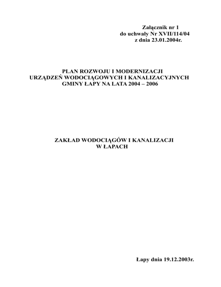 Załącznik nr 1 do uchwały Nr XVII/114/04 z dnia 23.01.2004r. PLAN ROZWOJU I MODERNIZACJI URZĄDZEŃ WODOCIĄGOWYCH I KANALIZACYJNYCH GMINY ŁAPY NA LATA 2004 – 2006 ZAKŁAD WODOCIĄGÓW I KANALIZACJI W ŁAPACH Łapy dnia 19.12.2003r. I. Wprowadzenie Zgodnie z art.21 ustawy z dnia 7 czerwca 2001 r. o zbiorowym zaopatrzeniu w wodę i zbiorowym odprowadzeniu ścieków ( Dz. U. Nr 72 , poz.747 ) przedsiębiorstwa wodociągowo – kanalizacyjne opracowują wieloletnie plany rozwoju i modernizacji urządzeń wodociągowych i kanalizacyjnych. Niniejszy plan obejmuje lata 2004 – 2006. II. Gospodarka wodno – ściekowa stan istniejący 1. Zaopatrzenie w wodę A. Miasto łapy Miasto Łapy zaopatrywane jest w wodę z ujęć podziemnych Wodociąg bazuje na kilku rozproszonych ujęciach, gdzie woda ze studni głębinowych tłoczona jest do czterech hydroforni skąd po uzdatnianiu kierowana jest na sieć, Podstawowym żródłem zaopatrzenia miasta Łapy w wodę jest ujęcie Nr 1 zlokalizowane przy ulicy Spółdzielczej wspomagane przez ujęcie przy oczyszczalni ścieków przy ulicy Płonkowskiej. Obydwa te ujęcia pracują w oparciu o sześć studni głębinowych przy ulicy : 1. Spółdzielczej (1A) - wykonana w 1965 roku jako zastępcza w stosunku do zlikwidowanej studni Nr 1 wykonanej w 1956 roku, głębokości 47 m 2. Sikorskiego (5) - wykonana w 1959 roku poddana rekonstrukcji w 1967 roku , głębokości 46,2 m 3. Śliskiej (4) - wykonana w 1958 roku i zrekonstruowana w 1974 roku , głębokość 46,3 m 4. Armii Krajowej (3A) - wykonana w 1990 roku jako zastępcza w stosunku do zlikwidowanej studni 3 głębokości 45,5 m 5. Oczyszczalni ścieków - dwie studnie ,jedna odwiercona w 1982 roku, głębokość 46 m, druga wykonana w 1990 roku w odległości około 105 metrów od studni Nr 1 , głębokości 45,5 m Pracują przemiennie jako podstawowe i awaryjne żródło wody Następnym żródłem zaopatrzenia miasta jest ujęcie przy ulicy Długiej. Bazuje na dwóch studniach – Nr 2 wykonana w 1969 roku dla Zakładów Galanterii Skórzanej, wykorzystywana była przez kilkanaście lat dla zaopatrzenia w wodę południowej części miasta głębokość 40 m. W związku ze spadkiem jej wydajności i niemożliwości przeprowadzenia rekonstrukcji wykonana została w odległości 52 m od niej studnia Nr 6 odwiercona w 1985 roku stanowiąca podstawowe żródło wody – głebokość 42 m . Obie strony miasta są podłączone tylko jednym przeciskiem. Stacja wodociagowa w Łapach Osse bazuje na jednej studni głębinowej , która została odwiercona w 1978 roku – głębokość 36,5 m. Ze względu na bardzo rozproszony charakter ujęć wód podziemnych zasoby ich ustalono punktowo, Ogólny bilans zatwierdzonych zasobów eksploatacyjnych stanowiących bazę wodociągu komunalnego w Łapach wynosi 284 m3/h Natomiast rzeczywista wydajność wszystkich wymienionych studni wynosi około 240m3/h.Różnica wynika ze starzenia się studni i utraty z tego względu wydajności (kolmatacja filtra i strefy około filtrowej). W okresie suszy maxymalne godzinowe zaopatrzenie na wodę wynosi 270m3/h , natomiast w czasie normalnego rozbioru zapotrzebowanie na wodę sięga maxymalnie 170m3/h .Miasto Łapy jest w zasadzie zwodociągowane w 100% Sytuacja bazy wodociągowej w Łapach jest zła. Wykorzystane zostały studnie , które służyć miały niewielkim obiektom lub niewielkiej grupie mieszkańców. W związku z tym lokalizacja ich była często przypadkowa związana z obiektem do zaopatrzenia w wodę. Dzisiaj lokalizacje te są niezgodne z przepisami i nieumożliwiają właściwe wyznaczenie i zagospodarowanie strefy ochronnej ( studnie 4 , 1A , 3A 5 ). Wytypowano w południowo – wschodniej części miasta poza obrębem zabudowy w rejonie Łapy Wity i Łapy Szołajdy teren pod nowe ujęcie komunalne. Ze względów finansowych nie doczekał się realizacji. Wiele studni ( szczególnie 1A, 4 i 5 ) jest u kresu swoich możliwości technicznych ze względu na kolmatację filtra i strefy około filtrowej a w Łapach Osse występuje piaszczenie. Może nastąpić konieczność wyeliminowania ich jako żródła zasilania wodociągu i sytuacja w zakresie zaopatrzenia miasta w wodę będzie bardzo trudna. Należy dążyć do likwidacji studni na ulicy Płonkowskiej zlokalizowanych na oczyszczalni ścieków oraz w Łapach Osse. Z przeprowadzonych badań wynika , ze niewielki nakład utworów nieprzepuszczalnych jest niewystarczającym zabezpieczeniem przed przenikaniem zanieczyszczeń do wód podziemnych. Zakład Wodociągów i Kanalizacji w Łapach proponuje zlecić opracowanie koncepcji perspektywicznego zasilania miasta i gminy w wodę z opracowaniem nowego programu wodociągu . B. Gmina Łapy Ujecie wód podziemnych w Daniłowie Dużym eksploatowane jest dla zaopatrzenia w wodę do celów pitnych i gospodarczych wsi Daniłowo Duże , Daniłowo Małe , Grochy , Gąsówka Stara , Gąsówka Oleksin , Łapy Korczaki , Łapy Plusniaki , Łapy Szołajdy i Łapy Dębowina. Ujęcie wód podziemnych , na którym bazuje stacja wodociągowa w Daniłowie stanowią 3 studnie głębinowe położone w obrębie wygrodzonej działki stacji . SW 1 wykonana w 1975 głbokości 50 metrów ustalona i zatwierdzona w kat”B” jej wydajność wynosiła Q= 71 m3/h. Przez wiele lat eksploatowana była na zmianę ze studnią SW-2. W wyniku procesu starzenia się wydajność jej bardzo zmalała. W 1991 roku przeprowadzone badania wykazały że wydajność jej Q = 10 m3/h każe wyłączyć ja z eksploatacji. Obecnie studnia ta jest nieczynna. SW 2 od wiercona w 1978 roku głębokości 65 metrów o wydajności Q=73 m3/h. SW 3 wykonana w 1992 roku głębokości 70 metrów. Wydajność eksploatacyjna studni pracującej pojedyńczo ustalona została na Q = 70 m3/h. Ustalone zasoby wód podziemnych dla zespołu studni SW 1 i SW 3 zatwierdzone zostały w ilości Q= 130 m3/h. W najbliższych latach należy wykonać renowację studni nr 1 w celu zwięk