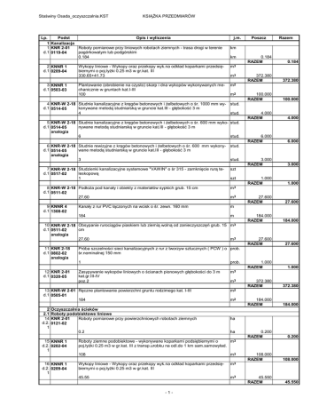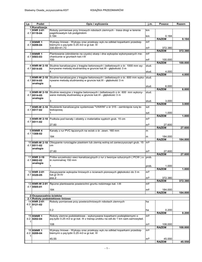 Staświny Osada_oczyszczalnia.KST KSIĄŻKA PRZEDMIARÓW Lp. Podst Opis i wyliczenia 1 Kanalizacja 1 KNR 2-01 Roboty pomiarowe przy liniowych robotach ziemnych - trasa drogi w terenie d.1 0119-04 pagórkowatym lub podgórskim 0.184 2 KNNR 1 d.1 0209-04 3 KNNR 1 d.1 0503-03 Wykopy liniowe - Wykopy oraz przekopy wyk.na odkład koparkami przedsiębiernymi o poj.łyżki 0.25 m3 w gr.kat. III 330.65+41.73 Plantowanie (obrobienie na czysto) skarp i dna wykopów wykonywanych mechanicznie w gruntach kat.I-III 100 j.m. km 8 KNR-W 2-18 Podłoża pod kanały i obiekty z materiałów sypkich grub. 15 cm d.1 0511-02 27.60 9 KNNR 4 d.1 1308-02 m3 12 KNR 2-01 d.1 0320-05 m2 stud. szt 100.000 RAZEM 100.000 4.000 RAZEM 4.000 6.000 RAZEM 6.000 3.000 RAZEM 3.000 1.000 RAZEM 1.000 27.600 RAZEM 27.600 184.000 RAZEM 184.000 27.600 RAZEM 27.600 1.000 RAZEM 1.000 372.380 RAZEM 372.380 184.000 RAZEM 184.000 0.200 RAZEM 0.200 108.000 RAZEM 108.000 45.550 RAZEM 45.550 m3 m3 184 m Próba szczelności sieci kanalizacyjnych z rur z tworzyw sztucznych ( PCW ) o prob. śr.nominalnej 150 mm 1 prob. Zasypywanie wykopów liniowych o ścianach pionowych głębokości do 3 m kat.gr.III-IV poz.2 m3 0.2 16 KNNR 1 d.2. 0209-04 1 372.380 szt m Oczyszczalnia ścieków Roboty podobiektowe liniowe Roboty pomiarowe przy powierzchniowych robotach ziemnych KNR 2-01 0121-02 15 KNNR 1 d.2. 0202-04 1 372.380 RAZEM stud. Kanały z rur PVC łączonych na wcisk o śr. zewn. 160 mm 13 KNR-W 2-01 Ręczne plantowanie powierzchni gruntu rodzimego kat. I-III d.1 0505-01 184 2 2.1 14 d.2. 1 0.184 m2 10 KNR-W 2-18 Obsypanie rurociągów piaskiem lub ziemią wolną od zanieczyszczęń grub. 15 m3 d.1 0511-02 cm analogia 27.60 m3 11 KNR 2-18 d.1 0802-02 analogia 0.184 RAZEM m3 5 KNR-W 2-18 Studnie kanalizacyjne z kręgów betonowych i żelbetowych o śr. 600 mm wyko- stud. d.1 0514-05 nywane metodą studniarską w gruncie kat.III - głębokość 3 m analogia 6 stud. 7 KNR-W 2-18 Studzienki kanalizacyjne systemowe "VAWIN" o śr 315 - zamknięcie rurą ted.1 0517-02 leskopową 1 Razem km 4 KNR-W 2-18 Studnie kanalizacyjne z kręgów betonowych i żelbetowych o śr. 1000 mm wy- stud. d.1 0514-05 konywane metodą studniarską w gruncie kat.III - głębokość 3 m 4 stud. 6 KNR-W 2-18 Studnie rewizyjne z kręgów betonowych i żelbetowych o śr. 600 mm wykonyd.1 0514-05 wane metodą studniarską w gruncie kat.III - głębokość 3 m analogia 3 Poszcz m3 m2 m2 ha ha Roboty ziemne podobiektowe - wykonywane koparkami podsiębiernymi o m3 poj.łyżki 0.25 m3 w gr.kat. III z transp.urobku na odl.do 1 km sam.samowyład. 108 m3 Wykopy liniowe - Wykopy oraz przekopy wyk.na odkład koparkami przedsiębiernymi o poj.łyżki 0.25 m3 w gr.kat. III m3 45.55 m3 -1- Staświny Osada_oczyszczalnia.KST Lp. Podst 17 KNNR 1 d.2. 0503-03 1 KSIĄŻKA PRZEDMIARÓW Opis i wyliczenia Plantowanie (obrobienie na czysto) skarp i dna wykopów wykonywanych mechanicznie w gruntach kat.I-III j.m. m2 205.04 m2 18 KNNR 4 poz.zast Montaz przepompowni ścieków surowych wraz z autoamtyką i wypo- kpl. d.2. 1413-03 sażeniem zgodnie z dokumentacją projektową 1 analiza indywidualna 1 kpl. 19 KNNR 4 poz.zam. Dostawa i montaż zbiornika septycznego trzykomorowego poliestro- szt. d.2. 1418-02 wego wyposażonego w pompę, poj. 5m3 wraz z wykonaniem płyty betonowej, 1 analiza indy- podłączeniem hydraulicznym i elektrycznym widualna 1 szt. 20 MONTAŻ,DOSTAWA Montaż reaktora biologicznego o średnicy zbiornika z d.2. analiza indy- włókna szklanego - 2,15 m. wraz z wykonaniem płyty betonowej, podłącze1 widualna niem hydraulicznym i elektrycznym 2 21 MONTAŻ, DOSTAWA<> Montaż komory pomiarowej DN1200 z wyposażed.2. analiza indy- niem w postaci przepływomierza elektromagnetycznego wraz z podłączeniem 1 widualna 1 22 KNNR 4 d.2. 1417-02 1 24 KNNR 4 d.2. 1009-03 1 analogia 25 KNNR 4 d.2. 1308-02 1 szt. szt. szt 2 szt 30 KNR 2-01 d.2. 0320-05 1 205.040 1.000 RAZEM 1.000 1.000 RAZEM 1.000 2.000 RAZEM 2.000 1.000 RAZEM 1.000 2.000 RAZEM 2.000 3.000 RAZEM 3.000 1.000 RAZEM 1.000 30.700 RAZEM 30.700 18.000 RAZEM 18.000 3.000 RAZEM 3.000 1.000 RAZEM 1.000 1.000 RAZEM 1.000 45.550 RAZEM 45.550 m3 m3 Sieci kanalizacyjne - montaż rurociągów z rur polietylenowych (PE, PEHD) o śr.zewnętrznej 90 mm m 1 m Kanały z rur PVC łączonych na wcisk o śr. zewn. 160 mm m 30.70 m 27 KNR-W 2-18 Obsypanie rurociągów piaskiem lub ziemią wolną od zanieczyszczęń grub. 15 m3 d.2. 0511-02 cm 1 analogia 3 m3 29 KNR 2-18 d.2. 0802-01 1 analogia 205.040 RAZEM szt. 26 KNR-W 2-18 Sieci kanalizacyjne rura ochronna na przewodzie PE wykonana z PVC o śr.ze- m d.2. 0108-05 wnętrznej 200 mm 1 analogia 18 m 28 KNR 2-18 d.2. 0802-02 1 analogia Razem szt. Studzienki kanalizacyjne systemowe o śr 315-425 mm - zamknięcie rurą teleskopową 23 KNR-W 2-18 Podłoża pod kanały i obiekty z materiałów sypkich grub. 15 cm d.2. 0511-02 1 3 Poszcz Próba szczelności sieci kanalizacyjnych z rur z tworzyw sztucznych ( PCW ) o prob. śr.nominalnej 150 mm 1 prob. Próba szczelności sieci wodociągowych z rur PE o śr.nominalnej do 100 mm prob. 1 prob. Zasypywanie wykopów liniowych o ścianach pionowych głębokości do 3 m kat.gr.III-IV m3 45.55 m3 -2- Staświny Osada_oczyszczalnia.KST KSIĄŻKA PRZEDMIARÓW Lp. Podst Opis i wyliczenia j.m. 31 Wykonanie elementów AKPiA zgodnie z dokumentacją projektową w tym: wy- kpl d.2. analiza indy- konanie wuzualizacji wraz z zakuoem komputer, zainstalowanie systemu zdal1 widualna nego sterowania podstawowymi elementami oczyszczalni, moduł GPS , GPRS, powiadamianie o awariach 1 kpl 32 Wykonanie elementów monitoringu terenu w składzie: d.2. analiza indy- - zakup i montaż 3 kamer wraz z oprzyrządowaniem, z zapisem danych 1 widualna 1 kpl 2.2 Roboty ziemne i montażowe zbiornika odparowującego 34 KNNR 1 Roboty ziemne podobiektowe - wykonywane koparkami podsiębiernymi o m3 d.2. 0202-04 poj.łyżki 0.25 m3 w gr.kat. III z transp.urobku na odl.do 1 km sam.samowyład. 2 17.36*41.3