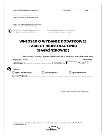 wniosek o wydanie dodatkowej tablicy rejestracyjnej (bagażnikowej)