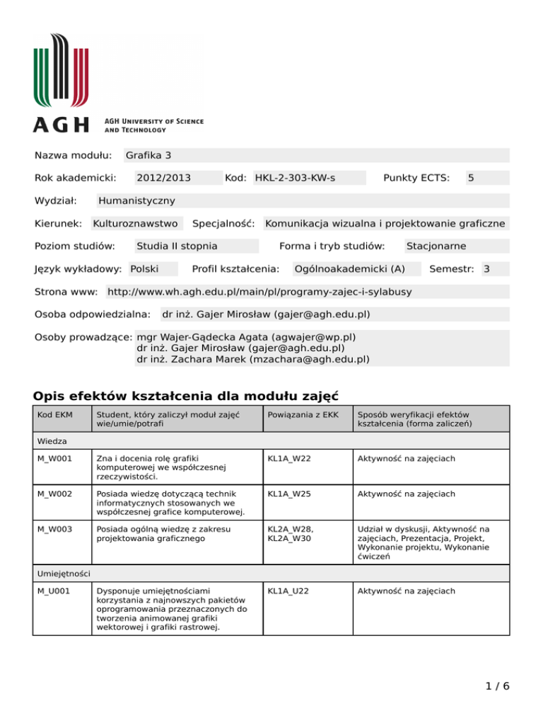 Nazwa modułu: Rok akademicki: Grafika 3 2012/2013 Wydział: Humanistyczny Kierunek: Kulturoznawstwo Poziom studiów: Kod: HKL-2-303-KW-s Specjalność: Studia II stopnia Język wykładowy: Polski Punkty ECTS: 5 Komunikacja wizualna i projektowanie graficzne Forma i tryb studiów: Profil kształcenia: Stacjonarne Ogólnoakademicki (A) Semestr: 3 Strona www: http://www.wh.agh.edu.pl/main/pl/programy-zajec-i-sylabusy Osoba odpowiedzialna: dr inż. Gajer Mirosław ([email protected]) Osoby prowadzące: mgr Wajer-Gądecka Agata ([email protected]) dr inż. Gajer Mirosław ([email protected]) dr inż. Zachara Marek ([email protected]) Opis efektów kształcenia dla modułu zajęć Kod EKM Student, który zaliczył moduł zajęć wie/umie/potrafi Powiązania z EKK Sposób weryfikacji efektów kształcenia (forma zaliczeń) M_W001 Zna i docenia rolę grafiki komputerowej we współczesnej rzeczywistości. KL1A_W22 Aktywność na zajęciach M_W002 Posiada wiedzę dotyczącą technik informatycznych stosowanych we współczesnej grafice komputerowej. KL1A_W25 Aktywność na zajęciach M_W003 Posiada ogólną wiedzę z zakresu projektowania graficznego KL2A_W28, KL2A_W30 Udział w dyskusji, Aktywność na zajęciach, Prezentacja, Projekt, Wykonanie projektu, Wykonanie ćwiczeń Dysponuje umiejętnościami korzystania z najnowszych pakietów oprogramowania przeznaczonych do tworzenia animowanej grafiki wektorowej i grafiki rastrowej. KL1A_U22 Aktywność na zajęciach Wiedza Umiejętności M_U001 1/6 Karta modułu - Grafika 3 M_U002 Posiada umiejętności pozwalające na wykorzystanie pakietów graficznych w prowadzonej działalności naukowej i badawczej. KL1A_U18 Aktywność na zajęciach M_U003 Umie przygotować i krytycznie analizować projekty graficzne. KL2A_U01, KL2A_U04, KL2A_U07 Aktywność na zajęciach, Prezentacja, Projekt, Udział w dyskusji, Wykonanie projektu, Wykonanie ćwiczeń Kompetencje społeczne M_K001 Rozumie potrzebę ciągłego pogłębiania i aktualizowania wiedzy w obszarze nowoczesnych technik informatycznych związanych z dziedziną współczesnej grafiki komputerowej. KL1A_K01 Aktywność na zajęciach M_K002 Posiada kompetencje niezbędne do pracy twórczej (organizacyjne, koncepcyjne, realizacyjne). KL2A_K02, KL2A_K03, KL2A_K05 Aktywność na zajęciach, Prezentacja, Projekt, Udział w dyskusji, Wykonanie projektu, Wykonanie ćwiczeń Matryca efektów kształcenia w odniesieniu do form zajęć Konwersatori um Zajęcia seminaryjne Zajęcia praktyczne Zajęcia terenowe Zajęcia warsztatowe Zna i docenia rolę grafiki komputerowej we współczesnej rzeczywistości. - - + + - - - - - - - M_W002 Posiada wiedzę dotyczącą technik informatycznych stosowanych we współczesnej grafice komputerowej. - - + - - - - - - - - M_W003 Posiada ogólną wiedzę z zakresu projektowania graficznego - - - + - - - - - - - M_U001 Dysponuje umiejętnościami korzystania z najnowszych pakietów oprogramowania przeznaczonych do tworzenia animowanej grafiki wektorowej i grafiki rastrowej. - - + - - - - - - - - M_U002 Posiada umiejętności pozwalające na wykorzystanie pakietów graficznych w prowadzonej działalności naukowej i badawczej. - - + - - - - - - - - E-learning Ćwiczenia projektowe M_W001 Inne Ćwiczenia laboratoryjne Forma zajęć Ćwiczenia audytoryjne Student, który zaliczył moduł zajęć wie/umie/potrafi Wykład Kod EKM Wiedza Umiejętności 2/6 Karta modułu - Grafika 3 M_U003 Umie przygotować i krytycznie analizować projekty graficzne. - - - + - - - - - - - Kompetencje społeczne M_K001 Rozumie potrzebę ciągłego pogłębiania i aktualizowania wiedzy w obszarze nowoczesnych technik informatycznych związanych z dziedziną współczesnej grafiki komputerowej. - - + + - - - - - - - M_K002 Posiada kompetencje niezbędne do pracy twórczej (organizacyjne, koncepcyjne, realizacyjne). - - - + - - - - - - - Treść modułu zajęć (program wykładów i pozostałych zajęć) Ćwiczenia laboratoryjne Wprowadzenie do systemów DTP Omówienie przykładowych zastosowań systemów DTP do projektowania i publikowania magazynów, ulotek, reklam, broszur i kalendarzy. Tworzenie zaawansowanych dokumentów PDF wyposażonych w dające się edytować pola tekstowe, przyciski, adnotacje i hasła. Tworzenia projektów publikacji o profesjonalnej jakości. Tworzenie inteligentnych dokumentów PDF. Praca z systemami DTP Zasady rozmieszczenia tekstu i grafiki na stronie. Zarządzanie pustymi przestrzeniami. projektowanie okładek. Praca z warstwami na stronie. Projektowanie i planowanie kolejnych stron dokumentów przeznaczonych do druku. Wykorzystanie elementów graficznych typu SVG. Numerowanie stron. Dopasowywanie tekstu do ścieżki. Zastosowanie języków skryptowych w edytorach DTP. Budowa stron www Definiowanie typu dokumentu, znaczniki HTML, style, sformatowane akapity, nagłówki, wydzielony blok tekstu, grupowanie elementów, znaczniki formatujące znaki, znaki specjalne (encje), tabele, formularze, łącza do innych stron, obrazy, komentarze i skrypty. Podstawowe zasady dotyczące tworzenia kodu HTML. Wstawianie w kodzie komentarzy. Deklarowanie typu dokumentu. Definiowanie tytułu dokumentu. Definiowanie domyślnej ścieżki. Definiowanie automatycznego odświeżania i przekierowania. Ustawianie koloru tła strony. Definiowanie obrazu w tle dokumentu. Podstawy tworzenia stron w języku HTML Wiersze, podziały wierszy i akapity. Ręczne wstawianie podziałów wierszy. Twarde spacje. Łączniki opcjonalne. Zachowanie formatowania. Wcięcia. Nagłówki. Linie poziome. Zagadnienia związane z grupowaniem elementów na stronie. Wprowadzenie do problematyki związanej z listami w języku HTML. Listy uporządkowane. Listy nieuporządkowane. Listy definicji. Listy zagnieżdżone. Wstawianie rysunków Przegląd formatów graficznych stosowanych w dokumentach www. Zagadnienia związane z kompresją obrazu. Opcje kompresji. Głębia kolorów. Metody zwiększania prędkości ładowania stro