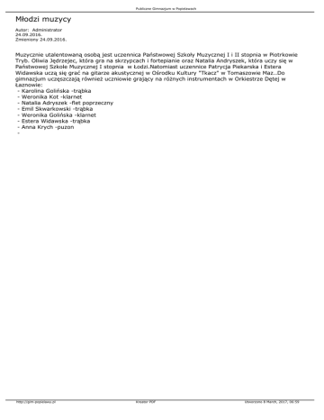 Publiczne Gimnazjum w Popielawach Młodzi muzycy Autor: Administrator 24.09.2016. Zmieniony 24.09.2016. Muzycznie utalentowaną osobą jest uczennica Państwowej Szkoły Muzycznej I i II stopnia w Piotrkowie Tryb. Oliwia Jędrzejec, która gra na skrzypcach i fortepianie oraz Natalia Andryszek, która uczy się w Państwowej Szkole Muzycznej I stopnia w Łodzi.Natomiast uczennice Patrycja Piekarska i Estera Widawska uczą się grać na gitarze akustycznej w Ośrodku Kultury "Tkacz" w Tomaszowie Maz..Do gimnazjum uczęszczają również uczniowie grający na różnych instrumentach w Orkiestrze Dętej w Łaznowie: - Karolina Golińska -trąbka - Weronika Kot -klarnet - Natalia Adryszek -flet poprzeczny - Emil Skwarkowski -trąbka - Weronika Golińska -klarnet - Estera Widawska -trąbka - Anna Krych -puzon - http://gim-popielawy.pl Kreator PDF Utworzono 8 March, 2017, 06:59