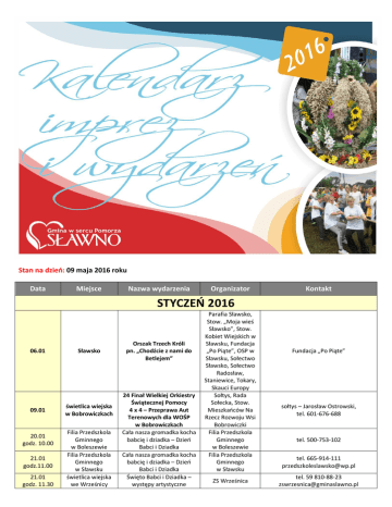 Stan na dzień: 09 maja 2016 roku Data Miejsce Nazwa wydarzenia Organizator Kontakt STYCZEŃ 2016 06.01 09.01 20.01 godz. 10.00 21.01 godz.11.00 21.01 godz. 11.30 Sławsko świetlica wiejska w Bobrowiczkach Filia Przedszkola Gminnego w Boleszewie Filia Przedszkola Gminnego w Sławsku świetlica wiejska we Wrześnicy Orszak Trzech Króli pn. „Chodźcie z nami do Betlejem” 24 Finał Wielkiej Orkiestry Świątecznej Pomocy 4 x 4 – Przeprawa Aut Terenowych dla WOŚP w Bobrowiczkach Cała nasza gromadka kocha babcię i dziadka – Dzień Babci i Dziadka Cała nasza gromadka kocha babcię i dziadka – Dzień Babci i Dziadka Święto Babci i Dziadka – występy artystyczne Parafia Sławsko, Stow. „Moja wieś Sławsko”, Stow. Kobiet Wiejskich w Sławsku, Fundacja „Po Piąte”, OSP w Sławsku, Sołectwo Sławsko, Sołectwo Radosław, Staniewice, Tokary, Skauci Europy Sołtys, Rada Sołecka, Stow. Mieszkańców Na Rzecz Rozwoju Wsi Bobrowiczki Filia Przedszkola Gminnego w Boleszewie Filia Przedszkola Gminnego w Sławsku ZS Wrześnica Fundacja „Po Piąte” sołtys – Jarosław Ostrowski, tel. 601-676-688 tel. 500-753-102 tel. 665-914-111 [email protected] tel. 59 810-88-23 [email protected] Data Miejsce 22.01 godz. 10.00 świetlica wiejska w Sławsku Przedszkole Gminne w Gwiazdowie 22.01 godz.11.00 Nazwa wydarzenia Dzień Seniora Cała nasza gromadka kocha babcię i dziadka – Dzień Babci i Dziadka Dzień Babci i Dziadka oraz zabawa choinkowa dla dzieci Organizator Kontakt ZS Sławsko, Rada Rodziców SP Przedszkole Gminne w Gwiazdowie tel./fax. 59 810-38-02 [email protected] tel. 59 858-22-20 [email protected] 22.01 świetlica wiejska w Janiewicach Sołtys, Rada Sołecka sołtys – Wioletta Łysko tel. 535-417-926 22.01 SP w Bobrowicach Dzień Babci i Dziadka SP Bobrowice tel./fax. 59 810-33 14 [email protected] Noworoczne Spotkanie Seniorów połączone z Dniem Babci i Dziadka Sołtys, Rada Sołecka, Koło Gospodyń Wiejskich we Wrześnicy 23.01 godz. 16.00 świetlica wiejska we Wrześnicy sołtys – Agnieszka Szczepaniec tel. 535-418-193 23.01 godz. 16.00 świetlica wiejska w Tychowie SP Warszkowo tel. 59 810 54 13 [email protected] 23.01 świetlica wiejska w Brześciu Sołtys, Rada Sołecka sołtys – Dorota Skrobek, tel. 664-479-114 28.01. godz. 10.00 Filia Przedszkola Gminnego w Sławsku Filia Przedszkola Gminnego w Sławsku tel. 665-914-111 [email protected] 29.01 godz. 9.00 Filia Przedszkola Gminnego w Boleszewie Filia Przedszkola Gminnego w Boleszewie tel. 500-753-102 29.01 godz. 10.00 Przedszkole Gminne w Gwiazdowie Przedszkole Gminne w Gwiazdowie tel. 59 858-22-20 [email protected] 29.01 godz. 15.00 ZS w Sławsku ZS Sławsko, Rada Rodziców G tel./fax. 59 810-38-02 [email protected] 29.01 godz. 17.00 świetlica wiejska w Pomiłowie Świetlica Wiejska, SP Warszkowo tel. 59 810 54 13 [email protected] 29.01 ZS we Wrzesnicy Bal karnawałowy ZS Wrześnica 29.01 SP w Warszkowie Bal karnawałowy dla uczniów SP Warszkowo SP Warszkowo 29.01 SP w Bobrowicach Dzień Babci i Dziadka SP Bobrowice 29.01 ZS w Sławsku Zabawa karnawałowa dla dzieci i młodzieży, uczniów Zespołu Szkół w Sławsku ZS Sławsko, Rada Rodziców SP i G tel./fax. 59 810-38-02 [email protected] 30.01 świetlica wiejska w Bobrowiczkach Zabawa choinkowa dla dzieci Sołtys, Rada Sołecka, Świetlica Wiejska sołtys – Jarosław Ostrowski, tel. 601-676-688 30.01 świetlica wiejska w Łętowie Dzień Babci i Dziadka Sołtys, Rada Sołecka, Świetlica Wiejska sołtys – Karol Kruk tel. 535-418-411 opiekun świetlicy – Agnieszka Kiedrowicz tel. 59 846-10-56 30.01 świetlica wiejska w Sławsku Wieczór Seniora Sołtys, Rada Sołecka, Stow. Kobiet Wiejskich sołtys – Mariusz Krzymiński tel. 535-416-681 Jasełka Bożonarodzeniowe – przedstawienie dla społeczności lokalnej Zabawa choinkowa dla dzieci oraz Dzień Babci i Dzień Dziadka dla mieszkańców Brześcia „Dziś w przedszkolu śpiew i tańce, tańczą różne przebierańce” – bal karnawałowy „Dziś w przedszkolu śpiew i tańce, tańczą różne przebierańce” – bal karnawałowy „Dziś w przedszkolu śpiew i tańce, tańczą różne przebierańce” – bal karnawałowy Połowinki dla klas II gimnazjum Jasełka Bożonarodzeniowe – przedstawienie dla społeczności lokalnej Pomiłowa tel. 59 810-88-23 [email protected] tel. 59 810 54 13 [email protected] tel./fax. 59 810-33 14 [email protected] Data Miejsce Nazwa wydarzenia Organizator Kontakt 30.01 świetlica wiejska w Bobrowicach Zabawa karnawałowa dla dzieci i młodzieży z Bobrowic Świetlica Wiejska opiekun świetlicy – Sylwia Ozdoba tel. 507-588-188 [email protected] LUTY 2016 06.02 świetlica wiejska w Bobrowicach Zabawa karnawałowa dla dorosłych Świetlica Wiejska 06.02 świetlica wiejska w Łętowie Zabawa karnawałowa dla dzieci Świetlica Wiejska 07.02 godz. 17.00 świetlica przy OSP w Starym Krakowie Zabawa choinkowa Sołtys, Rada Sołecka, Świetlica Wiejska 13.02 świetlica wiejska w Bobrowicach Walentynkowe spotkanie rodzinne Świetlica Wiejska SP Warszkowo Dzień patrona Szkoły Podstawowej w Warszkowie – uroczysta akademia SP Warszkowo 26.02 opiekun świetlicy – Sylwia Ozdoba tel. 507-588-188 [email protected] opiekun świetlicy – Agnieszka Kiedrowicz tel. 59 846-10-56 sołtys – Mateusz Łanik tel. 663-114-994 opiekun świetlicy – o. Rafał tel. 500-125-031 opiekun świetlicy – Sylwia Ozdoba tel. 507-588-188 [email protected] tel. 59 810 54 13 [email protected] MARZEC 2016 marzec 01.03 godz. 11.00 02.03 godz. 11.00 03.03 godz. 11.00 ZS we Wrześnicy Tydzień dobrych uczynków ZS Wrześnica Przedszkole Gminne w Gwiazdowie Filia Przedszkola Gminnego w Sławsku Filia Przedszkola Gminnego w Boleszewie „Baw, ucz się i rośnij z nami” – dzień otwarty przedszkola „Baw, ucz się i rośnij z nami” – dzień otwarty przedszkola „Baw, ucz się i rośnij z nami” – dzień otwarty przedszkola Dzień Pamięci Żołnierzy Wyklętych Gość