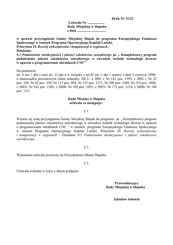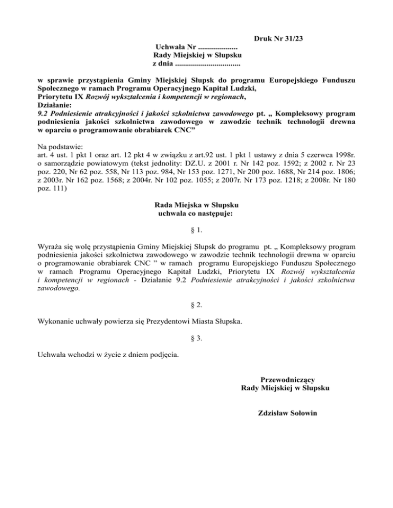 Druk Nr 31/23 Uchwała Nr .................... Rady Miejskiej w Słupsku z dnia ................................. w sprawie przystąpienia Gminy Miejskiej Słupsk do programu Europejskiego Funduszu Społecznego w ramach Programu Operacyjnego Kapitał Ludzki, Priorytetu IX Rozwój wykształcenia i kompetencji w regionach, Działanie: 9.2 Podniesienie atrakcyjności i jakości szkolnictwa zawodowego pt. „ Kompleksowy program podniesienia jakości szkolnictwa zawodowego w zawodzie technik technologii drewna w oparciu o programowanie obrabiarek CNC” Na podstawie: art. 4 ust. 1 pkt 1 oraz art. 12 pkt 4 w związku z art.92 ust. 1 pkt 1 ustawy z dnia 5 czerwca 1998r. o samorządzie powiatowym (tekst jednolity: DZ.U. z 2001 r. Nr 142 poz. 1592; z 2002 r. Nr 23 poz. 220, Nr 62 poz. 558, Nr 113 poz. 984, Nr 153 poz. 1271, Nr 200 poz. 1688, Nr 214 poz. 1806; z 2003r. Nr 162 poz. 1568; z 2004r. Nr 102 poz. 1055; z 2007r. Nr 173 poz. 1218; z 2008r. Nr 180 poz. 111) Rada Miejska w Słupsku uchwala co następuje: § 1. Wyraża się wolę przystąpienia Gminy Miejskiej Słupsk do programu pt. „ Kompleksowy program podniesienia jakości szkolnictwa zawodowego w zawodzie technik technologii drewna w oparciu o programowanie obrabiarek CNC ” w ramach programu Europejskiego Funduszu Społecznego w ramach Programu Operacyjnego Kapitał Ludzki, Priorytetu IX Rozwój wykształcenia i kompetencji w regionach - Działanie 9.2 Podniesienie atrakcyjności i jakości szkolnictwa zawodowego. § 2. Wykonanie uchwały powierza się Prezydentowi Miasta Słupska. § 3. Uchwała wchodzi w życie z dniem podjęcia. Przewodniczący Rady Miejskiej w Słupsku Zdzisław Sołowin UZASADNIENIE 1.Przedstawienie istniejącego stanu. W roku szkolnym 2008/2009 będą realizowane zajęcia dodatkowe dla uczniów i nauczycieli ze środków Unii Europejskiej przyznanych przez Departament Europejskiego Funduszu Społecznego Urzędu Marszałkowskiego Gdańsku w ramach konkursu 9.2 Podniesienie atrakcyjności i jakości szkolnictwa zawodowego. 2.Wyjaśnienie potrzeb i celu podjęcia uchwały. W ramach konkursu 9.2 Podniesienie atrakcyjności i jakości szkolnictwa zawodowego, wniosek Zespołu Szkół Ogólnokształcących i Technicznych: „Kompleksowy program podniesienia jakości szkolnictwa zawodowego w zawodzie technolog drewna w oparciu o oprogramowanie obrabiarek CNC”, został rozpatrzony pozytywnie i otrzymały dofinansowanie w kwocie 278.667,50. Otrzymane środki zostaną przeznaczone na szkolenia dla uczniów w ramach projektu. 3.Wskazanie różnic miedzy dotychczasowym a projektowanym stanem prawnym. „ Kompleksowy program podniesienia jakości szkolnictwa zawodowego w zawodzie technolog drewna w oparciu o oprogramowanie obrabiarek CNC”, oparty jest na pracy z uczniami na pozalekcyjnych zajęciach z zakresu szkolnictwa zawodowego, języka obcego zawodowego oraz algorytmów,które odbywać się będą na terenie szkoły. Dodatkowe zajęcia wpłyną pozytywnie na podniesienia jakości szkolnictwa zawodowego i zapoznanie uczniów z najnowszymi rozwiązaniami technicznymi maszyn i urządzeń do obróbki drewna. 4.Charekterystyka przewidywanych skutków społecznych i gospodarczych. Pozyskanie dodatkowych środków wpłynie na podniesienie jakości szkolnictwa zawodowego oraz da możliwość zdobycia nowych umiejętności uczniom Szkoły. 5.Skutki finansowe związane z wejściem uchwały. Projekt finansowany jest przez Europejski Fundusz Społeczny . 6.Źródła finansowania. Europejski Fundusz Społeczny.