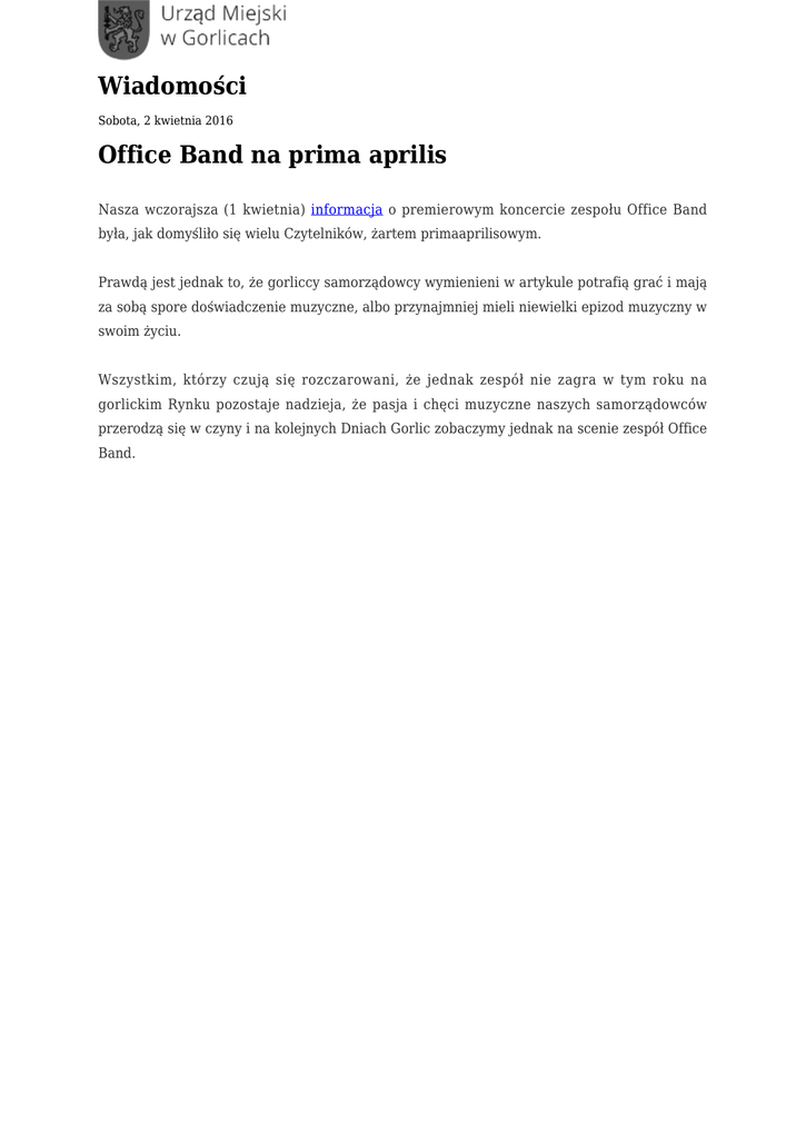 Wiadomości Sobota, 2 kwietnia 2016 Office Band na prima aprilis Nasza wczorajsza (1 kwietnia) informacja o premierowym koncercie zespołu Office Band była, jak domyśliło się wielu Czytelników, żartem primaaprilisowym. Prawdą jest jednak to, że gorliccy samorządowcy wymienieni w artykule potrafią grać i mają za sobą spore doświadczenie muzyczne, albo przynajmniej mieli niewielki epizod muzyczny w swoim życiu. Wszystkim, którzy czują się rozczarowani, że jednak zespół nie zagra w tym roku na gorlickim Rynku pozostaje nadzieja, że pasja i chęci muzyczne naszych samorządowców przerodzą się w czyny i na kolejnych Dniach Gorlic zobaczymy jednak na scenie zespół Office Band.