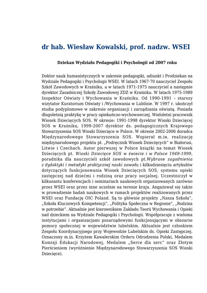 dr hab. Wiesław Kowalski, prof. nadzw. WSEI Dziekan Wydziału Pedagogiki i Psychologii od 2007 roku Doktor nauk humanistycznych w zakresie pedagogiki, adiunkt i Prodziekan na Wydziale Pedagogiki i Psychologii WSEI. W latach 1967-70 nauczyciel Zespołu Szkół Zawodowych w Kraśniku, a w latach 1971-1975 nauczyciel a następnie dyrektor Zasadniczej Szkoły Zawodowej ZDZ w Kraśniku. W latach 1975-1989 Inspektor Oświaty i Wychowania w Kraśniku. Od 1990-1991 – starszy wizytator Kuratorium Oświaty i /Wychowania w Lublinie. W 1997 r. ukończył studia podyplomowe w zakresie organizacji i zarządzania oświatą. Posiada długoletnią praktykę w pracy opiekuńczo-wychowawczej. Wieloletni pracownik Wiosek Dziecięcych SOS. W okresie: 1991-1998 dyrektor Wioski Dziecięcej SOS w Kraśniku, 1999-2007 dyrektor ds. pedagogicznych Krajowego Stowarzyszenia SOS Wioski Dziecięce w Polsce. W okresie 2002-2006 doradca Międzynarodowego Stowarzyszenia SOS. Wspierał m.in. realizację międzynarodowego projektu pt. „Podręcznik Wiosek Dziecięcych” w Białorusi, Litwie i Czechach. Autor pierwszej w Polsce książki na temat Wiosek Dziecięcych pt. Wioski Dziecięce SOS w świecie i w Polsce 1949‑1999, poradnika dla nauczycieli szkół zawodowych pt.Wybrane zagadnienia z dydaktyki i metodyki praktycznej nauki zawodu i kilkudziesięciu artykułów dotyczących funkcjonowania Wiosek Dziecięcych SOS, systemu opieki zastępczej nad dziećmi i rodziną oraz pracy socjalnej. Uczestniczył w kilkunastu konferencjach i seminariach naukowych organizowanych zarówno przez WSEI oraz przez inne uczelnie na terenie kraju. Angażował się także w prowadzenie badań naukowych w ramach projektów realizowanych przez WSEI oraz Fundację OIC Poland. Są to głównie projekty „Nasza Szkoła”, „Szkoła Kluczowych Kompetencji”, „Polityka Społeczna w Regionie”, „Rodzina w potrzebie”. Aktualnie jest kierownikiem Zakładu Teorii Wychowania i Opieki nad dzieckiem na Wydziale Pedagogiki i Psychologii. Współpracuje z wieloma instytucjami i organizacjami pozarządowymi funkcjonującymi w obszarze pomocy społecznej w województwie lubelskim. Aktualnie jest członkiem Zespołu Koordynacyjnego przy Wojewodzie Lubelskim ds. Opieki Zastępczej. Oznaczony m.in. Krzyżem Kawalerskim Orderu Odrodzenia Polski, Medalem Komisji Edukacji Narodowej, Medalem „Serce dla serc” oraz Złotym Pierścieniem (wyróżnienie Międzynarodowego Stowarzyszenia SOS Wioski Dziecięce).