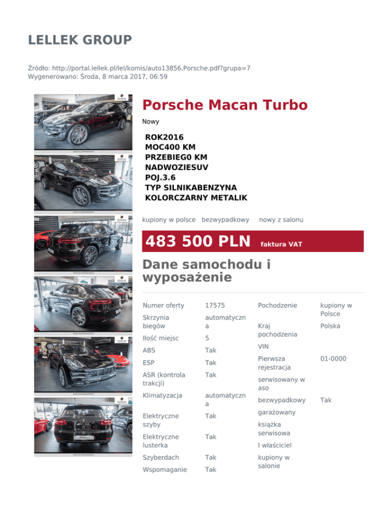LELLEK GROUP Źródło: http://portal.lellek.pl/lel/komis/auto13856,Porsche.pdf?grupa=7 Wygenerowano: Środa, 8 marca 2017, 06:59 Porsche Macan Turbo Nowy ROK2016 MOC400 KM PRZEBIEG0 KM NADWOZIESUV POJ.3.6 TYP SILNIKABENZYNA KOLORCZARNY METALIK kupiony w polsce bezwypadkowy nowy z salonu 483 500 PLN faktura VAT Dane samochodu i wyposażenie Numer oferty 17575 Skrzynia biegów automatyczn a Ilość miejsc 5 ABS Tak ESP Tak ASR (kontrola trakcji) Tak Klimatyzacja automatyczn a Elektryczne szyby Tak Elektryczne lusterka Tak Szyberdach Tak Wspomaganie Tak Pochodzenie kupiony w Polsce Kraj pochodzenia Polska VIN Pierwsza rejestracja 01-0000 serwisowany w aso bezwypadkowy garażowany książka serwisowa I właściciel kupiony w salonie Tak kierownicy tunning Komputer Tak homologacja Radioodtwarza cz Tak stan idealny Alarm Tak właściciel niepalący Immobilizer Tak Centralny zamek Tak Nawigacja satelitarna Tak Światła przeciwmgieln e Tak Czujnik deszczu Tak Czujniki parkowania Tak Kierownica wielofunkcyjna Tak Podgrzewane fotele Tak Zaw. pneumatyczne Tak Tempomat Tak 4x4 Tak Kamera cofania Tak System Start-Stop Tak Światła LED Tak Alufelgi Tak Miejsce postoju Sopot Opis dodatkowy Kolor nadwozia: 2T Jet Black Czarny Tapicerka wnętrza: VK Black pełna skóra 0TD Dywaniki welurowe 1BK Zawieszenie pneumatyczne, aktywne PASM 1N3 Wspomaganie układu kierowniczego PLUS 2FX Podgrzewana kierownica wielofunkcyjna wykończona włóknem węglowym 3FU Dach panoramiczny 4A3 Podgrzewane fotele przednie i tylne 4D3 Wentylacja foteli z przodu 4F2 System Entry&Drive 5MH Pakiet wykończenia włóknem węglowym 6FB Lusterka Sport Design 7UG PCM z modułem nawigacji 7F4 Dźwignia zmiany biegów wykończona w aluminium 7X8 Asystentem parkowania (przód i tył) z kamerą cofania 8EX Reflektory LED z PDLS Plus 9JB Pakiet dla palących C7T Obręcze kół 21' 911 Turbo Design Q1J Sportowe siedzenia 18-pozycyjne z pamięcią QR5 Pakiet Sport Chrono QJ4 Pakiet wykończenia nadwozia w kolorze czarnym PA2 Automatycznie przyciemniane lusterka PP8 Pakiet komfortowego oświetlenia VW1 Dyskretne szyby IV2 Connect Plus Informacje od handlowca KONTAKTY: Michał Michałowski | Doradca ds. Sprzedaży E-mail: [email protected] , Telefon: +48 696 444 222 Daniel Komisarczyk | Doradca ds. Sprzedaży E-mail: [email protected] , Telefon: +48 602 312 777 Adam Wąsik | Doradca ds. Sprzedaży E-mail: [email protected] , Telefon: +48 785 911 103 Aleksander Chrzan | Doradca ds. Sprzedaży E-mail: [email protected] , Telefon: +48 605 260 615 Michał Bartoszewicz | Doradca ds. Sprzedaży E-mail: [email protected] , Tel: +48 669 910 911 Informacja nie stanowi oferty w rozumieniu art. 66kc. Podane dane maja charakter wyłącznie informacyjny Nota prawna Informacja nie stanowi oferty w rozumieniu art. 66 Kodeksu Cywilnego. Podane dane mają charakter wyłącznie informacyjny. Pełna informacja dostępna jest u handlowca. Sprzedający nie odpowiada za ewentualne błędy lub nieaktualność ogłoszenia. Handlowiec Michał Michałowski +48 58 550 911 2 zapytaj mobile +48 696 444 222 Charakterystyka spalania cykl miejski 11.8 l/100km cykl pozamiejski 7.8 l/100km cykl mieszany 8.2 l/100km emisja CO2 216 g/km Gwarancja Gwarancja dostępna Ubezpieczenie Ubezpieczenie dostępne Kredyt Kredyt dostępny Zeskanuj kod, aby zobaczyć ofertę online