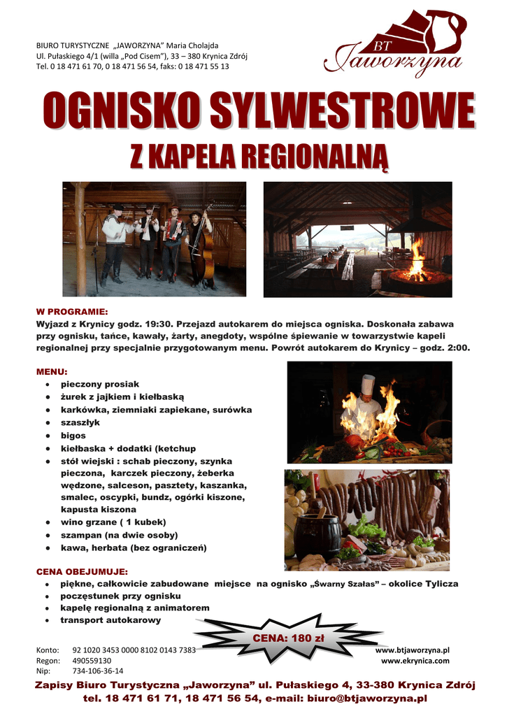 BIURO TURYSTYCZNE „JAWORZYNA” Maria Cholajda Ul. Pułaskiego 4/1 (willa „Pod Cisem”), 33 – 380 Krynica Zdrój Tel. 0 18 471 61 70, 0 18 471 56 54, faks: 0 18 471 55 13 OGNISKO SYLWESTROWE Z KAPELA REGIONALNĄ W PROGRAMIE: Wyjazd z Krynicy godz. 19:30. Przejazd autokarem do miejsca ogniska. Doskonała zabawa przy ognisku, tańce, kawały, żarty, anegdoty, wspólne śpiewanie w towarzystwie kapeli regionalnej przy specjalnie przygotowanym menu. Powrót autokarem do Krynicy – godz. 2:00. MENU: pieczony prosiak żurek z jajkiem i kiełbaską karkówka, ziemniaki zapiekane, surówka szaszłyk bigos kiełbaska + dodatki (ketchup stół wiejski : schab pieczony, szynka pieczona, karczek pieczony, żeberka wędzone, salceson, pasztety, kaszanka, smalec, oscypki, bundz, ogórki kiszone, kapusta kiszona wino grzane ( 1 kubek) szampan (na dwie osoby) kawa, herbata (bez ograniczeń) CENA OBEJUMUJE: piękne, całkowicie zabudowane miejsce na ognisko „Śwarny Szałas” – okolice Tylicza poczęstunek przy ognisku kapelę regionalną z animatorem transport autokarowy CENA: 180 zł Konto: Regon: Nip: 92 1020 3453 0000 8102 0143 7383 490559130 734-106-36-14 www.btjaworzyna.pl www.ekrynica.com