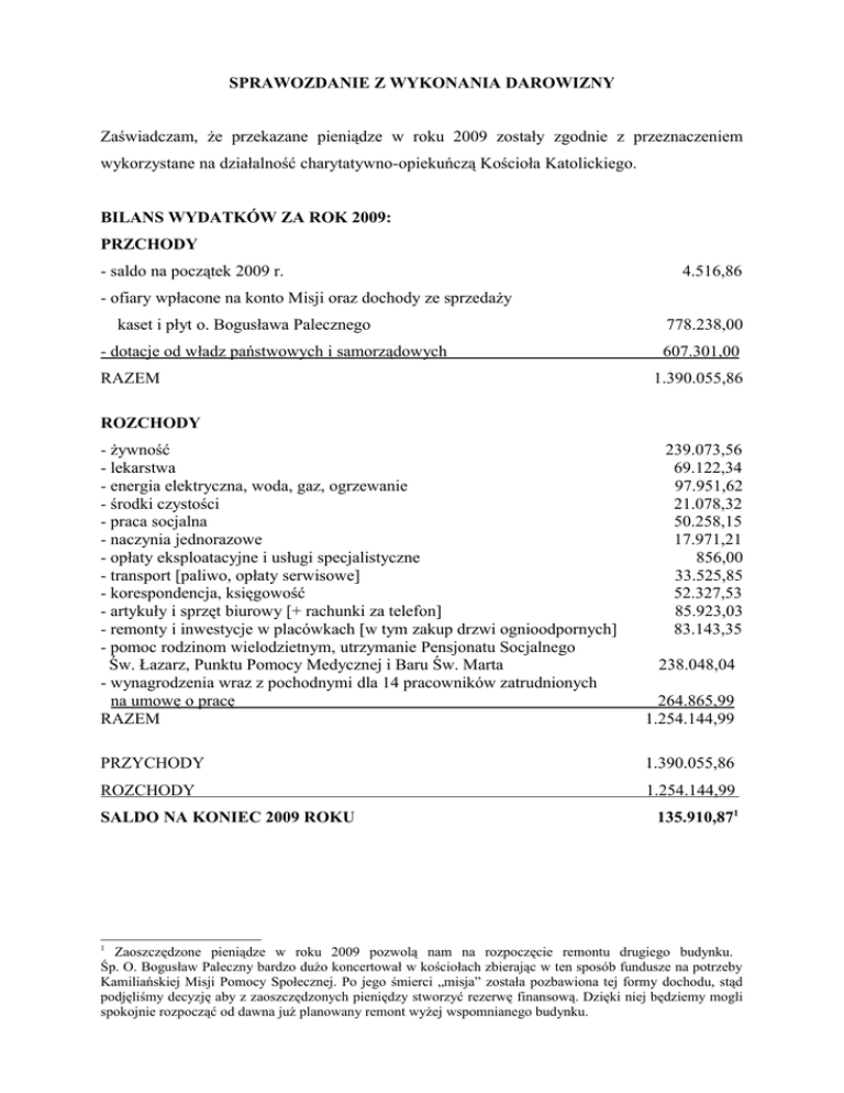 SPRAWOZDANIE Z WYKONANIA DAROWIZNY Zaświadczam, że przekazane pieniądze w roku 2009 zostały zgodnie z przeznaczeniem wykorzystane na działalność charytatywno-opiekuńczą Kościoła Katolickiego. BILANS WYDATKÓW ZA ROK 2009: PRZCHODY - saldo na początek 2009 r. 4.516,86 - ofiary wpłacone na konto Misji oraz dochody ze sprzedaży kaset i płyt o. Bogusława Palecznego - dotacje od władz państwowych i samorządowych RAZEM 778.238,00 607.301,00 1.390.055,86 ROZCHODY - żywność - lekarstwa - energia elektryczna, woda, gaz, ogrzewanie - środki czystości - praca socjalna - naczynia jednorazowe - opłaty eksploatacyjne i usługi specjalistyczne - transport [paliwo, opłaty serwisowe] - korespondencja, księgowość - artykuły i sprzęt biurowy [+ rachunki za telefon] - remonty i inwestycje w placówkach [w tym zakup drzwi ognioodpornych] - pomoc rodzinom wielodzietnym, utrzymanie Pensjonatu Socjalnego Św. Łazarz, Punktu Pomocy Medycznej i Baru Św. Marta - wynagrodzenia wraz z pochodnymi dla 14 pracowników zatrudnionych na umowę o pracę RAZEM 264.865,99 1.254.144,99 PRZYCHODY 1.390.055,86 ROZCHODY 1.254.144,99 SALDO NA KONIEC 2009 ROKU 1 239.073,56 69.122,34 97.951,62 21.078,32 50.258,15 17.971,21 856,00 33.525,85 52.327,53 85.923,03 83.143,35 238.048,04 135.910,871 Zaoszczędzone pieniądze w roku 2009 pozwolą nam na rozpoczęcie remontu drugiego budynku. Śp. O. Bogusław Paleczny bardzo dużo koncertował w kościołach zbierając w ten sposób fundusze na potrzeby Kamiliańskiej Misji Pomocy Społecznej. Po jego śmierci „misja” została pozbawiona tej formy dochodu, stąd podjęliśmy decyzję aby z zaoszczędzonych pieniędzy stworzyć rezerwę finansową. Dzięki niej będziemy mogli spokojnie rozpocząć od dawna już planowany remont wyżej wspomnianego budynku.