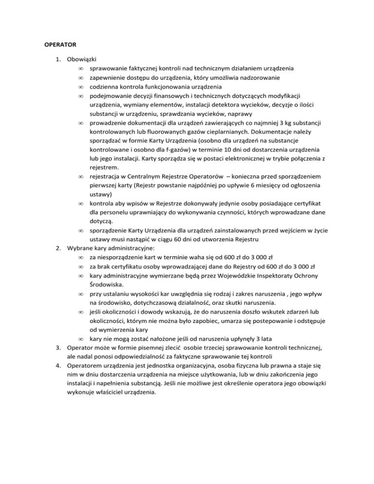 OPERATOR 1. Obowiązki • sprawowanie faktycznej kontroli nad technicznym działaniem urządzenia • zapewnienie dostępu do urządzenia, który umożliwia nadzorowanie • codzienna kontrola funkcjonowania urządzenia • podejmowanie decyzji finansowych i technicznych dotyczących modyfikacji urządzenia, wymiany elementów, instalacji detektora wycieków, decyzje o ilości substancji w urządzeniu, sprawdzania wycieków, naprawy • prowadzenie dokumentacji dla urządzeń zawierających co najmniej 3 kg substancji kontrolowanych lub fluorowanych gazów cieplarnianych. Dokumentacje należy sporządzać w formie Karty Urządzenia (osobno dla urządzeń na substancje kontrolowane i osobno dla f-gazów) w terminie 10 dni od dostarczenia urządzenia lub jego instalacji. Karty sporządza się w postaci elektronicznej w trybie połączenia z rejestrem. • rejestracja w Centralnym Rejestrze Operatorów – konieczna przed sporządzeniem pierwszej karty (Rejestr powstanie najpóźniej po upływie 6 miesięcy od ogłoszenia ustawy) • kontrola aby wpisów w Rejestrze dokonywały jedynie osoby posiadające certyfikat dla personelu uprawniający do wykonywania czynności, których wprowadzane dane dotyczą. • sporządzenie Karty Urządzenia dla urządzeń zainstalowanych przed wejściem w życie ustawy musi nastąpić w ciągu 60 dni od utworzenia Rejestru 2. Wybrane kary administracyjne: • za niesporządzenie kart w terminie waha się od 600 zł do 3 000 zł • za brak certyfikatu osoby wprowadzającej dane do Rejestry od 600 zł do 3 000 zł • kary administracyjne wymierzane będą przez Wojewódzkie Inspektoraty Ochrony Środowiska. • przy ustalaniu wysokości kar uwzględnia się rodzaj i zakres naruszenia , jego wpływ na środowisko, dotychczasową działalność, oraz skutki naruszenia. • jeśli okoliczności i dowody wskazują, że do naruszenia doszło wskutek zdarzeń lub okoliczności, którym nie można było zapobiec, umarza się postepowanie i odstępuje od wymierzenia kary • kary nie mogą zostać nałożone jeśli od naruszenia upłynęły 3 lata 3. Operator może w formie pisemnej zlecić osobie trzeciej sprawowanie kontroli technicznej, ale nadal ponosi odpowiedzialność za faktyczne sprawowanie tej kontroli 4. Operatorem urządzenia jest jednostka organizacyjna, osoba fizyczna lub prawna a staje się nim w dniu dostarczenia urządzenia na miejsce użytkowania, lub w dniu zakończenia jego instalacji i napełnienia substancją. Jeśli nie możliwe jest określenie operatora jego obowiązki wykonuje właściciel urządzenia.