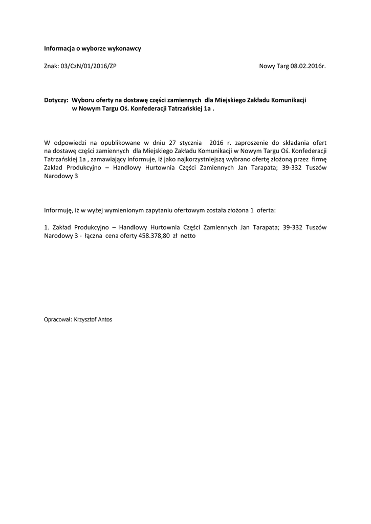 Informacja o wyborze wykonawcy Znak: 03/CzN/01/2016/ZP Nowy Targ 08.02.2016r. Dotyczy: Wyboru oferty na dostawę części zamiennych dla Miejskiego Zakładu Komunikacji w Nowym Targu Oś. Konfederacji Tatrzańskiej 1a . W odpowiedzi na opublikowane w dniu 27 stycznia 2016 r. zaproszenie do składania ofert na dostawę części zamiennych dla Miejskiego Zakładu Komunikacji w Nowym Targu Oś. Konfederacji Tatrzańskiej 1a , zamawiający informuje, iż jako najkorzystniejszą wybrano ofertę złożoną przez firmę Zakład Produkcyjno – Handlowy Hurtownia Części Zamiennych Jan Tarapata; 39-332 Tuszów Narodowy 3 Informuję, iż w wyżej wymienionym zapytaniu ofertowym została złożona 1 oferta: 1. Zakład Produkcyjno – Handlowy Hurtownia Części Zamiennych Jan Tarapata; 39-332 Tuszów Narodowy 3 - łączna cena oferty 458.378,80 zł netto Opracował: Krzysztof Antos