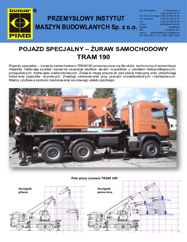 05-230 Kobyłka, PRZEMYSŁOWY INSTYTUT MASZYN BUDOWLANYCH Sp. z o.o. ul. Napoleona 2 www.pimb.com.pl Tel. Prezes Zarządu: (+48 22) 786 23 26 Tel. Centrala: (+48 22) 768 18 31 Fax: ( +48 22) 786 18 30 E-mail: pimb@pimb. com. pl REGON: 141384698 NIP: 125-00-00 -237 Konto: BANK PEKAO SA O/Wołomin 38 1240 6074 1111 0000 4999 2487 POJAZD SPECJALNY – śURAW SAMOCHODOWY TRAM 190 Pojazdy specjalne – Ŝuraw ie samochodow e TRAM190 przeznaczone są dla słuŜb technicznych komunikacji miejskiej. Ułatw iają szybkie i spraw ne usuwanie skutków aw arii i wypadków z udziałem niskopodłogowych, przegubowych, tramw ajów wieloczłonowych. śuraw ie mogą pracow ać pod siecią trakcyjną oraz umoŜliwiają holow anie pojazdów szynowych. Znajdują zastosow anie przy pracach przeładunkowych i montaŜowych. Walory uŜytkow e podnosi zastosowanie szynowego układu jezdnego. Pole pracy żurawia TRAM 190 Wysięgnik główny Wysięgnik pomocniczy 1. DANE OGÓLNE Producent Przemysłowy Instytut Maszyn Budowla nych Sp. z o. o. Kobyłka k/ Warszawy Typ maszyny Podwozie Przeznaczenie TRAM 190 SCANIA R400CB6x4EHZ CR19 - terenowe do usuwania skutków awarii, kolizji i wy padk ów tramwajowych Maksymalny udźwig - wysięgnik głów ny - wysięgnik pomocniczy Maksymalny moment udźwigu Maksymalna wysokość podnoszenia - na wysięgniku g łównym - na wysięgniku pomocniczym Grupa klasyfikacyjna żurawia samojezdnego wg PN-ISO 4301-2:1998 6,2m 8,5m A1 Charakterystyka środowiska pracy - temperatura miejsca pracy - względna wilgotność pow ietrza od -25ºC do 40ºC średnia 80% przy temperaturze 20ºC Dopuszczalna prędkość wiatru - stan roboczy - stan spoczynku 6 st. Beauforta - 12,5m/s nie limitowany 16t przy wysięg u 5,5m 19 t przy wysięgu 4,8m 912 k Nm 1.1 Podstawowe dane podwozia Typ silnika czterosuwowy z zapłonem samoczynnym, bezpośre dni wtry sk pal iwa - EURO 5 Liczba i układ cylindrów Pojemność skokowa silnika Moc maksymalna 6 w ukła dzie rzędowym 12 740 cm3 400 KM/ 294 kW przy 1900 obr/min Moment maksymalny Dopuszczalna masa całkowita Masa własna podwozia Rozstaw osi 1 i 2 Rozstaw osi 2 i 3 Opony 2100Nm w zakresie 1000-1300 obr/min 26 000 kg 10 200 kg 3 700 mm 1 445 mm przód 385/65R22.5 tył 315/ 80R22,5 1.2 Podstawowe dane żurawia Maksymalna prędkość pojazdu - transportowa na kołach - jazda po torach szynowych (napęd hydrostatyczny) Maksymalna zdolność pokonywania wzniesień - na kołach ogumionych - na kołach szynowych Napęd mechanizmów roboczych Kąt obrotu nadwozia - pod obciążeniem - bez obciążenia Prędkość ruchów roboczych - prędkość liny wciągark i - czas zmiany wysięgu - podnoszenia - opuszczania - czas teleskopowania - wysuwanie - zsuwania - czas rozstawu podpór Rozstaw podpór - podłużny - poprzeczny zsunięty - poprzeczny rozsunięty Miejsce sterowania - podporami - wózkami do jazdy po szynach - mechanizmami roboczymi Sposób sterowania w trybie roboczym - podporami - wózkiem do jazdy po szynach - mechanizmami roboczymi Sposób sterowania w trybie awaryjnym Rodzaj i napięcie prądu - sterowanie - oświetlenie 90 km/h do 15 km/h 40% 5% hydra uliczny 270º n x 360º 0 - 52 m/min 35 sek 20 sek 41 sek 20 sek 50 sek 5,00 m 2,27 m 5,03 m przy podporach z kabiny podwozia z kabiny operatora ręczne - hydrauliczne elektrohydrauliczne elektrohydrauliczne ręczne oddziaływanie na elementy sterujące stały 24V stały 24V