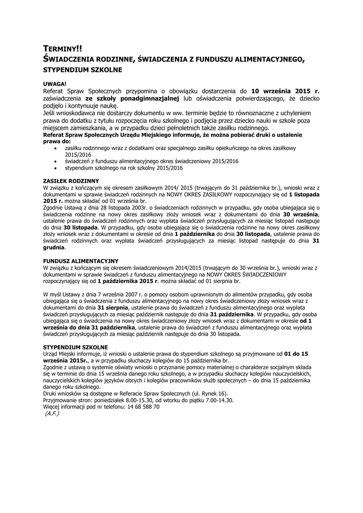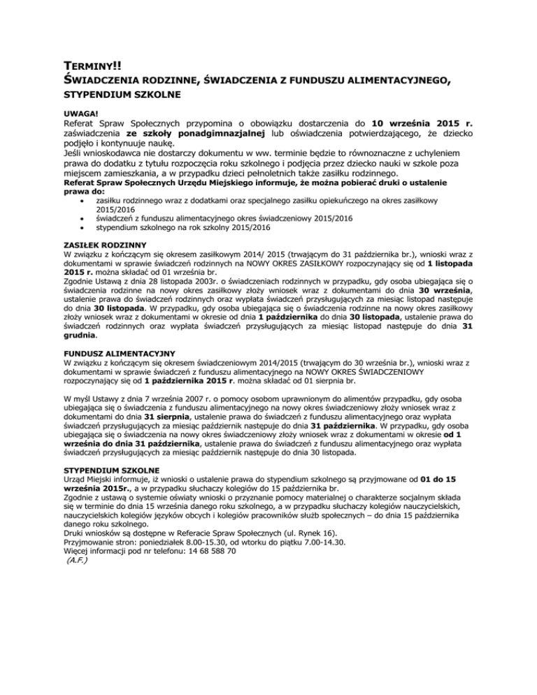 TERMINY!! ŚWIADCZENIA RODZINNE, ŚWIADCZENIA Z FUNDUSZU ALIMENTACYJNEGO, STYPENDIUM SZKOLNE UWAGA! Referat Spraw Społecznych przypomina o obowiązku dostarczenia do 10 września 2015 r. zaświadczenia ze szkoły ponadgimnazjalnej lub oświadczenia potwierdzającego, że dziecko podjęło i kontynuuje naukę. Jeśli wnioskodawca nie dostarczy dokumentu w ww. terminie będzie to równoznaczne z uchyleniem prawa do dodatku z tytułu rozpoczęcia roku szkolnego i podjęcia przez dziecko nauki w szkole poza miejscem zamieszkania, a w przypadku dzieci pełnoletnich także zasiłku rodzinnego. Referat Spraw Społecznych Urzędu Miejskiego informuje, że można pobierać druki o ustalenie prawa do: zasiłku rodzinnego wraz z dodatkami oraz specjalnego zasiłku opiekuńczego na okres zasiłkowy 2015/2016 świadczeń z funduszu alimentacyjnego okres świadczeniowy 2015/2016 stypendium szkolnego na rok szkolny 2015/2016 ZASIŁEK RODZINNY W związku z kończącym się okresem zasiłkowym 2014/ 2015 (trwającym do 31 października br.), wnioski wraz z dokumentami w sprawie świadczeń rodzinnych na NOWY OKRES ZASIŁKOWY rozpoczynający się od 1 listopada 2015 r. można składać od 01 września br. Zgodnie Ustawą z dnia 28 listopada 2003r. o świadczeniach rodzinnych w przypadku, gdy osoba ubiegająca się o świadczenia rodzinne na nowy okres zasiłkowy złoży wniosek wraz z dokumentami do dnia 30 września, ustalenie prawa do świadczeń rodzinnych oraz wypłata świadczeń przysługujących za miesiąc listopad następuje do dnia 30 listopada. W przypadku, gdy osoba ubiegająca się o świadczenia rodzinne na nowy okres zasiłkowy złoży wniosek wraz z dokumentami w okresie od dnia 1 października do dnia 30 listopada, ustalenie prawa do świadczeń rodzinnych oraz wypłata świadczeń przysługujących za miesiąc listopad następuje do dnia 31 grudnia. FUNDUSZ ALIMENTACYJNY W związku z kończącym się okresem świadczeniowym 2014/2015 (trwającym do 30 września br.), wnioski wraz z dokumentami w sprawie świadczeń z funduszu alimentacyjnego na NOWY OKRES ŚWIADCZENIOWY rozpoczynający się od 1 października 2015 r. można składać od 01 sierpnia br. W myśl Ustawy z dnia 7 września 2007 r. o pomocy osobom uprawnionym do alimentów przypadku, gdy osoba ubiegająca się o świadczenia z funduszu alimentacyjnego na nowy okres świadczeniowy złoży wniosek wraz z dokumentami do dnia 31 sierpnia, ustalenie prawa do świadczeń z funduszu alimentacyjnego oraz wypłata świadczeń przysługujących za miesiąc październik następuje do dnia 31 października. W przypadku, gdy osoba ubiegająca się o świadczenia na nowy okres świadczeniowy złoży wniosek wraz z dokumentami w okresie od 1 września do dnia 31 października, ustalenie prawa do świadczeń z funduszu alimentacyjnego oraz wypłata świadczeń przysługujących za miesiąc październik następuje do dnia 30 listopada. STYPENDIUM SZKOLNE Urząd Miejski informuje, iż wnioski o ustalenie prawa do stypendium szkolnego są przyjmowane od 01 do 15 września 2015r., a w przypadku słuchaczy kolegiów do 15 października br. Zgodnie z ustawą o systemie oświaty wnioski o przyznanie pomocy materialnej o charakterze socjalnym składa się w terminie do dnia 15 września danego roku szkolnego, a w przypadku słuchaczy kolegiów nauczycielskich, nauczycielskich kolegiów języków obcych i kolegiów pracowników służb społecznych – do dnia 15 października danego roku szkolnego. Druki wniosków są dostępne w Referacie Spraw Społecznych (ul. Rynek 16). Przyjmowanie stron: poniedziałek 8.00-15.30, od wtorku do piątku 7.00-14.30. Więcej informacji pod nr telefonu: 14 68 588 70 (A.F.)