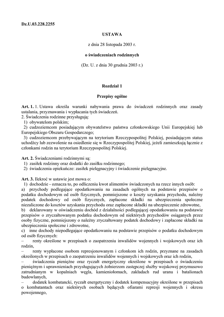 Dz.U.03.228.2255 USTAWA z dnia 28 listopada 2003 r. o świadczeniach rodzinnych (Dz. U. z dnia 30 grudnia 2003 r.) Rozdział 1 Przepisy ogólne Art. 1. 1. Ustawa określa warunki nabywania prawa do świadczeń rodzinnych oraz zasady ustalania, przyznawania i wypłacania tych świadczeń. 2. Świadczenia rodzinne przysługują: 1) obywatelom polskim; 2) cudzoziemcom posiadającym obywatelstwo państwa członkowskiego Unii Europejskiej lub Europejskiego Obszaru Gospodarczego; 3) cudzoziemcom przebywającym na terytorium Rzeczypospolitej Polskiej, posiadającym status uchodźcy lub zezwolenie na osiedlenie się w Rzeczypospolitej Polskiej, jeżeli zamieszkują łącznie z członkami rodzin na terytorium Rzeczypospolitej Polskiej. Art. 2. Świadczeniami rodzinnymi są: 1) zasiłek rodzinny oraz dodatki do zasiłku rodzinnego; 2) świadczenia opiekuńcze: zasiłek pielęgnacyjny i świadczenie pielęgnacyjne. Art. 3. Ilekroć w ustawie jest mowa o: 1) dochodzie - oznacza to, po odliczeniu kwot alimentów świadczonych na rzecz innych osób: a) przychody podlegające opodatkowaniu na zasadach ogólnych na podstawie przepisów o podatku dochodowym od osób fizycznych, pomniejszone o koszty uzyskania przychodu, należny podatek dochodowy od osób fizycznych, zapłacone składki na ubezpieczenia społeczne niezaliczone do kosztów uzyskania przychodu oraz zapłacone składki na ubezpieczenie zdrowotne, b) deklarowany w oświadczeniu dochód z działalności podlegającej opodatkowaniu na podstawie przepisów o zryczałtowanym podatku dochodowym od niektórych przychodów osiąganych przez osoby fizyczne, pomniejszony o należny zryczałtowany podatek dochodowy i zapłacone składki na ubezpieczenia społeczne i zdrowotne, c) inne dochody niepodlegające opodatkowaniu na podstawie przepisów o podatku dochodowym od osób fizycznych: – renty określone w przepisach o zaopatrzeniu inwalidów wojennych i wojskowych oraz ich rodzin, – renty wypłacone osobom represjonowanym i członkom ich rodzin, przyznane na zasadach określonych w przepisach o zaopatrzeniu inwalidów wojennych i wojskowych oraz ich rodzin, – świadczenia pieniężne oraz ryczałt energetyczny określone w przepisach o świadczeniu pieniężnym i uprawnieniach przysługujących żołnierzom zastępczej służby wojskowej przymusowo zatrudnianym w kopalniach węgla, kamieniołomach, zakładach rud uranu i batalionach budowlanych, – dodatek kombatancki, ryczałt energetyczny i dodatek kompensacyjny określone w przepisach o kombatantach oraz niektórych osobach będących ofiarami represji wojennych i okresu powojennego, – świadczenie pieniężne określone w przepisach o świadczeniu pieniężnym przysługującym osobom deportowanym do pracy przymusowej oraz osadzonym w obozach pracy przez III Rzeszę Niemiecką lub Związek Socjalistycznych Republik Radzieckich, – emerytury i renty otrzymywane przez osoby, które utraciły wzrok w wyniku działań wojennych w latach 1939-1945 lub eksplozji pozostałych po tej wojnie niewypałów i niewybuchów, – renty inwalidzkie z tytułu inwalidztwa wojennego, kwoty zaopatrzenia otrzymywane przez ofiary wojny oraz członków ich rodzin, renty wypadkowe osób, których inwalidztwo powstało w związku z przymusowym pobytem na robotach w III Rzeszy Niemieckiej w latach 1939-1945, otrzymywane z zagranicy, – zasiłki chorobowe określone w przepisach o ubezpieczeniu społecznym rolników oraz w przepisach o systemie ubezpieczeń społecznych, – środki bezzwrotnej pomocy zagranicznej otrzymywane od rządów państw obcych, organizacji międzynarodowych lub międzynarodowych instytucji finansowych, pochodzące ze środków bezzwrotnej pomocy przyznanych na podstawie jednostronnej deklaracji lub umów zawartych z tymi państwami, organizacjami lub instytucjami przez Radę Ministrów, właściwego ministra lub agencje rządowe, w tym również w przypadkach, gdy przekazanie tych środków jest dokonywane za pośrednictwem podmiotu upoważnionego do rozdzielania środków bezzwrotnej pomocy zagranicznej na rzecz podmiotów, którym służyć ma ta pomoc, – należności ze stosunku pracy lub z tytułu stypendium osób fizycznych mających miejsce zamieszkania na terytorium Rzeczypospolitej Polskiej, przebywających czasowo za granicą - w wysokości odpowiadającej równowartości diet z tytułu podróży służbowej poza granicami kraju ustalonych dla pracowników zatrudnionych w państwowych lub samorządowych jednostkach sfery budżetowej na podstawie ustawy z dnia 26 czerwca 1974 r. - Kodeks pracy (Dz. U. z 1998 r. Nr 21, poz. 94, z późn. zm.1)), – należności pieniężne wypłacone policjantom, żołnierzom, celnikom i pracownikom jednostek wojskowych i jednostek policyjnych użytych poza granicami państwa w celu udziału w konflikcie zbrojnym lub wzmocnienia sił państwa albo państw sojuszniczych, misji pokojowej, akcji zapobieżenia aktom terroryzmu lub ich skutkom, a także należności pieniężne wypłacone żołnierzom, policjantom, celnikom i pracownikom pełniącym funkcje obserwatorów w misjach pokojowych organizacji międzynarodowych i sił wielonarodowych, – należności pieniężne ze stosunku służbowego otrzymywane w czasie służby kandydackiej przez funkcjonariuszy Policji, Państwowej Straży Pożarnej, Straży Granicznej i Biura Ochrony Rządu, obliczone za okres, w którym osoby te uzyskały dochód, – wynagrodzenia członków rolniczych spółdzielni produkcyjnych z tytułu użytkowania przez spółdzielnię wniesionych wkładów gruntowych, – alimenty na rzecz dzieci, – stypendia określone w przepisach o systemie oświaty, o szkolnictwie wyższym oraz w przepisach o stopniach naukowych i tytule naukowym oraz o stopniach i tytule w zakresie sztuki, – kwoty diet nieopodatkowane podatkiem dochodowym od osób fizycznych, otrzymywane przez osoby wykonujące czynności związane z pełnieniem obowiązków społecznych i obywatelskich, – nale