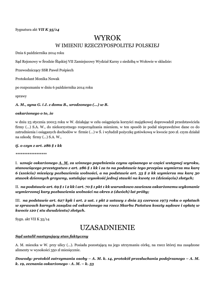 Sygnatura akt VII K 35/14 WYROK W IMIENIU RZECZYPOSPOLITEJ POLSKIEJ Dnia 6 października 2014 roku Sąd Rejonowy w Środzie Śląskiej VII Zamiejscowy Wydział Karny z siedzibą w Wołowie w składzie: Przewodniczący SSR Paweł Pośpiech Protokolant Monika Nowak po rozpoznaniu w dniu 6 października 2014 roku sprawy A. M., syna G. i J. z domu B., urodzonego (...) w B. oskarżonego o to, że w dniu 23 stycznia 20013 roku w W. działając w celu osiągnięcia korzyści majątkowej doprowadził przedstawiciela firmy (...) S.A. W., do niekorzystnego rozporządzania mieniem, w ten sposób że podał nieprawdziwe dane co do zatrudnienia i osiąganych dochodów w firmie (...) w Ś. i wyłudził pożyczkę gotówkową w kwocie 500 zł. czym działał na szkodę firmy (...) S.A. W., tj. o czyn z art. 286 § 1 kk ****************** I. uznaje oskarżonego A. M. za winnego popełnienia czynu opisanego w części wstępnej wyroku, stanowiącego przestępstwo z art. 286 § 1 kk i za to na podstawie tego przepisu wymierza mu karę 6 (sześciu) miesięcy pozbawienia wolności, a na podstawie art. 33 § 2 kk wymierza mu karę 30 stawek dziennych grzywny, ustalając wysokość jednej stawki na kwotę 10 (dziesięciu) złotych; II. na podstawie art. 69 § 1 i 2 kk i art. 70 § 1 pkt 1 kk warunkowo zawiesza oskarżonemu wykonanie wymierzonej kary pozbawienia wolności na okres 2 (dwóch) lat próby; III. na podstawie art. 627 kpk i art. 2 ust. 1 pkt 2 ustawy z dnia 23 czerwca 1973 roku o opłatach w sprawach karnych zasądza od oskarżonego na rzecz Skarbu Państwa koszty sądowe i opłatę w kwocie 120 ( stu dwudziestu) złotych. Sygn. akt VII K 35/14 UZASADNIENIE Sąd ustalił następujący stan faktyczny A. M. mieszka w W. przy ulicy (...). Posiada pozostającą na jego utrzymaniu córkę, na rzecz której ma zasądzone alimenty w wysokości 350 zł miesięcznie. Dowody: protokół zatrzymania osoby – A. M. k. 14, protokół przesłuchania podejrzanego – A. M. k. 19, zeznania oskarżonego - A. M. – k. 53 W dniu 23 stycznia 2013 roku A. M. złożył wniosek o udzielenie pożyczki w kwocie 500 zł firmie (...) S.A. Przedstawicielka, M. N., reprezentująca interesy w/w firmy, przeprowadziła wywiad środowiskowy na okoliczność ustalenia sytuacji materialnej A. M.. W trakcie wywiadu, A. M. oświadczył, że jest zatrudniony na stanowisku malarz – piaskarz w firmie (...) z siedzibą w Ś. i uzyskuje dochód miesięczny w wysokości 1600 zł netto. A. M. w trakcie przeprowadzonego wywiadu środowiskowego nie ujawnił pracownikowi (...) S.A. znanej mu informacji, że w momencie zawarcia umowy pozostaje osobą bez stałego zatrudnienia oraz toczących się wobec niego czynności poszukiwawczych prowadzonych przez policję, celem osadzenia w Zakładzie (...) w P., na skutek których istniał brak możliwości spłacenia udzielonej pożyczki. W dniu 23 stycznia 2013 roku (...) S.A. na podstawie udzielonych przez A. M. informacji oraz powziętego zobowiązania potwierdzonych na stosownej umowie, przyznał i wypłacił A. M. pożyczkę w wysokości 500 zł z obowiązkiem spłaty raty w kwocie 20,86 zł tygodniowo. A. M., składając 23 stycznia 2013 roku fałszywe oświadczenie o miejscu zatrudnienia i uzyskiwanych dochodach, działając z góry powziętym zamiarem osiągnięcia korzyści majątkowej, wyłudził od (...) S.A. pożyczkę w wysokości 500 zł. Dowody: wniosek o pożyczkę z dnia 23 stycznia 2013 r., k. 7, umowa pożyczki pieniężnej – pakiet gotówka z dnia 23 stycznia 2013r., k. 5, protokół przesłuchania osoby podejrzanej – A. M., k. 19-20. W dniu 20 listopada 2013 roku asp. Ł. W. z Komendy Powiatowej Policji w W. przyjął protokół ustnego zawiadomienia o przestępstwie i przesłuchania w charakterze świadka osoby zawiadamiającej od I. P., zatrudnionego na stanowisku kierowniczym ds. rozwoju firmy (...) S.A. W toku poczynionych ustaleń osiągnięto informację, że A. M., na mocy podpisanej przez strony umowy nr (...), zobowiązał się do spłaty łącznej udzielonej pożyczki wraz z odsetkami w wysokości 938,68 zł, jednakże nie uiścił żadnej raty na poczet zaciągniętego zobowiązania oraz nie kontaktował się w sprawie jej spłacenia, co wyczerpało przesłankę o zachodzeniu podejrzenia popełnienia przestępstwa wyłudzenia w/w kwoty na szkodę (...) S.A. Do złożonego zawiadomienia załączono kserokopię dokumentów umowy udzielenia pożyczki. Komenda Powiatowa Policji w W., celem wyjaśnienia okoliczności sprawy, skontaktowała się z K. L., prowadzącym do grudnia 2013 roku firmę Przedsiębiorstwo Usługowe (...) w Ś., w której rzekomo zatrudnionym miał być podejrzany. Na stosownym protokole przesłuchania osoby w charakterze świadka z dnia 3 lutego 2014 roku, w/w potwierdził, iż A. M. ubiegał się w maju lub czerwcu 2012 roku o umowę o pracę, do podpisania której nigdy nie doszło z powodu zatrzymania podejrzanego przez funkcjonariuszy policji. Świadek dodał, iż A. M. nigdy nie figurował na liście osób zatrudnionych w firmie (...), a zatem z tytułu rzekomo wykonywanej pracy nie uzyskiwał dochodów uwzględnionych w umowie z pożyczkodawcą. Dowody: notatka urzędowa Komendy Powiatowej Policji w W. z dnia 20 listopada 2013 roku, k. 1, protokół przesłuchania świadka – I. P. z dnia 20 listopada 2013 roku, k. 2-3, protokół przesłuchania świadka – K. L., k. 13 W dniu 4 lutego 2014 roku funkcjonariusze z Komendy Powiatowej Policji w W. dokonali zatrzymania A. M., podejrzanego o przestępstwo doprowadzenia do niekorzystnego rozporządzenia mieniem i wyłudzenia pożyczki od firmy (...) S.A. W., tj. o czyn z art. 286 § 1 k.k. Podejrzany przyznał się w całości do popełnienia zarzucanego mu czynu i wyjaśnił, że świadomie podjął decyzję o udzieleniu fałszywych informacji na temat zatrudnienia i uzyskiwanych dochodów, a także o możliwości spłaty raty, zaś uzyskane w ten sposób pieniądze przeznaczył na potrzeby c