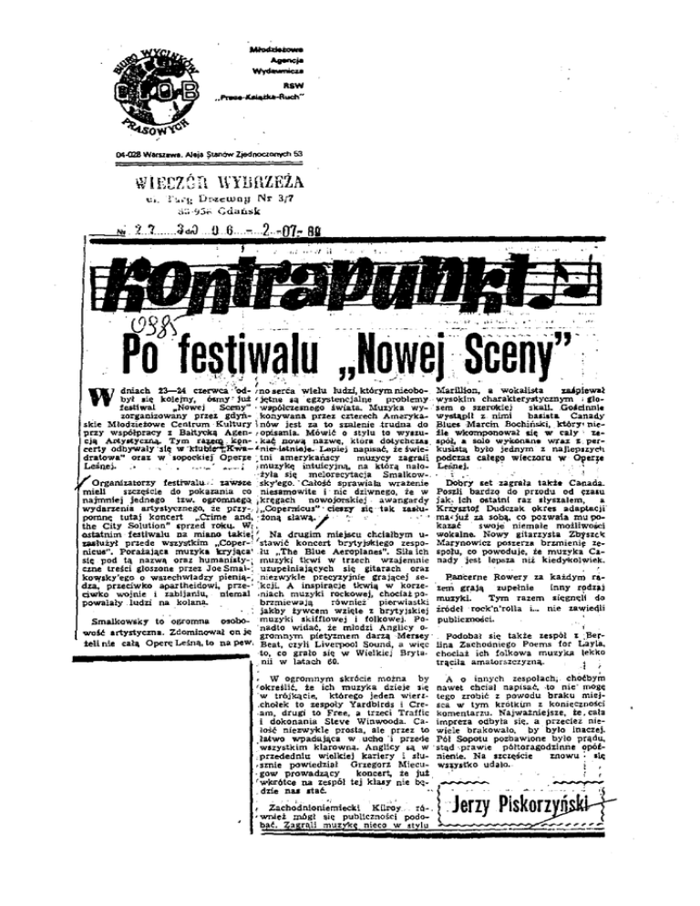 Mł _... drid • Wyd-.. RSW .. PiwM (eł,_th-RYCh" 04-CrlS Warszawa. Aleja $tan6w Zjednoczonych 63 WlECZCn t!L ~YUUZEZA r:..q~ Dr~z:c:woy Nr 3/7 ~l:~·,::ił-\ Gdańsk .. o testiw31u "Nowerscenyn .. _, - l •. ' < dniach 23-24 czerwea ·"od- mo serCa wielu ludz.i, którym nieobo- Marlllion, a wokalista sUplewal aię kolejny, ÓSmY' jwi: 1 jętne aą egzystencjalne problemy ·wysokim cha.rakterystycznym ; Cło· festiwal ,.Nowej Sceny'" · Wlpółczesnego świata. Muzyka wy- · sem o szerokiej skali. .GoAclnnle zorganizowany przez gdyń- _konywana przez czterech Am~ryka- wyfią,plł z. nimi basiata Canad.y skie Młodzietowe Centrum Kultury \nów jest za to szalenie .t·rudna do ~lues Marcin Bochiński, _którY' nieprzy współpracy 1 Bałt.J'Qką Agen· , opisania. Mówić o stylu to wyazu- źle wkomponował aię w cały • zecją Ątltyl'tycznq. Tym r~_- k~n·. kaę .JJ.OWal p.a~ę. która dotychcu1. apół. a solo WY'konane wr;u ~-per ~erty odbywały ·st-;: w 'ktub!e"'t,K'W'Il- 4-nie'-·i.&tnielew- Lepiej nalllsać, ż:e świe~ kuSistą, było jednym- z: najleps:z:yełl dratowa.. oraz; w -sopockiej" Oper~e ~ tni amerykańscy mu:z:ycy zagrali podczas całego wiecwru w- Operłe Leśnei. .• ' ....... .i ,; muzykę intuicyjną, na którą, nałO· Le5nej. . ' · · • ·'tyła się melorecytacja Smalkow. ; ·· _1 Organiutor:z:y festiwalu-•: :z:a-\v&u sky'ego. 'Całość sprawiała wrażenie Dob~y set zagrała takie Carnad"a. miell szaęście do pokazania co niesamowite i nic dziwnego, że w Pos;li bardzo do pn;odu od ~:z:atu najmniej jednego tzw. ogl'omnegQ_ 1 kręgach nowojorskiej awanga'!"d)" jak• ich ost•t.nt raz słyszałem, a wYdarzenia artystycznego, ż:e P!%Y·.- i ,.Copernicus••' cieaz:y lic;.- tak zasłu- KriYs:zto~ Dudczak 9kret adaptacji' pomnę tutaj koncert ,.Ctime an~ , :żoną sławą./ ma' już za sobą. co pozwa1a mu pothe City Solution'" .-przed roku. W;:, kazać swoje· niemałe możliwości ostatnim festiwalu na miano takie~~ Na drugim miejscu chciałbym u- w-okalne. NowY gitarzysta Zb:fszclc zaałui.ył przede wszyfitk.im ,.Coper-' 'stawić koncert brytyjskiego zespo· Marynowicz poszerza br:z:mienię ze. nicus". Porażająca muzyka kryjąca' lu "The Blue Aeroplanes". Siła ich spoJu, co powoduje, ie muzyka Ca· stc;. pod tą nazwą. oraz: humanisty·; muzyki tkwi w trzech wzajemnie nacJy jest lepsza niż kied)"k:olwiek. czne treści głoszone przez Joe Smak uzupełniają,cych się gitarach oraz kowsky'ego o wnechwlad:z:y pienią-; :niezwykle precyzyjnie grają,<:ej se. P.aoC:erne Rowery :z:a każdym ridu. przeciwko apartheidowi. prze-· .kcji. A inspiracje tkwią w korze. zeni grają zupełnie inny r~dz,_j ciwko wojnie i ubija-niu. ntema.l .niach muzyki rockowej, chocia.t po. muzyki. Tym razem sięgnęli do powalały ludzi na kola!U!-brz:miewają również pierwiastki · jakby :i:yw<:em wzięte z: brytyJskiej źródeł rock'n'rolla i- nie zawieQH Smalkow6ky to ogromna osobo- muzyki skiUlowej i folkowej. Po- publicmo6ci. wość art~ycma. ZdominoWał on jt: ·nadto widać, :że mład:z:i Anglicy oJ•n gromn)Ln pietyzmem darzą -Meraey . podobał sic także z.espół 1 ~Ber teli nie ~ałą, Oper~;: Leśną, to na pew. Beat, czyli Liverpool Sl)und, a więc lina Zachodniego Poems for Layl&, co grata się w Wielkiej Bryta- chociat ich folkowa muzyka \ekko • • • • • • • • • • • • • • • • • , .··to, nii w latach 60. trą~ła amators:z:czy:z:ną,. i W był A o innych zespołach; chÓćbym nawet chciał napisać, ,to nie" mogę tego zrobić z powodu braku miejsca w tym krótkim z: konieczności komentarzu. Najważniejsze, ie; cała impreza odbyła się, a przecież nie· wiele brakowało, by było ina<:zej. Pół Sopotu pozbawione było prądu, ·!:!;;u~a~~~~aw~. A:~:~~~Y p~e~ stąd ·-prawie półtoragodzinne opóf· , przededniu wielkiej kariery i s!u- nienie. Na szczęście znowu : 1lę ' s:z:nie powiedział Grzegon Miecu- ws~y5-tkO udało. . gow prowadzą, cy koncert. że jut rwlm'ótce na zespól tej klasy nie ~· · . - · - - - . dzie nu .tać. -W ogromnym skrócie można by te ich muzyka dzieje się ·w trójkącie, którego jeden wieu.chołek to zespoły Yardbirds i Cre.am, drugi to Free, a trzeci Traffic i dokonania Steve Winwooda. CałoSć nieliwykle prosta, ale przez: to , 1 określić, ; Zach.;dnioni~miecki • wnJ.ęż bać. mógł ;agr[\li t Kil;.<;y ąię publiczności muzykę nieco w rópodostylu ,. Jerzy Piskorz