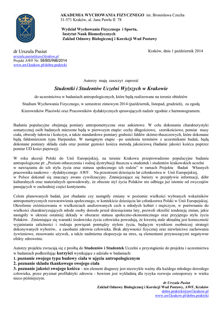 AKADEMIA WYCHOWANIA FIZYCZNEGO im. Bronisława Czecha 31-571 Kraków, al. Jana Pawła II 78 Wydział Wychowania Fizycznego i Sportu, Instytut Nauk Biomedycznych Zakład Odnowy Biologicznej i Korekcji Wad Postawy Kraków, dnia 1 październik 2014 dr Urszula Pasiut [email protected] Projekt AWF Nr: 58/BS/INB/2014 www.awf.krakow.pl/dobre.praktyki Autorzy mają zaszczyt zaprosić Studentki i Studentów Uczelni Wyższych w Krakowie do uczestnictwa w badaniach antropologicznych, które będą realizowane na terenie obiektów Studium Wychowania Fizycznego, w semestrze zimowym 2014 (październik, listopad, grudzień), za zgodą Kierowników Placówki oraz Pracowników dydaktycznych sprawujących nadzór zgodnie z harmonogramem. Badania populacyjne obejmują pomiary antropometryczne oraz ankietowe. W celu dokonania charakterystyki somatycznej osób badanych mierzone będą w pierwszym etapie: cechy długościowe, szerokościowe, pomiar masy ciała, obwody tułowia i kończyn, a także standardowe pomiary grubości fałdów skórno-tłuszczowych, które dokonane będą fałdomierzem typu Harpenden. W następnym etapie –po ustaleniu terminów z uczestnikami badań, będą dokonane pomiary składu ciała oraz pomiar gęstości kośćca metodą jakościową (badanie jakości kośćca poprzez pomiar UD kości piętowej). W roku akcesji Polski do Unii Europejskiej, na terenie Krakowa przeprowadzono populacyjne badania antropologiczne pt: „Poziom otłuszczenia i rodzaj dystrybucji tłuszczu u studentek i studentów krakowskich uczelni w nawiązaniu do ich stylu życia oraz statusu społecznego ich rodzin” w ramach Projektu Badań Własnych pracownika naukowo – dydaktycznego AWF. Na przestrzeni dziesięciu lat członkostwa w Unii Europejskiej, w Polsce dokonał się znaczący awans cywilizacyjny. Zmniejszające się bariery w przepływie informacji, dóbr kulturalnych oraz materialnych spowodowały, że obecnie styl życia Polaków nie odbiega już istotnie od zwyczajów panujących w zachodniej części kontynentu. Celem planowanych badań, jest zbadanie czy nastąpiły zmiany w poziomie wielkości wybranych wskaźników antropometrycznych rozwarstwienia społecznego, w kontekście dziesięciu lat członkostwa Polski w Unii Europejskiej. Określenie zróżnicowania w wielkościach analizowanych cech u młodych kobiet i mężczyzn, w porównaniu do wielkości charakteryzujących młode osoby dorosłe przed dziesięcioma laty, pozwoli określić tendencję zmian, jakie nastąpiły w okresie ostatniej dekady w obszarze statusu społeczno-ekonomicznego oraz przyjętego stylu życia Polaków. Zmieniające się warunki środowiska życia człowieka powodują, że kwestią stale aktualną jest konieczność wyjaśniania zależności i rodzaju powiązań pomiędzy stylem życia, będącym wynikiem osobniczej strategii dokonywanych wyborów, a zasobami zdrowia człowieka. Brak aktywności fizycznej oraz niewłaściwe zachowania żywieniowe, stosowanie używek, a także nadmierna ekspozycja na stres, są elementami przynoszącymi negatywne efekty zdrowotne. Autorzy projektu zwracają się z prośbą do Studentów i Studentek Uczelni o przystąpienie do projektu i uczestnictwa w badaniach podkreślając korzyści wynikające z udziału w badaniach: 1. poznanie swojego typu budowy ciała w ujęciu antropologicznym 2. poznanie składu tkankowego swojego ciała 3. poznanie jakości swojego kośćca – ten element diagnozy jest niezwykle ważny dla każdego młodego dorosłego człowieka, przez pryzmat profilaktyki zdrowia - bowiem jest wykładnią dla ryzyka rozwoju osteoporozy w wieku nieco późniejszym. dr Urszula Pasiut Zakład Odnowy Biologicznej i Korekcji Wad Postawy, AWF, Kraków [email protected] www.awf.krakow.pl/dobre.praktyki