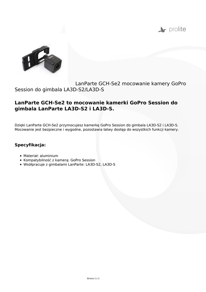 LanParte GCH-Se2 mocowanie kamery GoPro Session do gimbala LA3D-S2/LA3D-S LanParte GCH-Se2 to mocowanie kamerki GoPro Session do gimbala LanParte LA3D-S2 i LA3D-S. Dzięki LanParte GCH-Se2 przymocujesz kamerkę GoPro Session do gimbala LA3D-S2 i LA3D-S. Mocowanie jest bezpieczne i wygodne, pozostawia łatwy dostęp do wszystkich funkcji kamery. Specyfikacja: Materiał: aluminium Kompatybilność z kamerą: GoPro Session Wsółpracuje z gimbalami LanParte: LA3D-S2, LA3D-S Strona 1 z 1