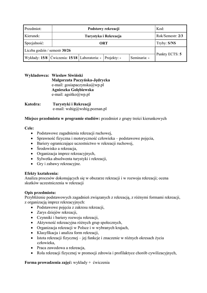 Przedmiot: Podstawy rekreacji Kierunek: Turystyka i Rekreacja Specjalność: Kod: Rok/Semestr: 2/3 Tryby: S/NS ORT Liczba godzin / semestr 30/26 Wykłady: 15/8 Ćwiczenia: 15/18 Laboratoria: - Projekty: - Punkty ECTS: 5 Seminaria: - Wykładowca: Wiesław Siwiński Małgorzata Paczyńska-Jędrycka e-mail: [email protected] Agnieszka Gołębiewska e-mail: [email protected] Katedra: Turystyki i Rekreacji e-mail: [email protected] Miejsce przedmiotu w programie studiów: przedmiot z grupy treści kierunkowych Cele: Podstawowe zagadnienia rekreacji ruchowej, Sprawność fizyczna i motoryczność człowieka – podstawowe pojęcia, Bariery ograniczające uczestnictwo w rekreacji ruchowej, Środowisko a rekreacja, Organizacja imprez rekreacyjnych, Sylwetka absolwenta turystyki i rekreacji, Gry i zabawy rekreacyjne. Efekty kształcenia: Analiza procesów dokonujących się w obszarze rekreacji i w rozwoju rekreacji; ocena skutków uczestniczenia w rekreacji Opis przedmiotu: Przybliżenie podstawowych zagadnień związanych z rekreacją, z różnymi formami rekreacji, z organizacją imprez rekreacyjnych: Podstawowe pojęcia z zakresu rekreacji, Zarys dziejów rekreacji, Czynniki i bariery rozwoju rekreacji, Aktywność rekreacyjna różnych grup społecznych, Organizacja rekreacji w Polsce i w wybranych krajach, Klasyfikacja i analiza form rekreacji, Istota rekreacji fizycznej – jej funkcje i znaczenie w różnych okresach życia człowieka, Praca zawodowa a rekreacja, Rola rekreacji fizycznej w promocji zdrowia i profilaktyce chorób cywilizacyjnych, Forma prowadzenia zajęć: wykłady + ćwiczenia Metody oceny: przygotowanie do zajęć, aktywność, kolokwia sprawdzające, obecność. Bibliografia: 1. Dąbrowski A., 2006. Zarys teorii rekreacji ruchowej. WSE Almamer – AWF, Warszawa. 2. Kiełbasiewicz – Drozdowska I., Siwiński W., 2001. Teoria i metodyka rekreacji. AWF, Poznań. 3. Lubowiecki-Vikuk A.P., Paczyńska-Jędrycka M., 2010. Współczesne tendencje w rozwoju form rekreacyjnych i turystycznych. Bogucki Wydawnictwo Naukowe, Poznań. 4. Osiński W., 2000. Antropomotoryka. AWF, Poznań. 5. Osiński W., 2002. Zarys teorii wychowania fizycznego. AWF, Poznań. 6. Siwiński W., Tauber R.D., Rekreacja ruchowa, zagadnienia teoretyczno – metodologiczne. WSHiG, Poznań. 7. Toczek – Werner S., 2005. Podstawy rekreacji i turystyki. AWF, Wrocław. 8. Trześniowski R., 1995. Zabawy i gry ruchowe. WSIP, Warszawa. 9. Winiarski R.W., 1989. Wstęp do teorii rekreacji (ze szczególnym uwzględnieniem rekreacji fizycznej). AWF, Kraków.