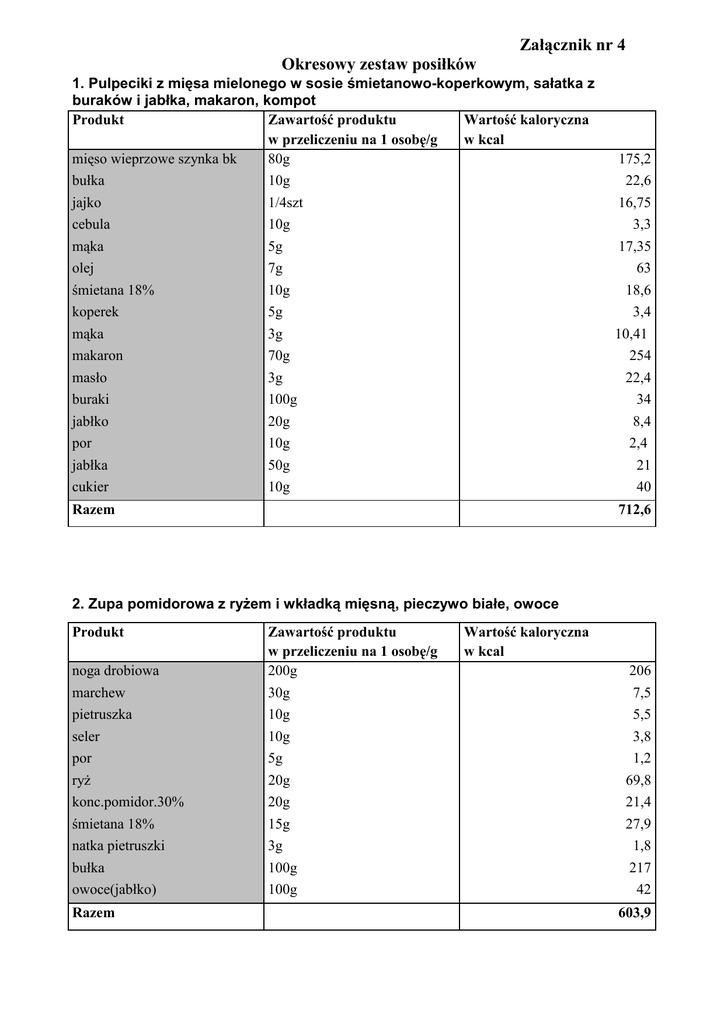Załącznik nr 4 Okresowy zestaw posiłków 1. Pulpeciki z mięsa mielonego w sosie śmietanowo-koperkowym, sałatka z buraków i jabłka, makaron, kompot Produkt Zawartość produktu Wartość kaloryczna w przeliczeniu na 1 osobę/g w kcal mięso wieprzowe szynka bk 80g 175,2 bułka jajko cebula mąka 10g 1/4szt 10g 5g 22,6 16,75 3,3 17,35 olej śmietana 18% koperek mąka 7g 10g 5g 3g 63 18,6 3,4 10,41 makaron masło buraki 70g 3g 100g 254 22,4 34 jabłko por jabłka cukier 20g 10g 50g 10g 8,4 2,4 21 40 Razem 712,6 2. Zupa pomidorowa z ryŜem i wkładką mięsną, pieczywo białe, owoce Produkt noga drobiowa marchew pietruszka seler por ryŜ Zawartość produktu w przeliczeniu na 1 osobę/g 200g 30g 10g 10g 5g 20g konc.pomidor.30% śmietana 18% natka pietruszki bułka 20g 15g 3g 100g 21,4 27,9 1,8 217 owoce(jabłko) 100g 42 Razem Wartość kaloryczna w kcal 206 7,5 5,5 3,8 1,2 69,8 603,9 3. Pierogi ruskie okraszane słoniną, sok warzywno-owocowy Produkt mąka pszenna Zawartość produktu w przeliczeniu na 1 osobę/g 100g jajko mleko2% ser biały cebula 1/4szt 50ml 100g 15g 16,75 23,5 134,4 4,95 ziemniaki masło słonina 200g 5g 10g 118 37,4 26 sok warzywno-owocowy 200ml Wartość kaloryczna w kcal 347 80 Razem 788 4. Kotlet mielony, ziemniaki, surówka z kiszonej kapusty, kompot Produkt mięso wieprzowe szynka bk bułka jajko bułka tarta cebula czosnek przyprawy olej ziemniaki mleko masło kapusta kiszona marchew jabłka olej roślinny cebula przyprawy jabłka cukier Razem Zawartość produktu Wartość kaloryczna w przeliczeniu na 1 osobę/g w kcal 80g 10g 1/4szt 15g 175,2 22,6 16,75 15,75 10g + + 20g 200g 3,3 + + 180 120 10g 3g 4,7 22,4 120g 30g 20g 3g 10g 25 7,5 8,4 18 3,3 + 50g 10g + 21 40 683,9 5. Barszcz czerwony z fasolą białą, ziemniakami, pieczywo, owoce Produkt kości buraki Zawartość produktu w przeliczeniu na 1 osobę/g 50g 70g wartość kaloryczna w kcal marchew seler cebula fasola biała 20g 20g 10g 50g ziemniaki mąka śmietana pieczywo 150g 5g 20g 100g 88,5 17,35 37,2 217 owoce(jabłko) 100g 42 2,5 23,8 5 7,6 3,3 173 Razem 617,25 6. Gulasz drobiowy, bukiet jarzyn, ogórek kiszony, kasza jęczmienna, kompot Produkt filet drobiowy olej Wartość kaloryczna Zawartość produktu w przeliczeniu na 1 osobę/g w kcal 100g 10g 110 90 mąka cebula marchew kalafior 5g 15g 70g 60g 17,35 4,95 17,5 10 seler masło ogórek kiszony kasza jęczmienna owoce cukier 20g 5g 80g 70g 50g 10g 7,6 37,4 9,6 250,6 21 40 Razem 616 7. Kopytka z sosem pieczarkowym, surówka z marchwi, jabłka i selera, jogurt Produkt ziemniaki Zawartość produktu w przeliczeniu na 1 osobę/g 200g Wartość kaloryczna w kcal mąka ziemniaczana mąka pszenna jajko masło 10g 30g 1/4szt-12,5g 10g olej pieczarki cebula śmietana 5g 50g 10g 20g(10g/ sos, 10g do surówki) marchew jabłko seler 100g 50g 20g 25 21 7,6 jogurt mleczno-owocowy 180ml 150 120 33,9 104,1 16,75 74,8 Razem 45 16 3,3 37,2 654,65 8. Zupa jarzynowa zabielana z wkładką mięsną, pieczywo, owoc- jabłko Produkt udko drobiowe bukiet jarzyn mroŜony 5składnik. marchew Zawartość produktu Wartość kaloryczna w przeliczeniu na 1 osobę/g w kcal 200g 50g 206 35 30g 7,5 10g 10g 5g 5,5 3,8 1,2 mąka ziemniaki śmietana 18% masło przyprawy 5g 100g 20g 5g + 17,35 59 37,2 37,4 + pieczywo białe/bulka owoc jabłko 100g 100g 217 42 pietruszka seler por Razem 668,95 9. Ryba panierowana , surówka z kapusty kwaszonej z marchewką, jabłkiem i cebulą, ziemniaki, kompot z jabłek Wartość kaloryczna Produkt zawartość produktu w przeliczeniu na 1 osobę/g w kcal ryba mroŜona 120g 84 mąka 5g 17,35 bułka tarta jajko olej ziemniaki 15g 1/4szt 20g 250g 15,75 16,75 180 147,5 masło kapusta kw marchew jabłko 3g 100g 20g 20g 22,44 20 5 8,4 cebula oliwa jabłka cukier 10g 5g 50g 5g 3,3 44,85 21 19,95 Razem 606,29 10. śurek z jajkiem i kiełbasą, pieczywo ciemne, jogurt mleczno - owocowy Nazwa produktu kości marchew seler cebula zawartość produktu w przeliczeniu na 1 osobę/g 50g 30g 10g 10g zakwas jajko 30ml 1szt kiełbasa śmietana mąka pieczywo jogurt ml-owoc 80g 20g 5g 100g 180ml Razem wartość kaloryczna w kcal 2,5 7,5 3,8 3,3 + 67 148 37,2 17,35 217 150 653,65 11. Potrawka z kurczaka z warzywami, ryŜ, kompot Produkt pierś z kurczaka Zawartość produktu Wartość kaloryczna w przeliczeniu na 1 osobę/g w kcal 100g 110 groszek zielony bukiet jarzyn mroŜony 5 składników cebula olej roślinny 15g 150g 11,25 105 10g 10g 3,3 90 mąka pszenna śmietana 18% przyprawy koncentrat pomidorowy 5g 10g 17,35 18,6 10g 10,7 ryŜ masło jabłka cukier 70g 3g 50g 10g 244 22,4 21 40 Razem 693,6 12. Rosół drobiowy z makaronem, z wkładką mięsną, jogurt owocowy Produkt udko drobiowe por Zawartość produktu Wartość kaloryczna w przeliczeniu na 1 osobę/g w kcal 250g 10g 257 2,4 marchew pietruszka 30g 10g 7,5 5,5 seler makaron pietruszka nać 10g 30g 5g 3,8 109 3 100g 180ml 217 150 pieczywo jogurt owocowy180ml Razem 755,2 13. Kotleciki z kurczaka panierowane, ziemniaki, surówka z białej kapusty, kompot Produkt pierś kurczaka mąka bułka tarta jajko olej do smaŜenia Zawartość produktu Wartość kaloryczna w przeliczeniu na 1 osobę/g w kcal 100g 110 5g 15g 1/4szt 20g 17,35 15,75 16,75 180 ziemniaki masło kapusta biała 200g 3g 150g 120 22,4 48 marchew jabłko por olej roślinny 30g 20g 10g 3g 7,5 8,4 2,4 18 jabłka cukier 50g 10g 21 40 Razem 627,55 14. Zapiekanka z ziemniaków, jajka, boczku i włoszczyzny, sos pomidorowy, kompot Produkt ziemniaki boczek marchew cebula seler kiełbasa por Zawartość produktu Wartość kaloryczna w przeliczeniu na 1 osobę/g w kcal 350g 30g 40g 20g 207 150 10 6,6 10g 40g 10g 3,8 74 2,4 1/2szt 10g 35 90 konc.pomid 10g 10,7 śmietana 10g 18,6 mąka 10g 34,7 owoce 50g 21 cukier 10g 40 jajko olej Razem 703,8