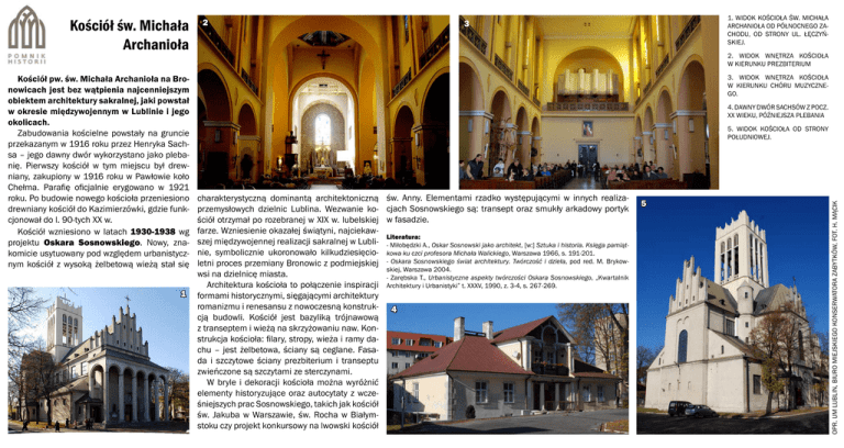 Kościół pw. św. Michała Archanioła na Bronowicach jest bez wątpienia najcenniejszym obiektem architektury sakralnej, jaki powstał w okresie międzywojennym w Lublinie i jego okolicach. Zabudowania kościelne powstały na gruncie przekazanym w 1916 roku przez Henryka Sachsa – jego dawny dwór wykorzystano jako plebanię. Pierwszy kościół w tym miejscu był drewniany, zakupiony w 1916 roku w Pawłowie koło Chełma. Parafię oficjalnie erygowano w 1921 roku. Po budowie nowego kościoła przeniesiono drewniany kościół do Kazimierzówki, gdzie funkcjonował do l. 90-tych XX w. Kościół wzniesiono w latach 1930-1938 wg projektu Oskara Sosnowskiego. Nowy, znakomicie usytuowany pod względem urbanistycznym kościół z wysoką żelbetową wieżą stał się 1 1. widok kościoła św. michała archanioła od północnego zachodu, od strony ul. łęczyńskiej. 3 2. widok wnętrza kościoła w kierunku prezbiterium 3. widok wnętrza kościoła w kierunku chóru muzycznego. 4. dawny dwór Sachsów z pocz. XX wieku, późniejsza plebania 5. widok kościoła od strony południowej. charakterystyczną dominantą architektoniczną św. Anny. Elementami rzadko występującymi w innych realizaprzemysłowych dzielnic Lublina. Wezwanie ko- cjach Sosnowskiego są: transept oraz smukły arkadowy portyk ściół otrzymał po rozebranej w XIX w. lubelskiej w fasadzie. farze. Wzniesienie okazałej świątyni, najciekawLiteratura: szej międzywojennej realizacji sakralnej w Lubli- - Miłobędzki A., Oskar Sosnowski jako architekt, [w:] Sztuka i historia. Księga pamiątnie, symbolicznie ukoronowało kilkudziesięcio- kowa ku czci profesora Michała Walickiego, Warszawa 1966, s. 191-201. letni proces przemiany Bronowic z podmiejskiej - Oskara Sosnowskiego świat architektury. Twórczość i dzieła, pod red. M. Brykowskiej, Warszawa 2004. wsi na dzielnicę miasta. - Zarębska T., Urbanistyczne aspekty twórczości Oskara Sosnowskiego, „Kwartalnik Architektura kościoła to połączenie inspiracji Architektury i Urbanistyki” t. XXXV, 1990, z. 3-4, s. 267-269. formami historycznymi, sięgającymi architektury romanizmu i renesansu z nowoczesną konstruk- 4 cją budowli. Kościół jest bazyliką trójnawową z transeptem i wieżą na skrzyżowaniu naw. Konstrukcja kościoła: filary, stropy, wieża i ramy dachu – jest żelbetowa, ściany są ceglane. Fasada i szczytowe ściany prezbiterium i transeptu zwieńczone są szczytami ze sterczynami. W bryle i dekoracji kościoła można wyróżnić elementy historyzujące oraz autocytaty z wcześniejszych prac Sosnowskiego, takich jak kościół św. Jakuba w Warszawie, św. Rocha w Białymstoku czy projekt konkursowy na lwowski kościół 5 OPR. UM Lublin, Biuro Miejskiego konserwatora zabytków, fot. H. Mącik Kościół św. Michała Archanioła 2