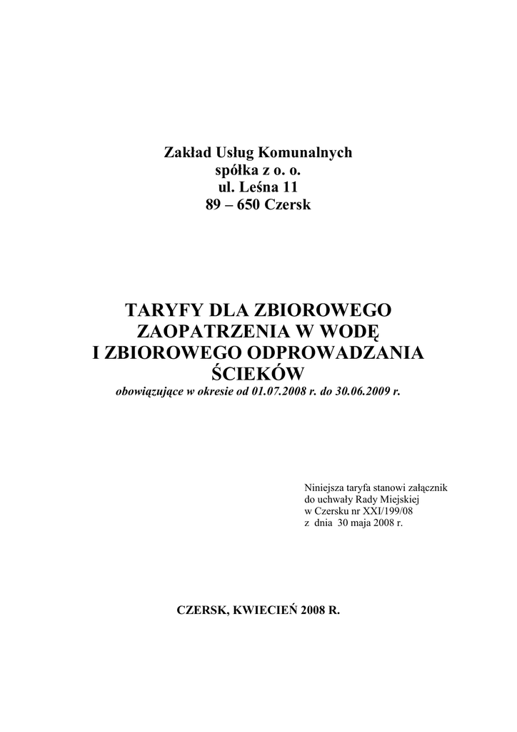 Zakład Usług Komunalnych spółka z o. o. ul. Leśna 11 89 – 650 Czersk TARYFY DLA ZBIOROWEGO ZAOPATRZENIA W WODĘ I ZBIOROWEGO ODPROWADZANIA ŚCIEKÓW obowiązujące w okresie od 01.07.2008 r. do 30.06.2009 r. Niniejsza taryfa stanowi załącznik do uchwały Rady Miejskiej w Czersku nr XXI/199/08 z dnia 30 maja 2008 r. CZERSK, KWIECIEŃ 2008 R. Spis treści: 1. Informacje ogólne 2. Rodzaje działalności gospodarczej prowadzonej przez ZUK sp. z o. o. w Czersku w zakresie zbiorowego zaopatrzenia w wodę i zbiorowego odprowadzania ścieków 3. Podział odbiorców na grupy taryfowe 4. Rodzaje i wysokość cen i stawek opłat 5. Warunki stosowania cen i stawek opłat 5.1 warunki rozliczeń z uwzględnieniem wyposaŜenia nieruchomości w przyrządy i urządzenia pomiarowe 5.2 zakres usług świadczonych dla poszczególnych grup odbiorców 5.3 standardy jakościowe obsługi odbiorców 1. Informacje ogólne Niniejsza taryfa została opracowana na podstawie następujących aktów prawnych: a) ustawa z dnia 7 czerwca 2001 r. o zbiorowym zaopatrzeniu w wodę i zbiorowym odprowadzeniu ścieków (t.j. Dz.U. z 2006 r. Nr 123 poz. 858), zwana dalej ,,ustawą”, b) rozporządzenie Ministra Infrastruktury z dnia 28 czerwca 2006 r. w sprawie określania taryf, wzoru wniosku o zatwierdzenie taryf oraz warunków rozliczeń za zbiorowe zaopatrzenie w wodę i zbiorowe odprowadzanie ścieków (Dz.U. Nr 127 poz.886), zwane dalej ,,rozporządzeniem taryfowym”, c) rozporządzenie Ministra Infrastruktury z dnia 14 stycznia 2002 r. w sprawie określenia przeciętnych norm zuŜycia wody (Dz.U. Nr 8 poz. 70), zwane dalej ,,rozporządzeniem”. UŜyte w taryfie pojęcia są równoznaczne z określonymi w ustawie, rozporządzeniach oraz regulaminie dostarczania wody i odprowadzania ścieków na obszarze gminy Czersk. 2. Rodzaje działalności gospodarczej prowadzonej przez ZUK sp. z o. o. w Czersku w zakresie zbiorowego zaopatrzenia w wodę i zbiorowego odprowadzania ścieków Zakład Usług Komunalnych sp. z o. o. w Czersku prowadzi działalność gospodarczą w zakresie: a) poboru i udatniania wody b) rozprowadzania wody c) odprowadzania i oczyszczania ścieków na podstawie zezwolenia udzielonego decyzją Zarządu Miejskiego nr 7625-18/02 z dnia 12 lipca 2002 r. 3. Podział odbiorców na grupy taryfowe Uwzględniając sposób korzystania z urządzeń wodociągowych i kanalizacyjnych oraz zróŜnicowanie kosztów zaopatrzenia w wodę i odprowadzania ścieków jak równieŜ w celu stworzenia moŜliwości zastosowania dopłat do niektórych grup taryfowych przez gminę Czersk, ustala się podział odbiorców na następujące grupy: 1 )w zakresie zbiorowego zaopatrzenia w wodę: a) odbiorcy pobierający wodę z wodociągu zasilanego z ujęć wody w Czersku, Łęgu i Odrach: -grupa taryfowa WG-1/c : gospodarstwa domowe i rolne– są to odbiorcy pobierający wodę wyłącznie do spoŜycia i na cele związane z potrzebami socjalno-bytowymi gospodarstw domowych oraz wyłącznie na cele produkcji rolnej, -grupa taryfowa WG-2/c : odbiorcy pobierający wodę do spoŜycia i celów socjalnobytowych, z wyłączeniem gospodarstw domowych i rolnych, -grupa taryfowa WP/c : odbiorcy pobierający wodę do celów produkcyjnych, -grupa taryfowa PP/c: woda do celów przeciwpoŜarowych. b) odbiorcy pobierający wodę z wodociągu zasilanego z ujęcia w Rytlu: -grupa taryfowa WG-1/r: gospodarstwa domowe i rolne– są to odbiorcy pobierający wodę wyłącznie do spoŜycia i na cele związane z potrzebami socjalno-bytowymi gospodarstw domowych oraz wyłącznie na cele produkcji rolnej, -grupa taryfowa WG-2/r : odbiorcy pobierający wodę do spoŜycia i celów socjalnobytowych, z wyłączeniem gospodarstw domowych i rolnych, -grupa taryfowa WP/r : odbiorcy pobierający wodę do celów produkcyjnych, -grupa taryfowa PP/r: woda do celów przeciwpoŜarowych. 2) w zakresie zbiorowego odprowadzenia ścieków: a) odbiorcy usług kanalizacyjnych, odprowadzający ścieki do oczyszczalni ścieków w Czersku: -grupa taryfowa SG-1/c : gospodarstwa domowe i rolne– są to odbiorcy odprowadzający wyłącznie ścieki powstałe w związku ze zuŜyciem wody do spoŜycia i na cele związane z potrzebami socjalno-bytowymi gospodarstw domowych i rolnych, przyłączenie bezpośrednio do sieci kanalizacyjnej, -grupa taryfowa SG-2/c : gospodarstwa domowe i rolne, przyłączone do sieci kanalizacyjnej za pośrednictwem przepompowni lokalnych, ponoszące we własnym zakresie koszty energii elektrycznej zuŜywanej przez te przepompownie, -grupa taryfowa SP-1/c : odbiorcy inni niŜ gospodarstwa domowe lub rolne przyłączeni bezpośrednio do sieci kanalizacyjnej, -grupa taryfowa SP-2/c : odbiorcy inni niŜ gospodarstwa domowe lub rolne, przyłączeni do sieci kanalizacyjnej za pośrednictwem przepompowni lokalnych, ponoszące we własnym zakresie koszty energii elektrycznej zuŜywanej przez te przepompownie, -grupa taryfowa SB/c : odbiorcy dostarczający ścieki bytowe do punktu zlewnego na terenie oczyszczalni ścieków w Czersku. b) odbiorcy usług kanalizacyjnych, odprowadzający ścieki do oczyszczalni ścieków w Rytlu: -grupa taryfowa SG-1/r: gospodarstwa domowe i rolne– są to odbiorcy odprowadzający wyłącznie ścieki powstałe w związku ze zuŜyciem wody do spoŜycia i na cele związane z potrzebami socjalno-bytowymi gospodarstw domowych i rolnych, przyłączenie bezpośrednio do sieci kanalizacyjnej, -grupa taryfowa SG-2/r : gospodarstwa domowe i rolne, przyłączone do sieci kanalizacyjnej za pośrednictwem przepompowni lokalnych, ponoszące we własnym zakresie koszty energii elektrycznej zuŜywanej przez te przepompownie, -grupa taryfowa SP-1/r : odbiorcy inni niŜ gospodarstwa domowe lub rolne przyłączeni bezpośrednio do sieci kanalizacyjnej, -grupa taryfowa SP-2/r : odbiorcy inni niŜ gospodarstwa domowe lub rolne, przyłączeni do sieci kanalizacyjnej za pośrednictwem przepompowni lokalnych, ponoszące we własnym zakresie koszt