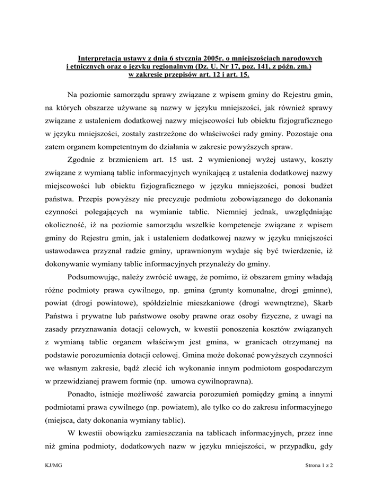 Interpretacja ustawy z dnia 6 stycznia 2005r. o mniejszościach narodowych i etnicznych oraz o języku regionalnym (Dz. U. Nr 17, poz. 141, z późn. zm.) w zakresie przepisów art. 12 i art. 15. Na poziomie samorządu sprawy związane z wpisem gminy do Rejestru gmin, na których obszarze używane są nazwy w języku mniejszości, jak również sprawy związane z ustaleniem dodatkowej nazwy miejscowości lub obiektu fizjograficznego w języku mniejszości, zostały zastrzeżone do właściwości rady gminy. Pozostaje ona zatem organem kompetentnym do działania w zakresie powyższych spraw. Zgodnie z brzmieniem art. 15 ust. 2 wymienionej wyżej ustawy, koszty związane z wymianą tablic informacyjnych wynikającą z ustalenia dodatkowej nazwy miejscowości lub obiektu fizjograficznego w języku mniejszości, ponosi budżet państwa. Przepis powyższy nie precyzuje podmiotu zobowiązanego do dokonania czynności polegających na wymianie tablic. Niemniej jednak, uwzględniając okoliczność, iż na poziomie samorządu wszelkie kompetencje związane z wpisem gminy do Rejestru gmin, jak i ustaleniem dodatkowej nazwy w języku mniejszości ustawodawca przyznał radzie gminy, uprawnionym wydaje się być twierdzenie, iż dokonywanie wymiany tablic informacyjnych przynależy do gminy. Podsumowując, należy zwrócić uwagę, że pomimo, iż obszarem gminy władają różne podmioty prawa cywilnego, np. gmina (grunty komunalne, drogi gminne), powiat (drogi powiatowe), spółdzielnie mieszkaniowe (drogi wewnętrzne), Skarb Państwa i prywatne lub państwowe osoby prawne oraz osoby fizyczne, z uwagi na zasady przyznawania dotacji celowych, w kwestii ponoszenia kosztów związanych z wymianą tablic organem właściwym jest gmina, w granicach otrzymanej na podstawie porozumienia dotacji celowej. Gmina może dokonać powyższych czynności we własnym zakresie, bądź zlecić ich wykonanie innym podmiotom gospodarczym w przewidzianej prawem formie (np. umowa cywilnoprawna). Ponadto, istnieje możliwość zawarcia porozumień pomiędzy gminą a innymi podmiotami prawa cywilnego (np. powiatem), ale tylko co do zakresu informacyjnego (miejsca, daty dokonania wymiany tablic). W kwestii obowiązku zamieszczania na tablicach informacyjnych, przez inne niż gmina podmioty, dodatkowych nazw w języku mniejszości, w przypadku, gdy KJ/MG Strona 1 z 2 gmina została wpisana do rejestru gmin, na obszarze których są używane nazwy w języku mniejszości, wskazać należy, iż ustawa o mniejszościach narodowych i etnicznych oraz o języku regionalnym w żadnym ze swych postanowień nie ustanawia obowiązku używania dodatkowych tradycyjnych nazw miejscowości i obiektów fizjograficznych w języku mniejszości w przypadku wpisania danej gminy do prowadzonego przez ministra właściwego do spraw religijnych oraz mniejszości narodowych i etnicznych Rejestru gmin. Ustawa stanowi bowiem jedynie o możliwości (uprawnieniu) stosowania na obszarze gmin wpisanych do wymienionego rejestru dodatkowych nazw w języku mniejszości (np. art. 12 ust. 1, 2, 4 ustawy). Powyższe wydaje się potwierdzać literalnie brzmienie art. 12 ust. 4 ustawy, zgodnie z którym dodatkowe nazwy w języku mniejszości mogą być wprowadzone na terenie całej gminy lub w poszczególnych miejscowościach. Warunkiem ustalenia i stosowania nazwy w języku mniejszości jest wpis danej gminy do Rejestru gmin, na których obszarze używane są nazwy w języku mniejszości, co wynika z art. 12 ust. 1. KJ/MG Strona 2 z 2