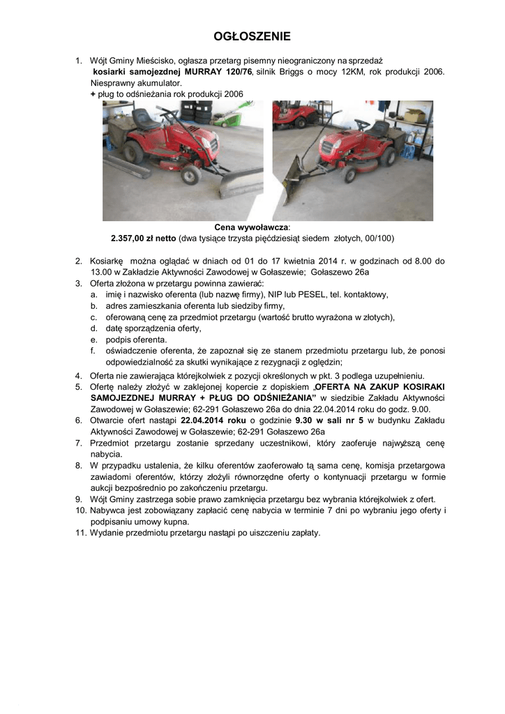 OGŁOSZENIE 1. Wójt Gminy Mieścisko, ogłasza przetarg pisemny nieograniczony na sprzedaż kosiarki samojezdnej MURRAY 120/76, silnik Briggs o mocy 12KM, rok produkcji 2006. Niesprawny akumulator. + pług to odśnieżania rok produkcji 2006 Cena wywoławcza: 2.357,00 zł netto (dwa tysiące trzysta pięćdziesiąt siedem złotych, 00/100) 2. Kosiarkę można oglądać w dniach od 01 do 17 kwietnia 2014 r. w godzinach od 8.00 do 13.00 w Zakładzie Aktywności Zawodowej w Gołaszewie; Gołaszewo 26a 3. Oferta złożona w przetargu powinna zawierać: a. imię i nazwisko oferenta (lub nazwę firmy), NIP lub PESEL, tel. kontaktowy, b. adres zamieszkania oferenta lub siedziby firmy, c. oferowaną cenę za przedmiot przetargu (wartość brutto wyrażona w złotych), d. datę sporządzenia oferty, e. podpis oferenta. f. oświadczenie oferenta, że zapoznał się ze stanem przedmiotu przetargu lub, że ponosi odpowiedzialność za skutki wynikające z rezygnacji z oględzin; 4. Oferta nie zawierająca którejkolwiek z pozycji określonych w pkt. 3 podlega uzupełnieniu. 5. Ofertę należy złożyć w zaklejonej kopercie z dopiskiem „OFERTA NA ZAKUP KOSIRAKI SAMOJEZDNEJ MURRAY + PŁUG DO ODŚNIEŻANIA” w siedzibie Zakładu Aktywności Zawodowej w Gołaszewie; 62-291 Gołaszewo 26a do dnia 22.04.2014 roku do godz. 9.00. 6. Otwarcie ofert nastąpi 22.04.2014 roku o godzinie 9.30 w sali nr 5 w budynku Zakładu Aktywności Zawodowej w Gołaszewie; 62-291 Gołaszewo 26a 7. Przedmiot przetargu zostanie sprzedany uczestnikowi, który zaoferuje najwyższą cenę nabycia. 8. W przypadku ustalenia, że kilku oferentów zaoferowało tą sama cenę, komisja przetargowa zawiadomi oferentów, którzy złożyli równorzędne oferty o kontynuacji przetargu w formie aukcji bezpośrednio po zakończeniu przetargu. 9. Wójt Gminy zastrzega sobie prawo zamknięcia przetargu bez wybrania którejkolwiek z ofert. 10. Nabywca jest zobowiązany zapłacić cenę nabycia w terminie 7 dni po wybraniu jego oferty i podpisaniu umowy kupna. 11. Wydanie przedmiotu przetargu nastąpi po uiszczeniu zapłaty.