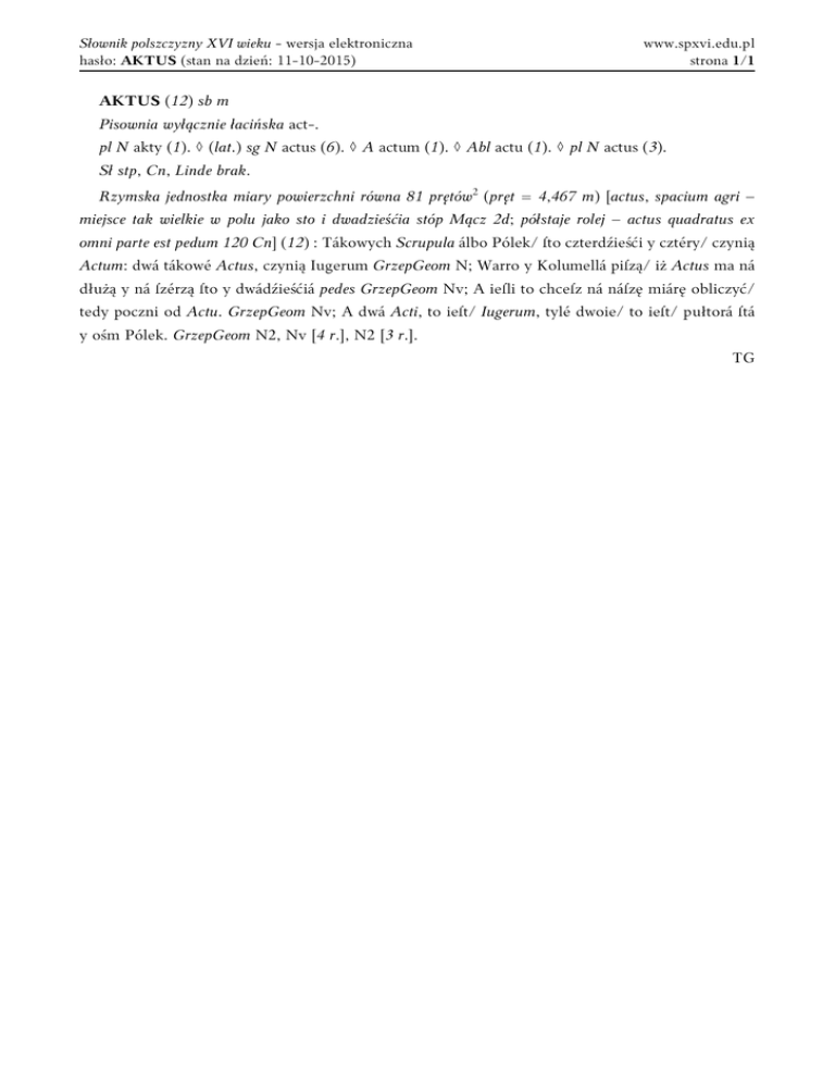 Słownik polszczyzny XVI wieku - wersja elektroniczna hasło: AKTUS (stan na dzień: 11-10-2015) www.spxvi.edu.pl strona 1/1 AKTUS (12) sb m Pisownia wyłącznie łacińska act-. pl N akty (1). ◊ (lat.) sg N actus (6). ◊ A actum (1). ◊ Abl actu (1). ◊ pl N actus (3). Sł stp, Cn, Linde brak. Rzymska jednostka miary powierzchni równa 81 prętów2 (pręt = 4,467 m) [actus, spacium agri – miejsce tak wielkie w polu jako sto i dwadzieśćia stóp Mącz 2d; półstaje rolej – actus quadratus ex omni parte est pedum 120 Cn] (12) : Tákowych Scrupula álbo Pólek/ ſto czterdźieśći y cztéry/ czynią Actum: dwá tákowé Actus, czynią Iugerum GrzepGeom N; Warro y Kolumellá piſzą/ iż Actus ma ná dłużą y ná ſzérzą ſto y dwádźieśćiá pedes GrzepGeom Nv; A ieſli to chceſz ná náſzę miárę obliczyć/ tedy poczni od Actu. GrzepGeom Nv; A dwá Acti, to ieſt/ Iugerum, tylé dwoie/ to ieſt/ pułtorá ſtá y ośm Pólek. GrzepGeom N2, Nv [4 r.], N2 [3 r.]. TG