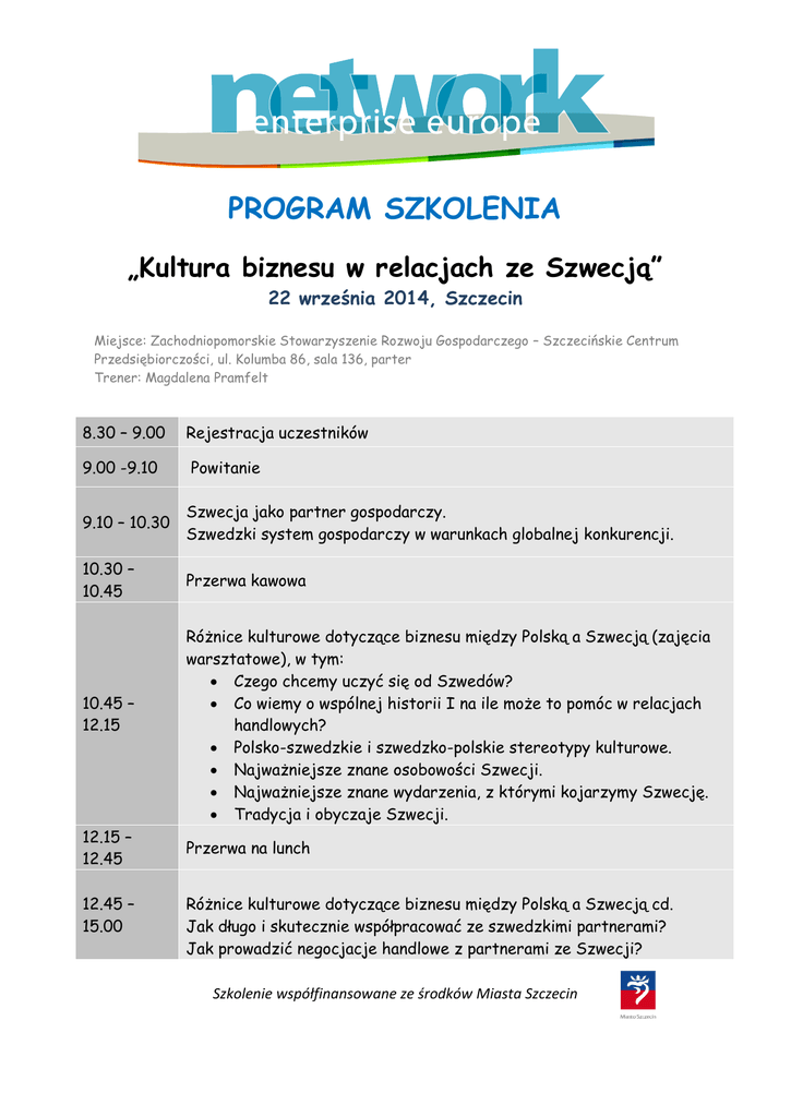 PROGRAM SZKOLENIA „Kultura biznesu w relacjach ze Szwecją” 22 września 2014, Szczecin Miejsce: Zachodniopomorskie Stowarzyszenie Rozwoju Gospodarczego – Szczecińskie Centrum Przedsiębiorczości, ul. Kolumba 86, sala 136, parter Trener: Magdalena Pramfelt 8.30 – 9.00 Rejestracja uczestników 9.00 -9.10 Powitanie 9.10 – 10.30 Szwecja jako partner gospodarczy. Szwedzki system gospodarczy w warunkach globalnej konkurencji. 10.30 – 10.45 Przerwa kawowa 10.45 – 12.15 12.15 – 12.45 12.45 – 15.00 Różnice kulturowe dotyczące biznesu między Polską a Szwecją (zajęcia warsztatowe), w tym: Czego chcemy uczyć się od Szwedów? Co wiemy o wspólnej historii I na ile może to pomóc w relacjach handlowych? Polsko-szwedzkie i szwedzko-polskie stereotypy kulturowe. Najważniejsze znane osobowości Szwecji. Najważniejsze znane wydarzenia, z którymi kojarzymy Szwecję. Tradycja i obyczaje Szwecji. Przerwa na lunch Różnice kulturowe dotyczące biznesu między Polską a Szwecją cd. Jak długo i skutecznie współpracować ze szwedzkimi partnerami? Jak prowadzić negocjacje handlowe z partnerami ze Szwecji? Szkolenie współfinansowane ze środków Miasta Szczecin