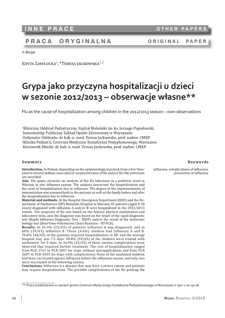 INNE PRACE PRACA ORYGINALNA O T H E R PA P E R S ORIGINAL PA P E R © Borgis Edyta Zawłocka1, *Teresa Jackowska1, 2 Grypa jako przyczyna hospitalizacji u dzieci w sezonie 2012/2013 – obserwacje własne** Flu as the cause of hospitalization among children in the 2012/2013 season – own observations Kliniczny Oddział Pediatryczny, Szpital Bielański im. ks. Jerzego Popiełuszki, Samodzielny Publiczny Zakład Opieki Zdrowotnej w Warszawie Ordynator Oddziału: dr hab. n. med. Teresa Jackowska, prof. nadzw. CMKP 2 Klinika Pediatrii, Centrum Medyczne Kształcenia Podyplomowego, Warszawa Kierownik Kliniki: dr hab. n. med. Teresa Jackowska, prof. nadzw. CMKP 1 Summary Introduction. In Poland, depending on the epidemiological period, from a few thousand to several million cases and/or suspected cases of flu and/or flu-like infections are recorded. Aim. The paper presents an analysis of the flu infections in a pediatric ward in Warsaw, in one influenza season. The analysis concerned the hospitalization and the costs of hospitalization due to influenza. The degree of the implementation of immunization was assessed both in the patients as well as the family before and after the hospitalization due to influenza. Material and methods. At the Hospital Emergency Department (HED) and the Department of Paediatrics (DP) Bielański Hospital in Warsaw, 65 patients (aged 0-18 years) diagnosed with influenza A and/or B were hospitalized in the 2012/2013 season. The suspicion of flu was based on the history, physical examination and laboratory tests, and, the diagnosis was based on the result of the rapid diagnostic test (Rapid Influenza Diagnostic Test – RIDT) and/or the result of the molecular biology test (Real-Time-Polymerase Chain Reaction – RT-PCR). Results. In 35.4% (23/65) of patients influenza A was diagnosed, and in 60% (39/65) influenza B. Three (4.6%) children had influenza A and B. 70.8% (46/65) of the patients required hospitalization in DP, and the average hospital stay was 7.5 days. 90.8% (59/65) of the children were treated with oseltamivir for 5 days. In 36.9% (24/65) of them various complications were observed that required further treatment. The cost of hospitalization ranged from PLN 1761 to PLN 2057 for stays without uncomplications and from PLN 2607 to PLN 4595 for stays with complications. None of the examined children had been vaccinated against influenza before the influenza season, and only two were vaccinated in the following season. Conclusions. Influenza is a disease that may have a severe course and patients may require hospitalization. The possible complications of the flu prolong the Key wo rd s influenza, complications of influenza, prevention of influenza ** Praca zrealizowana w ramach grantu Centrum Medycznego Kształcenia Podyplomowego w Warszawie nr 501-1-20-19-16 98 Nowa Pediatria 3/2016 Grypa jako przyczyna hospitalizacji u dzieci w sezonie 2012/2013 – obserwacje własne time of the treatment and result in additional costs. There are effective medicines against the flu available, but the best form of preventing influenza are annual vaccinations. In the group studied, in spite of the severe influenza course, requiring hospitalization, the parents’ attitudes to vaccinations have not changed and remained negative. Wstęp Grypa jest chorobą zakaźną wywoływaną przez wirusy z rodziny Orthomyxoviridae. Wyróżnia się trzy typy wirusa grypy: A, B i C (1-3). W Polsce, w zależności od okresu epidemiologicznego notuje się od kilku tysięcy do kilku milionów zachorowań lub podejrzeń zachorowań na grypę i/lub infekcje grypopodobne. Grypa jest również przyczyną zgonów – w sezonie 2012/2013 zarejestrowano 121 zgonów z powodu grypy, w tym 6 u dzieci do 14. roku życia. W województwie mazowieckim w sezonie 2012/2013 zgłoszono ponad 458 tys. zachorowań lub podejrzeń zachorowań na grypę i/lub infekcje grypopodobne, w tym ponad 221 tys. dotyczyło dzieci do 14. roku życia (4). Szacuje się, że dane te mogą być zaniżone ze względu na niedoskonałości systemu monitorowania przypadków chorób zakaźnych oraz częste niedopełnianie przez lekarzy obowiązku zgłaszania zachorowań i podejrzeń o zachorowaniu do Państwowej Inspekcji Sanitarnej (PIS). Do zakażenia wirusem grypy dochodzi drogą kropelkową, kontaktową i aerozolową. Średni czas inkubacji wynosi ok. 1-2 dni (1-4 dni) i zależy od statusu immunologicznego i wieku pacjenta (5, 6). Objawy grypy to przede wszystkim: gorączka, ból głowy, gardła, kaszel, bóle mięśniowe, złe samopoczucie, nudności czy wymioty. Ostre objawy choroby ustępują w ciągu kilku dni, natomiast kaszel i złe samopoczucie mogą trwać nawet do 2 tygodni (1-3). Leczenie grypy jest głównie objawowe. W uzasadnionych przypadkach można zastosować leczenie przyczynowe, podając leki przeciwwirusowe, inhibitory neuraminidazy, takie jak oseltamiwir czy zanamiwir, wykazujące wysoką aktywność wobec wirusa A i B i niewielkie działania niepożądane (7-13). W przebiegu grypy może dojść do nadkażeń bakteryjnych spowodowanych głównie przez pneumokoki, ale także przez meningokoki i gronkowce. Przechorowanie grypy może wiązać się z licznymi powikłaniami: –– z układu oddechowego: pierwotne zapalenie płuc i oskrzeli, wtórne bakteryjne zapalenia płuc, zapalenia oskrzelików, zapalenie zatok, zespół ostrej niewydolności oddechowej, zaostrzenie astmy czy przewlekłej obturacyjnej choroby płuc (POChP), –– z układu nerwowego: nasilenie częstości napadów padaczkowych, choroby naczyniowe mózgu, toksyczna encefalopatia, poprzeczne zapalenie rdzenia kręgowego, poinfekcyjne zapalenie mózgu i opon mózgowych, zapalenie móżdżku, choroba Parkinsona, zespół Reye’a, wylew podpajęczynówkowy, śpiączkowe zapalenie mózgu, zespół Guillaina-Barrégo, –– psychicznymi: ostra psychoza ze słuchowymi lub wzrokowymi halucynacjami, schizofrenia, –– kardiologicznymi: zapalenie mięś