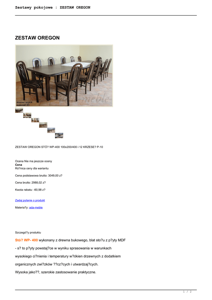Zestawy pokojowe : ZESTAW OREGON ZESTAW OREGON ZESTAW OREGON STÓ? WP-400 100x200/400 i 12 KRZESE? P-10 Ocena Nie ma jeszcze oceny Cena Ró?nica ceny dla wariantu Cena podstawowa brutto: 3049,00 z? Cena brutto: 2988,02 z? Kwota rabatu: -60,98 z? Zadaj pytanie o produkt Materia?y: ada-meble Szczegó?y produktu Stó? WP- 400 wykonany z drewna bukowego, blat sto?u z p?yty MDF - s? to p?yty powstaj?ce w wyniku sprasowania w warunkach wysokiego ci?nienia i temperatury w?ókien drzewnych z dodatkiem organicznych zwi?zków ??cz?cych i utwardzaj?cych. Wysoka jako??, szerokie zastosowanie praktyczne. 1 / 2 Zestawy pokojowe : ZESTAW OREGON Blat PROSTOK?T ZAOKR?GLONY OKLEINA NATURALNA rozk?adany. Podstawa wykonana z drewna bukowego. Wymiary sto?u: d?ugo?? sto?u 200 cm /po roz?o?eniu 400 x 100/; 4 wk?ady po 50 cm; szeroko?? blatu 100 / blat z MDF na ?o?yskowych prowadnicach; wysoko?? sto?u 76 cm; mo?liwo?? roz?o?enia sto?u: 2,0m; 2,5m; 3,0m; 3,5m; 4,0m. Krzes?o P-10 wykonane z drewna bukowego wysokogatunkowej bejcy i lakieru. Istnieje mo?liwo?? wyboru tkaniny obiciowej. Wymiary krzes?a: wysoko?? krzes?a 100 cm; szeroko?? siedziska krzes?a 43 cm; g??boko?? siedziska krzes?a 40 cm; wysoko?? siedziska krzes?a 48 cm Recenzje Nikt jeszcze nie ocenia? tego produktu. 2 / 2 Powered by TCPDF (www.tcpdf.org)