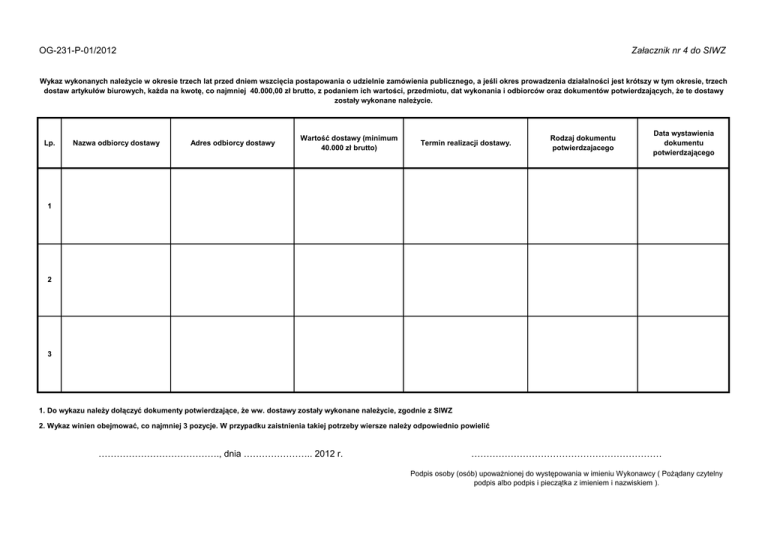 OG-231-P-01/2012 Załacznik nr 4 do SIWZ Wykaz wykonanych naleŜycie w okresie trzech lat przed dniem wszcięcia postapowania o udzielnie zamówienia publicznego, a jeśli okres prowadzenia działalności jest krótszy w tym okresie, trzech dostaw artykułów biurowych, kaŜda na kwotę, co najmniej 40.000,00 zł brutto, z podaniem ich wartości, przedmiotu, dat wykonania i odbiorców oraz dokumentów potwierdzających, Ŝe te dostawy zostały wykonane naleŜycie. Lp. Nazwa odbiorcy dostawy Adres odbiorcy dostawy Wartość dostawy (minimum 40.000 zł brutto) Termin realizacji dostawy. Rodzaj dokumentu potwierdzajacego Data wystawienia dokumentu potwierdzającego 1 2 3 1. Do wykazu naleŜy dołączyć dokumenty potwierdzające, Ŝe ww. dostawy zostały wykonane naleŜycie, zgodnie z SIWZ 2. Wykaz winien obejmować, co najmniej 3 pozycje. W przypadku zaistnienia takiej potrzeby wiersze naleŜy odpowiednio powielić …………………………………., dnia ………………….. 2012 r. ……………………………………………………… Podpis osoby (osób) upowaŜnionej do występowania w imieniu Wykonawcy ( PoŜądany czytelny podpis albo podpis i pieczątka z imieniem i nazwiskiem ).